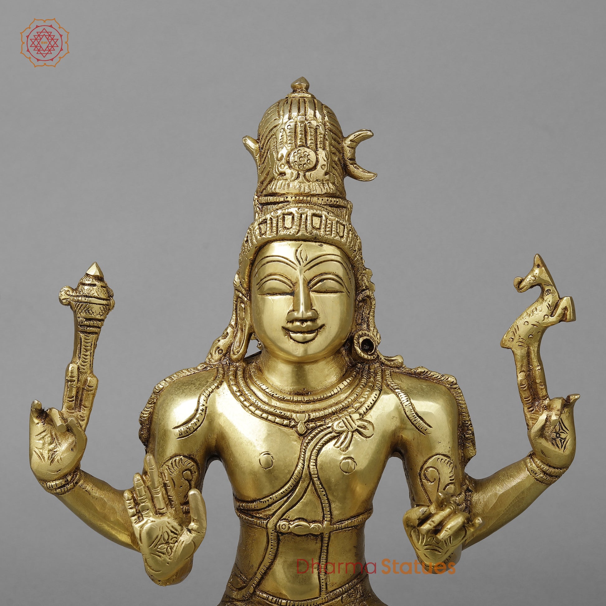 Brass Pashupatinath Idol, gracefully seated on a pedestal, symbolizes divine protection, spiritual strength, and wisdom. The golden finish enhances its majestic aura, making this 14.5-inch sculpture a meaningful addition to any home, temple, or sacred space. Meticulously crafted with intricate detailing, it reflects the powerful and compassionate presence of Lord Pashupatinath.