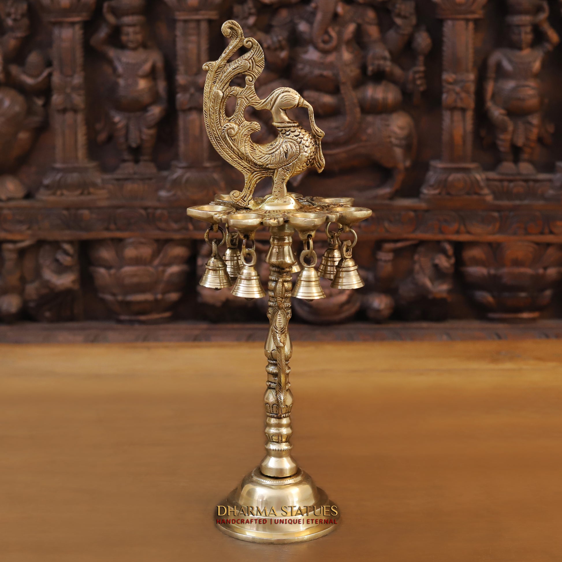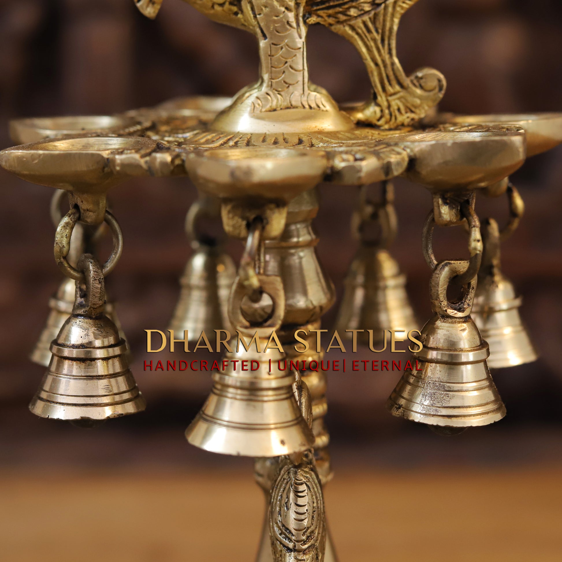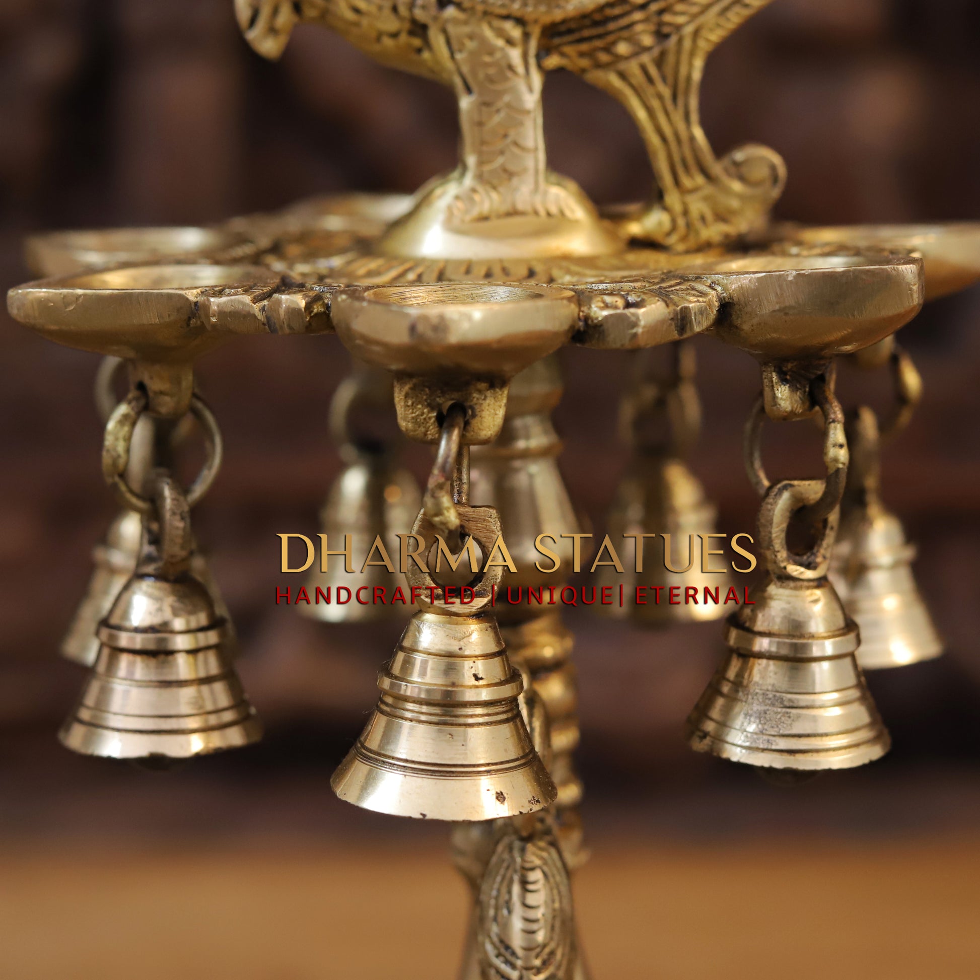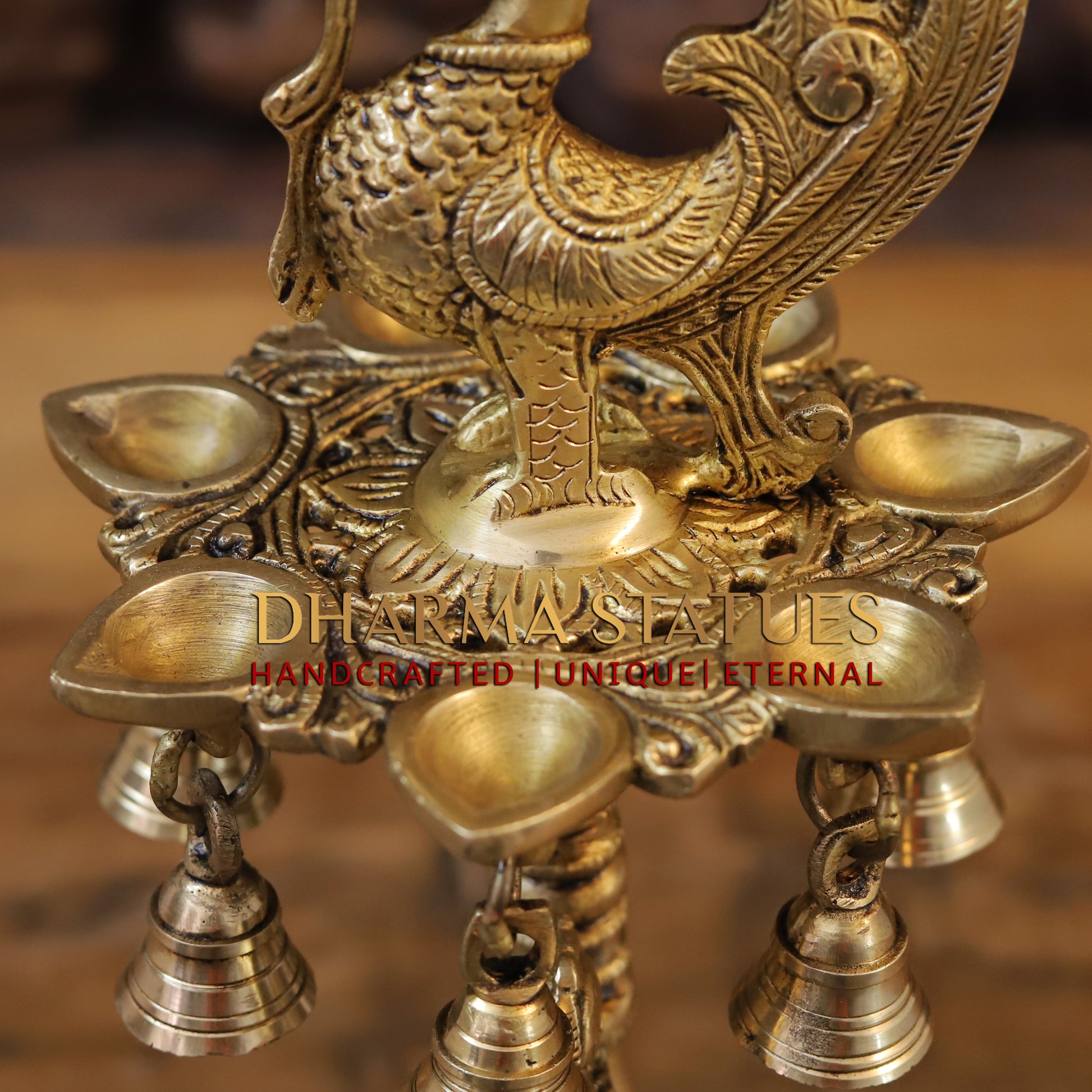 Brass Peacock Diya, with Bells, Fine Golden Finish 16.5"