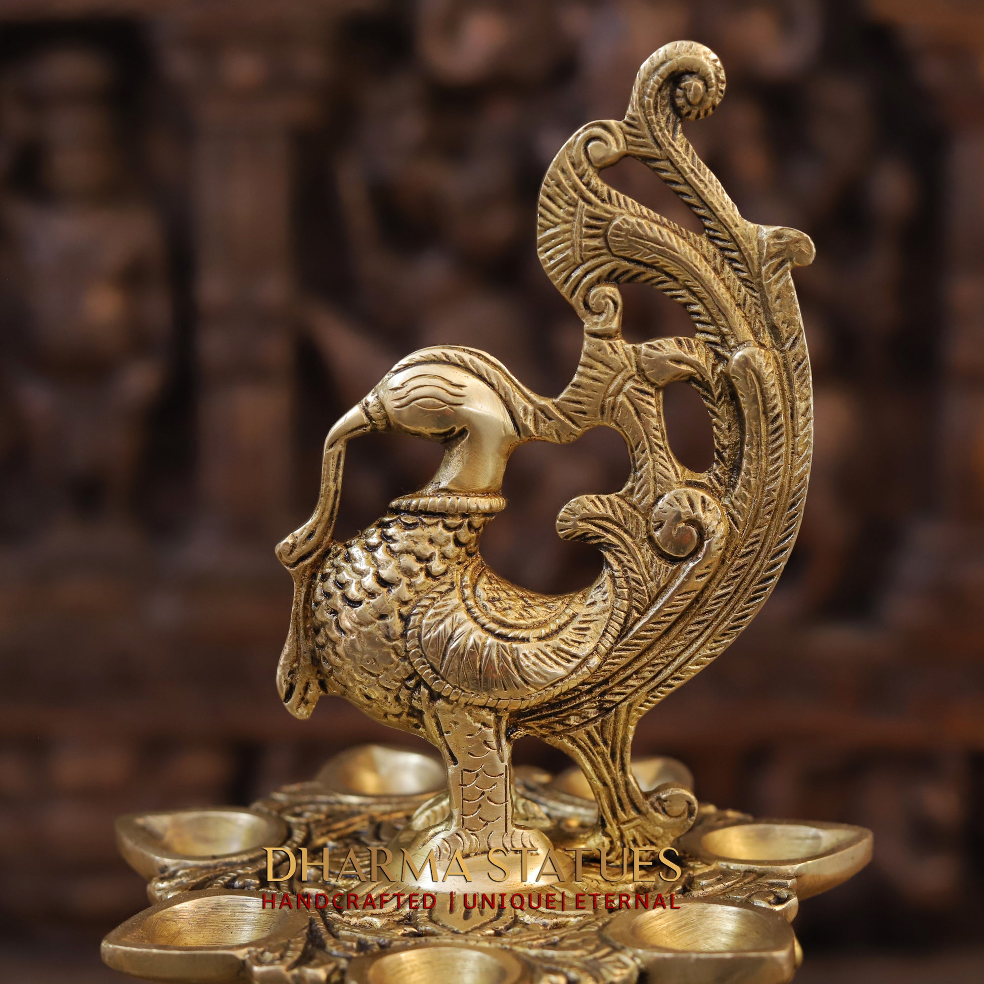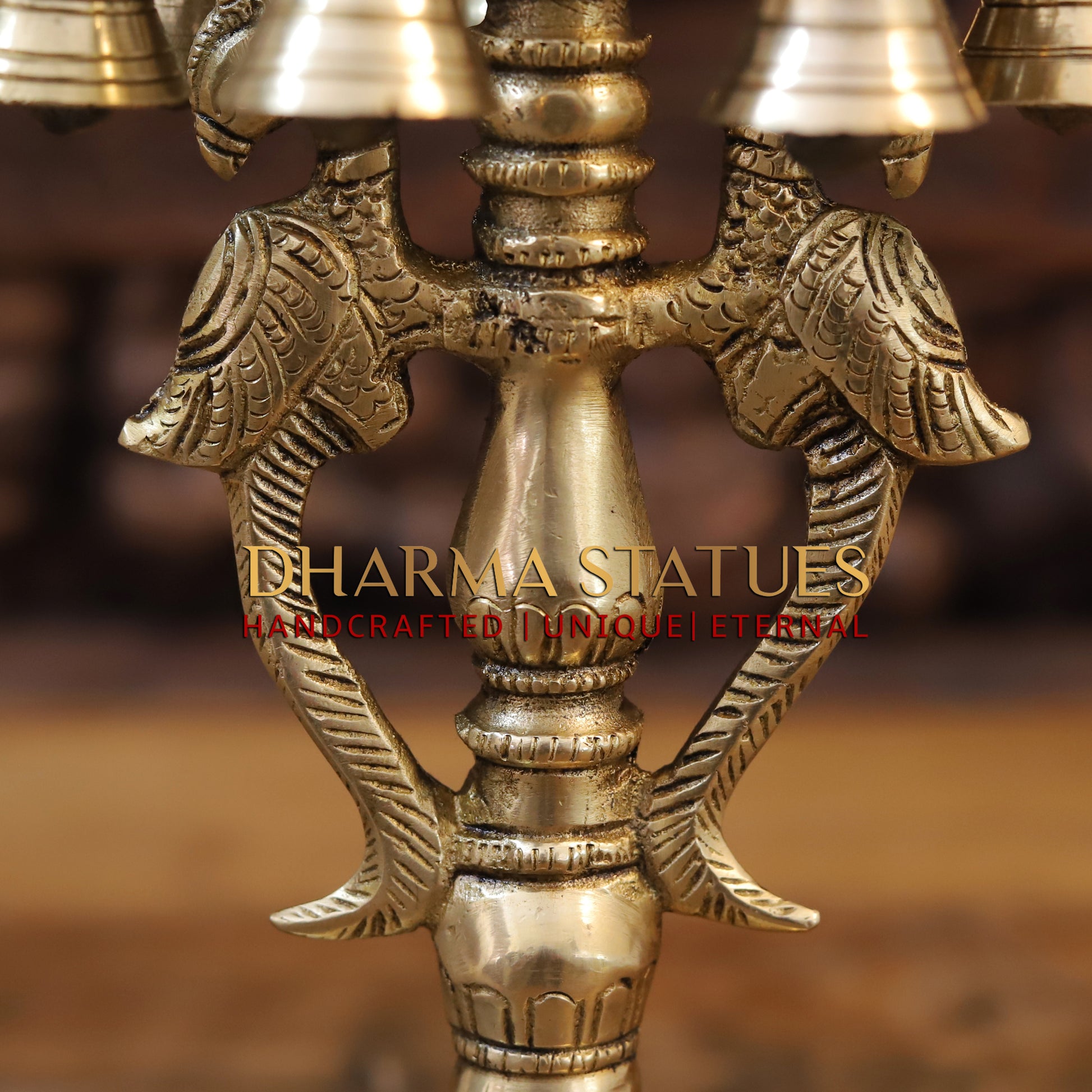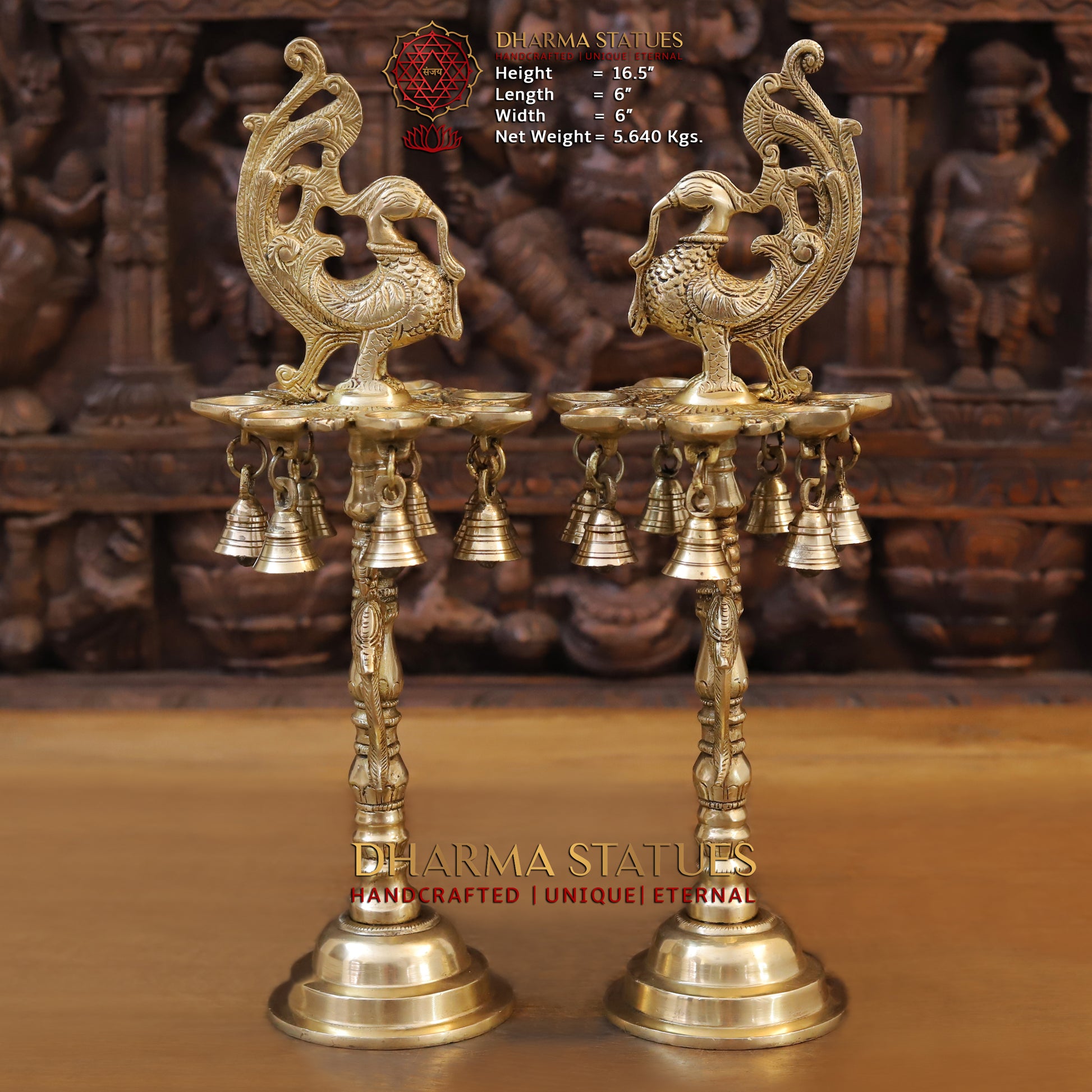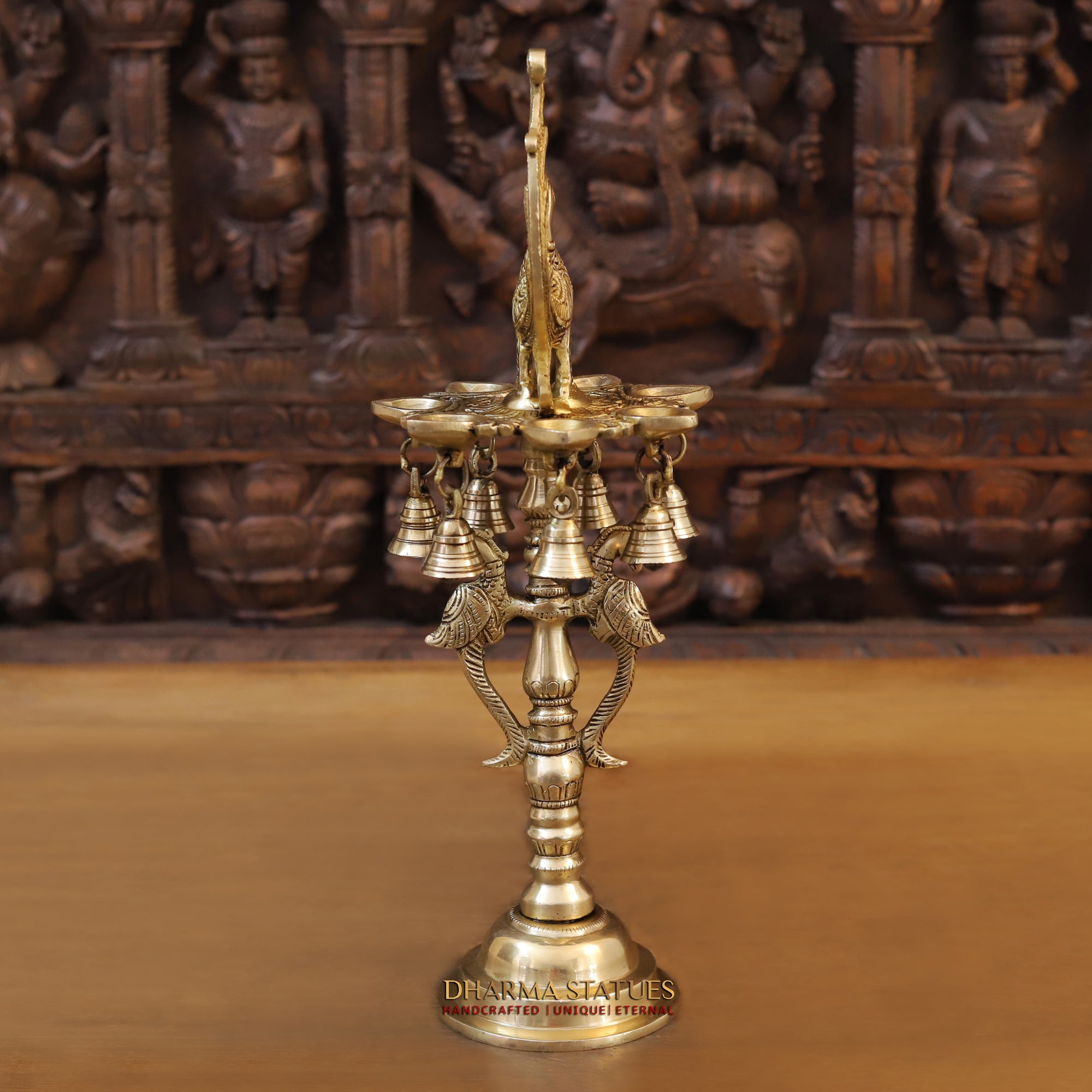 Brass Peacock Diya, with Bells, Fine Golden Finish 16.5"