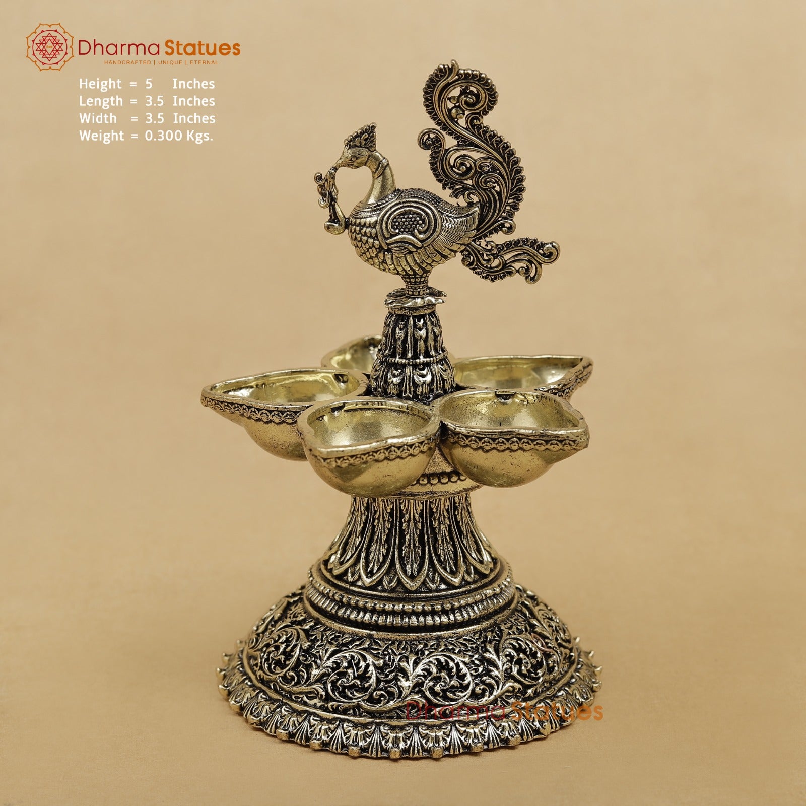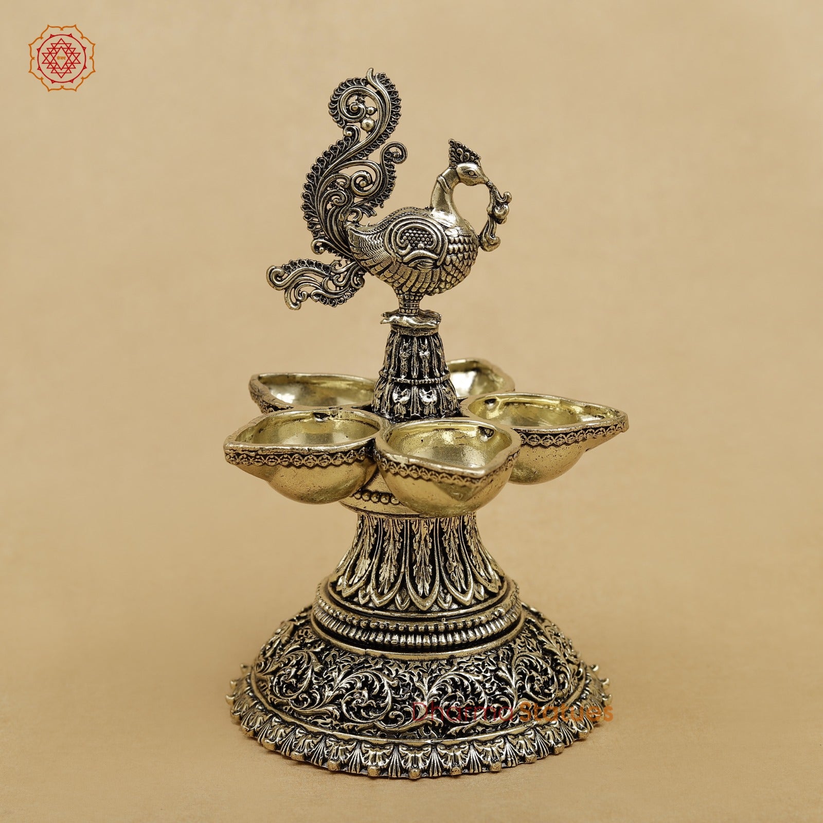 A beautifully designed brass peacock lamp with multiple diya holders, featuring intricate traditional detailing. It symbolizes light, purity, and prosperity, making it perfect for home temples, festive décor, and spiritual rituals.