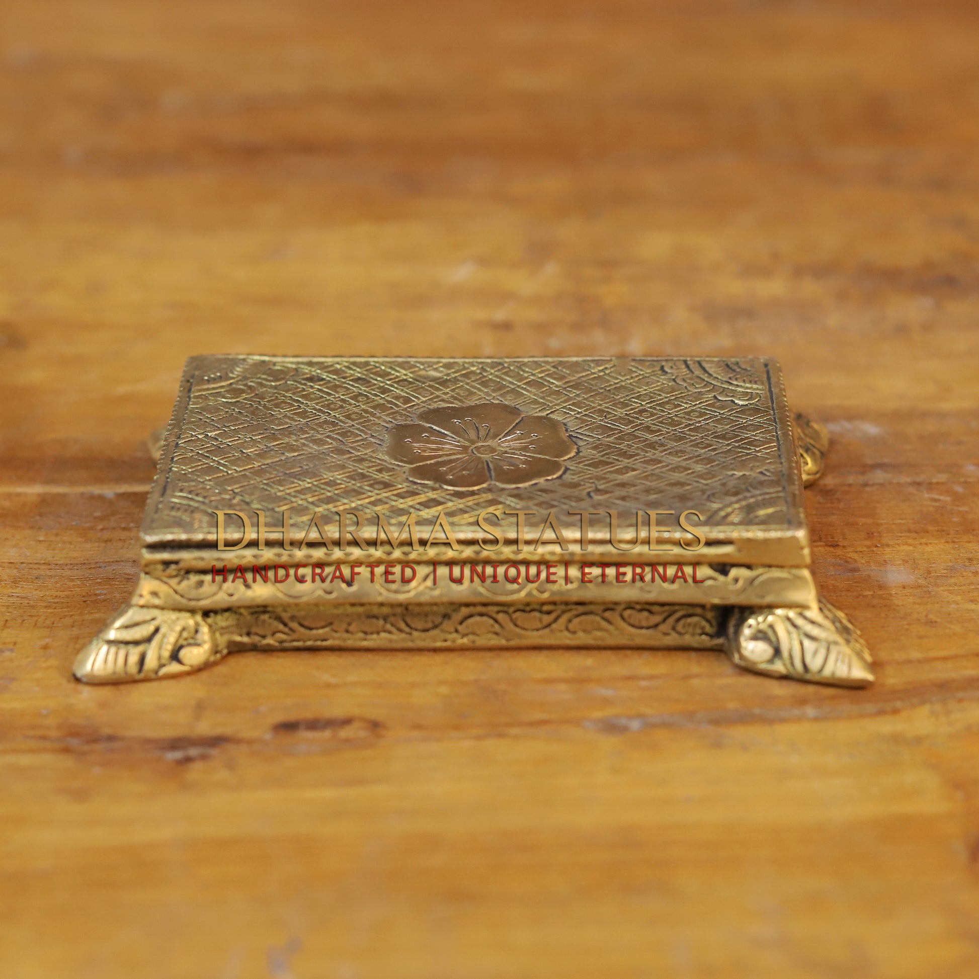 Brass Pooja Chowki, Lotus Engraved, Fine Golden Finish 1.5"