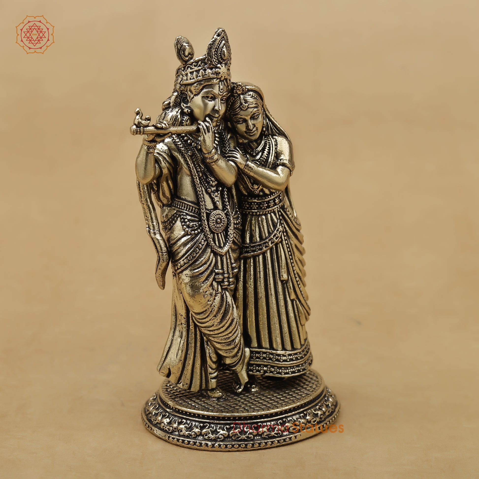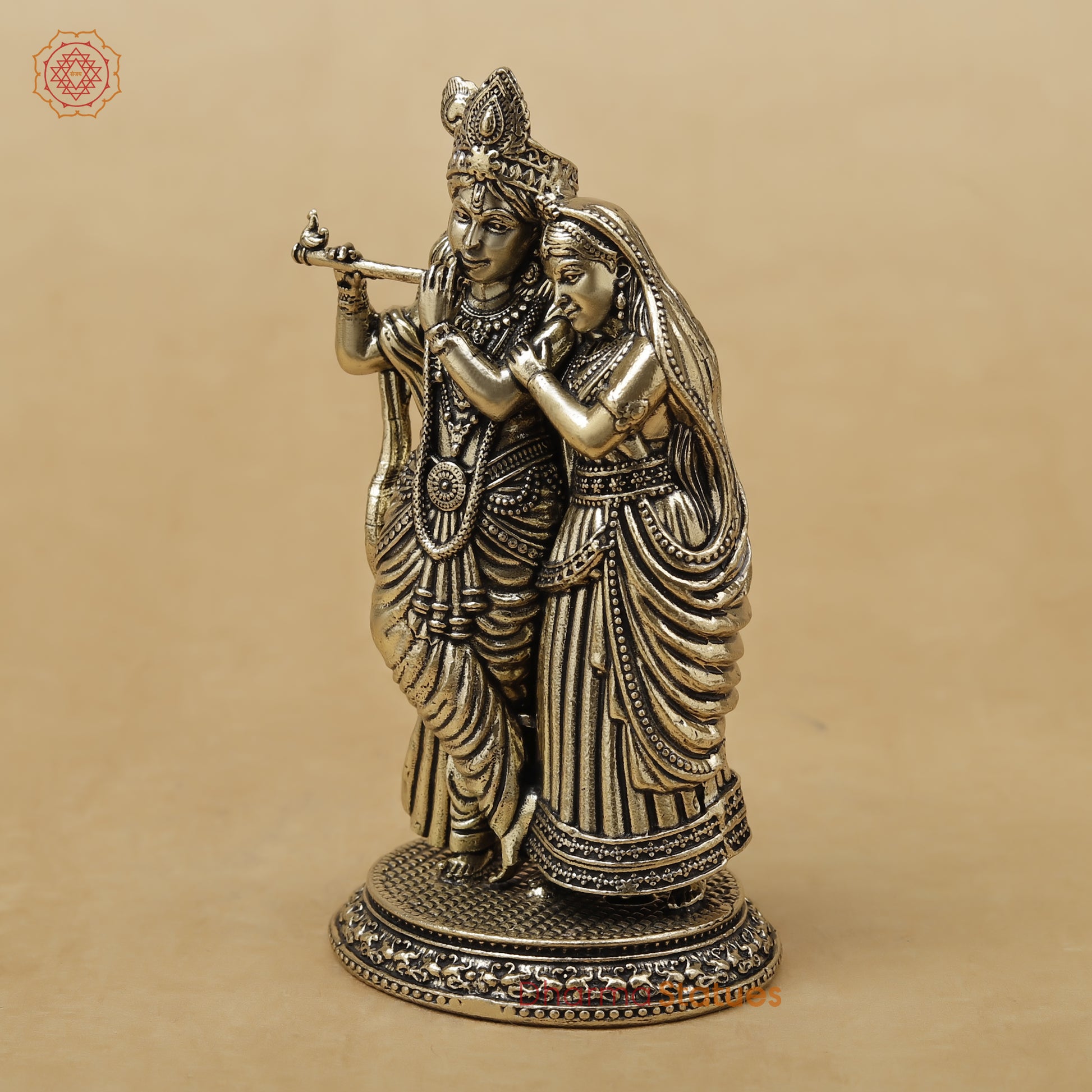 This 4.5-inch brass Radha Krishna idol beautifully captures their eternal love, with Krishna playing the flute and Radha lovingly beside him. Intricately detailed and handcrafted, it radiates peace, devotion, and harmony. Perfect for home décor, gifting, or mandir spaces, symbolizing divine companionship and bliss.