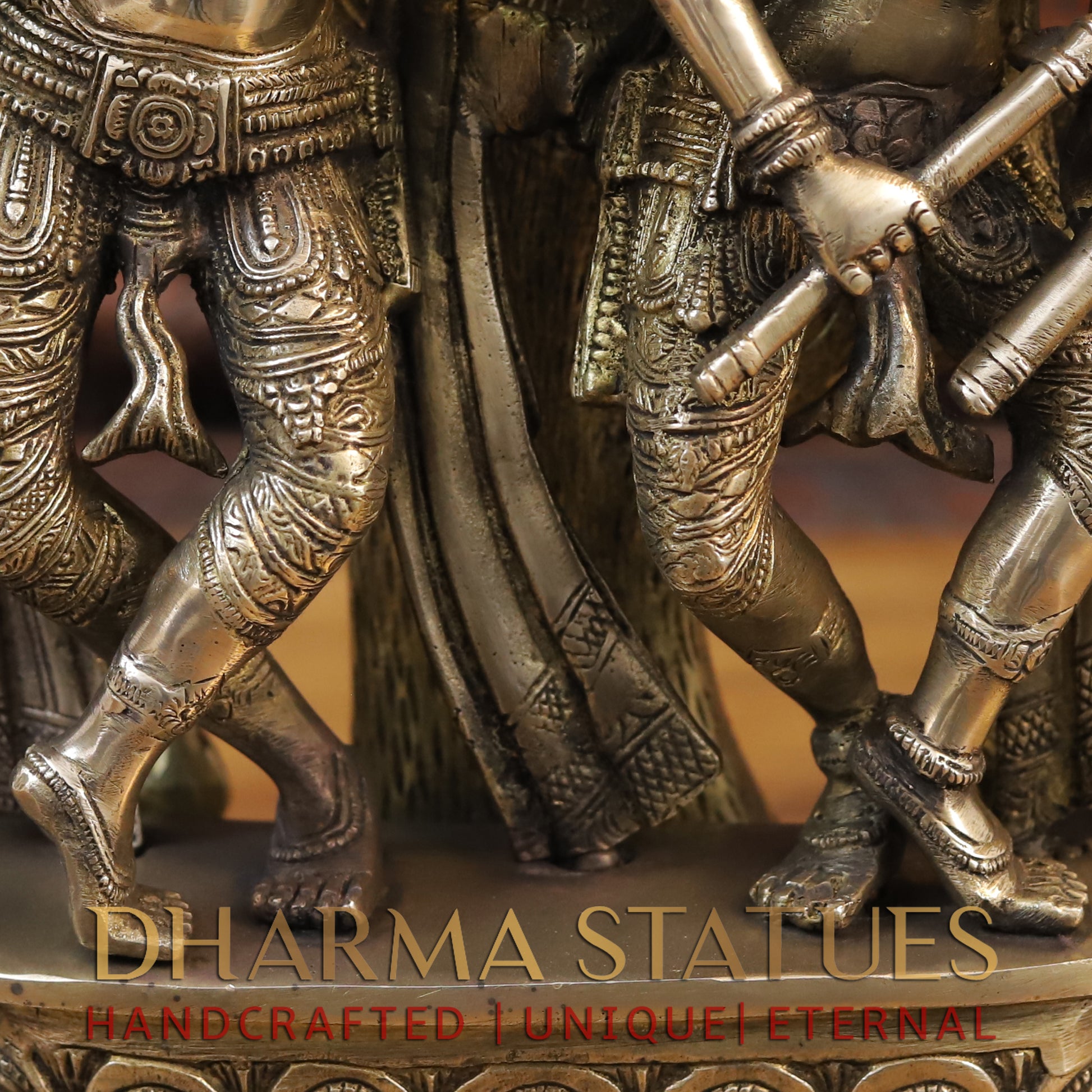 This exquisite Brass statue of Krishna and Radha beautifully captures the essence of divine love and joy. Depicted together under a lush mango tree, the scene comes alive with Krishna playing his flute, while Radha dances gracefully beside him, embodying the spirit of devotion and celebration.