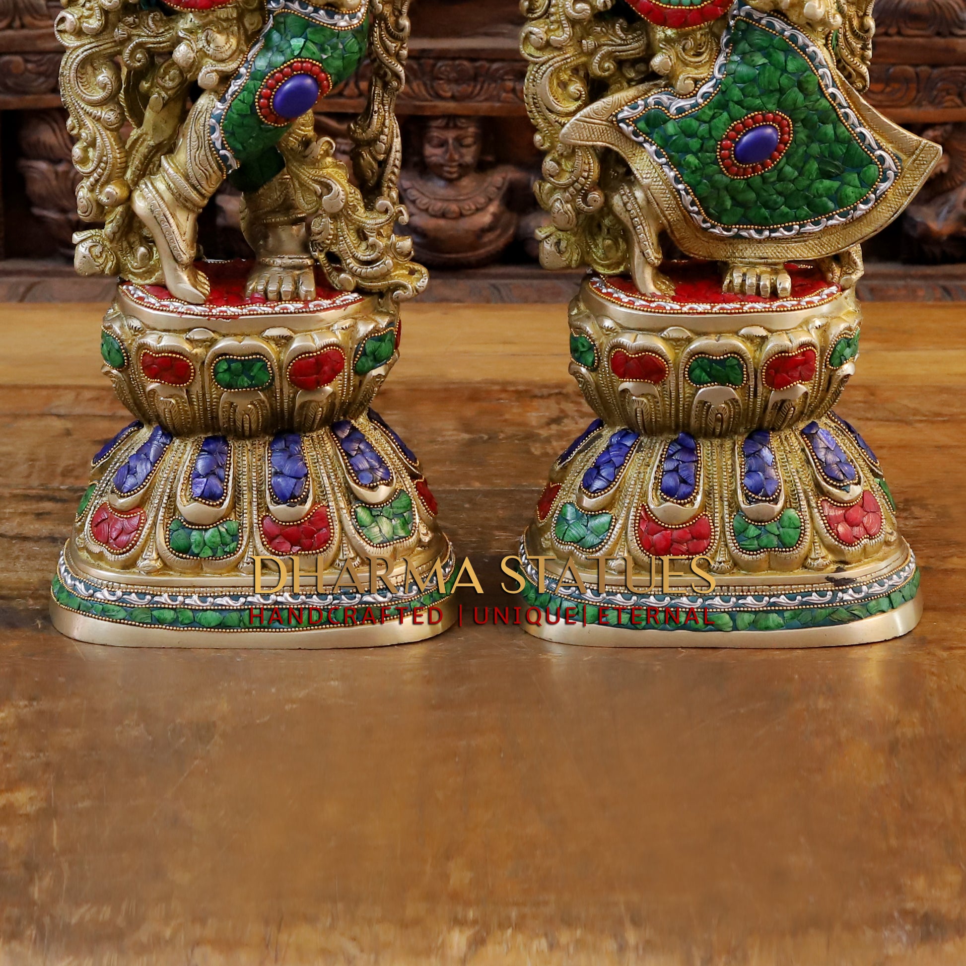 Brass Radha & Krishna Playing Flute, Golden & Stonework, 30"