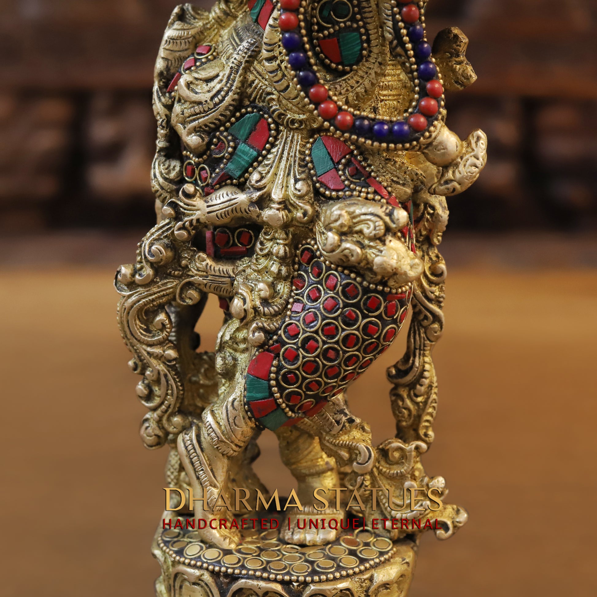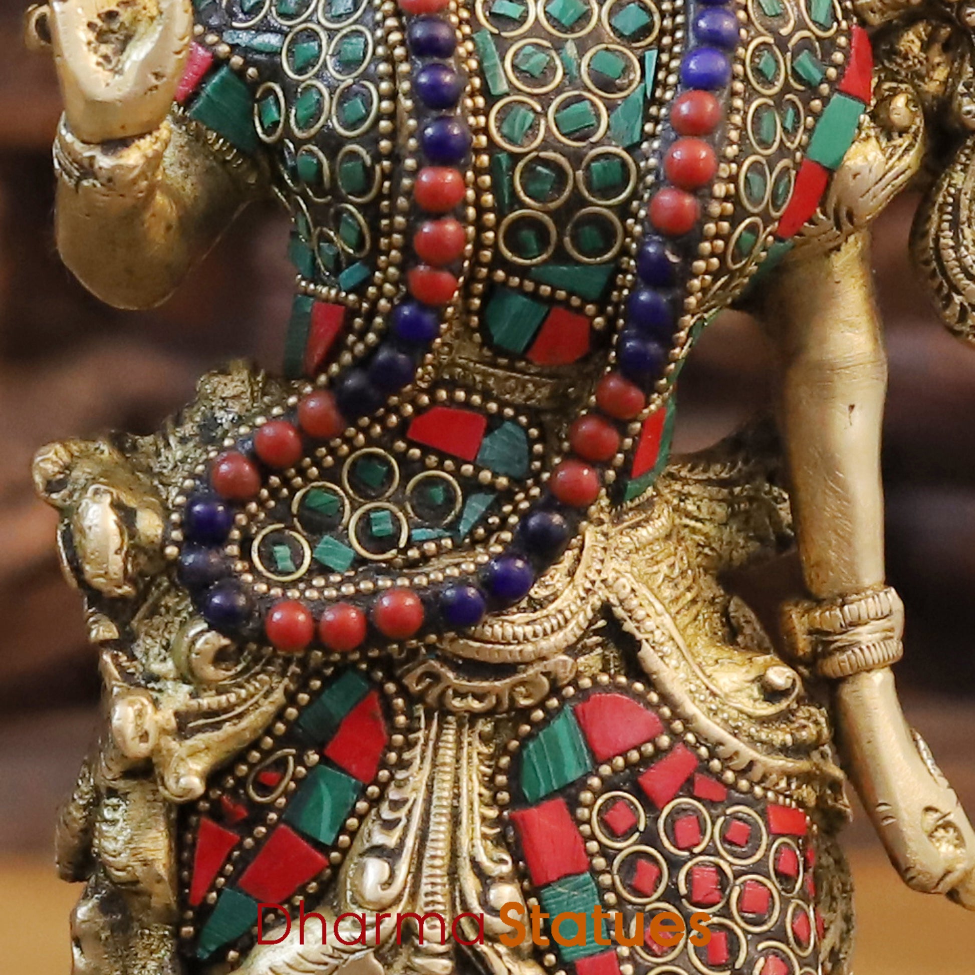 Expertly crafted in brass, this Radha & Krishna figurine features intricate stonework and a stunning golden finish. With their flutes in hand, they embody the divine love and harmony of Hindu mythology. Standing at 16.5", this piece adds a touch of elegance and spirituality to any space.
