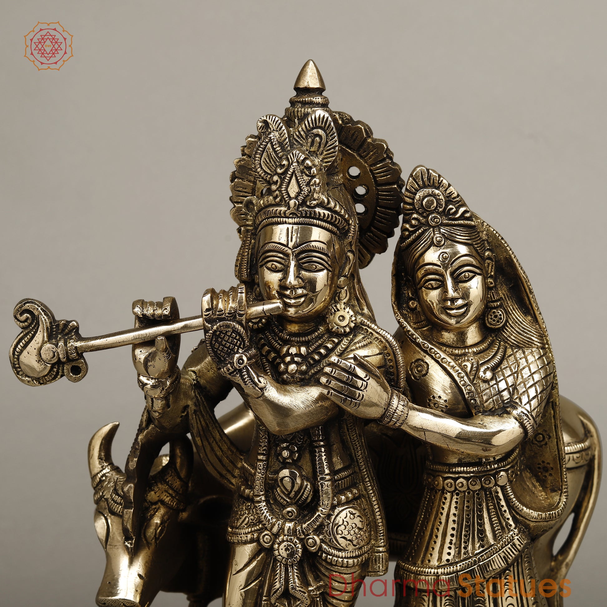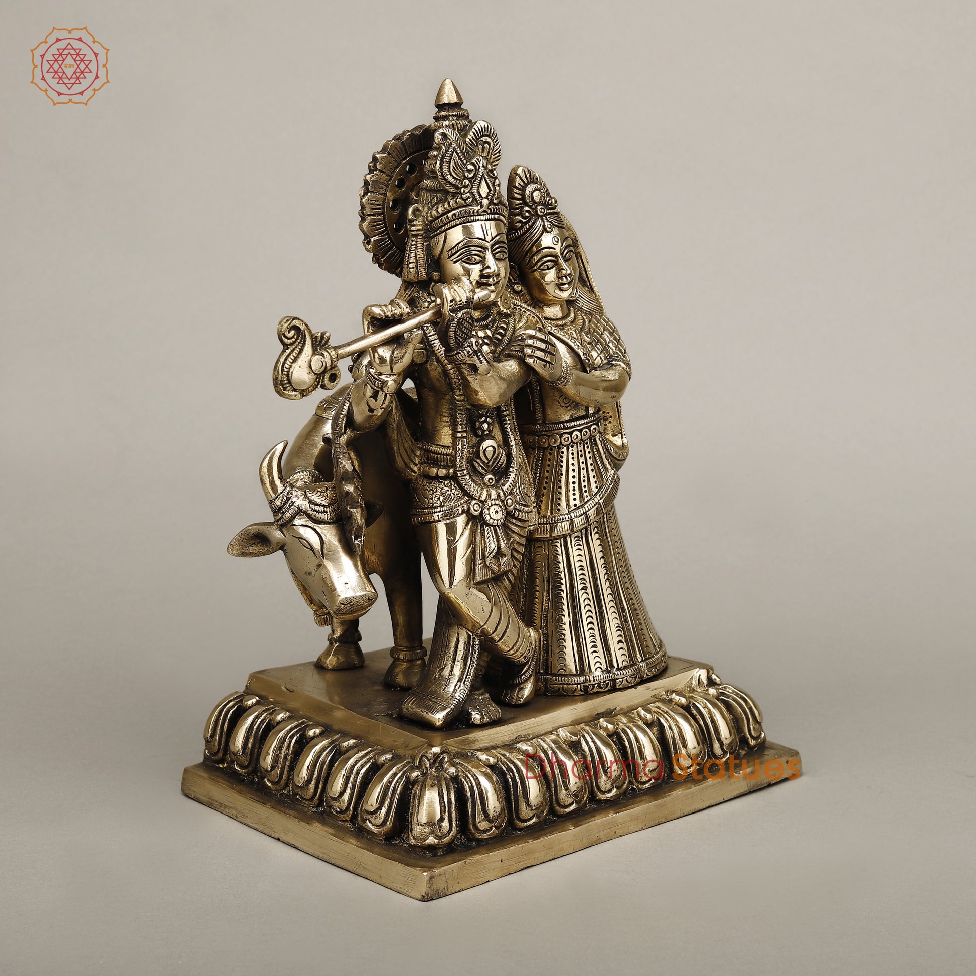 Brass Radha Krishna Playing Flute with Cow, Golden Finish, 12"