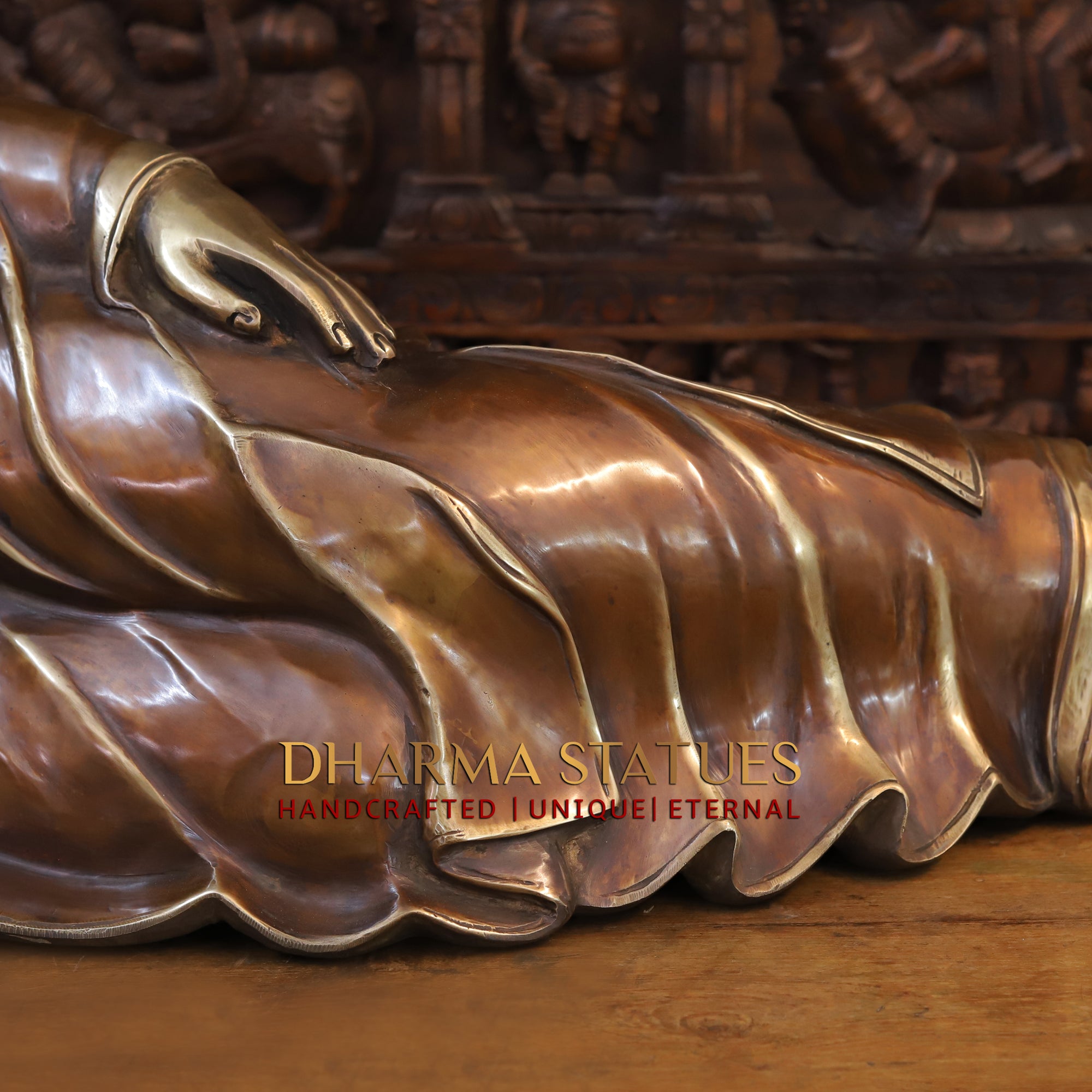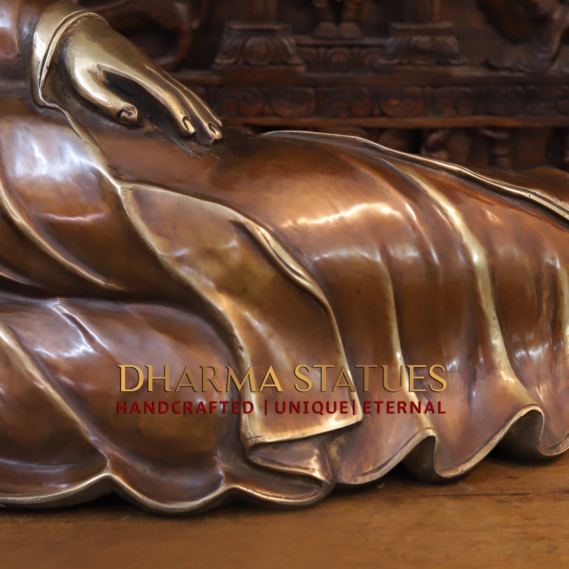 Enhance your home decor with our Brass Resting Buddha statue, adorned with a beautiful copper and golden finish. Made of high-quality brass, this 19" statue exudes tranquility and peace, perfect for creating a calming atmosphere. Display it in any room for a touch of elegance and mindfulness.