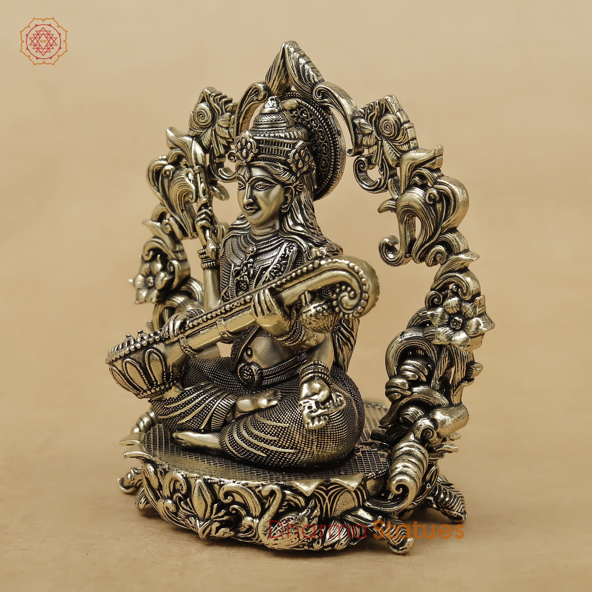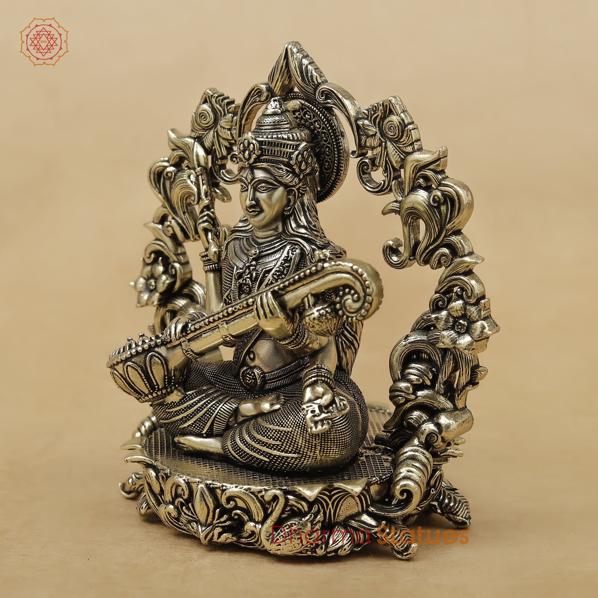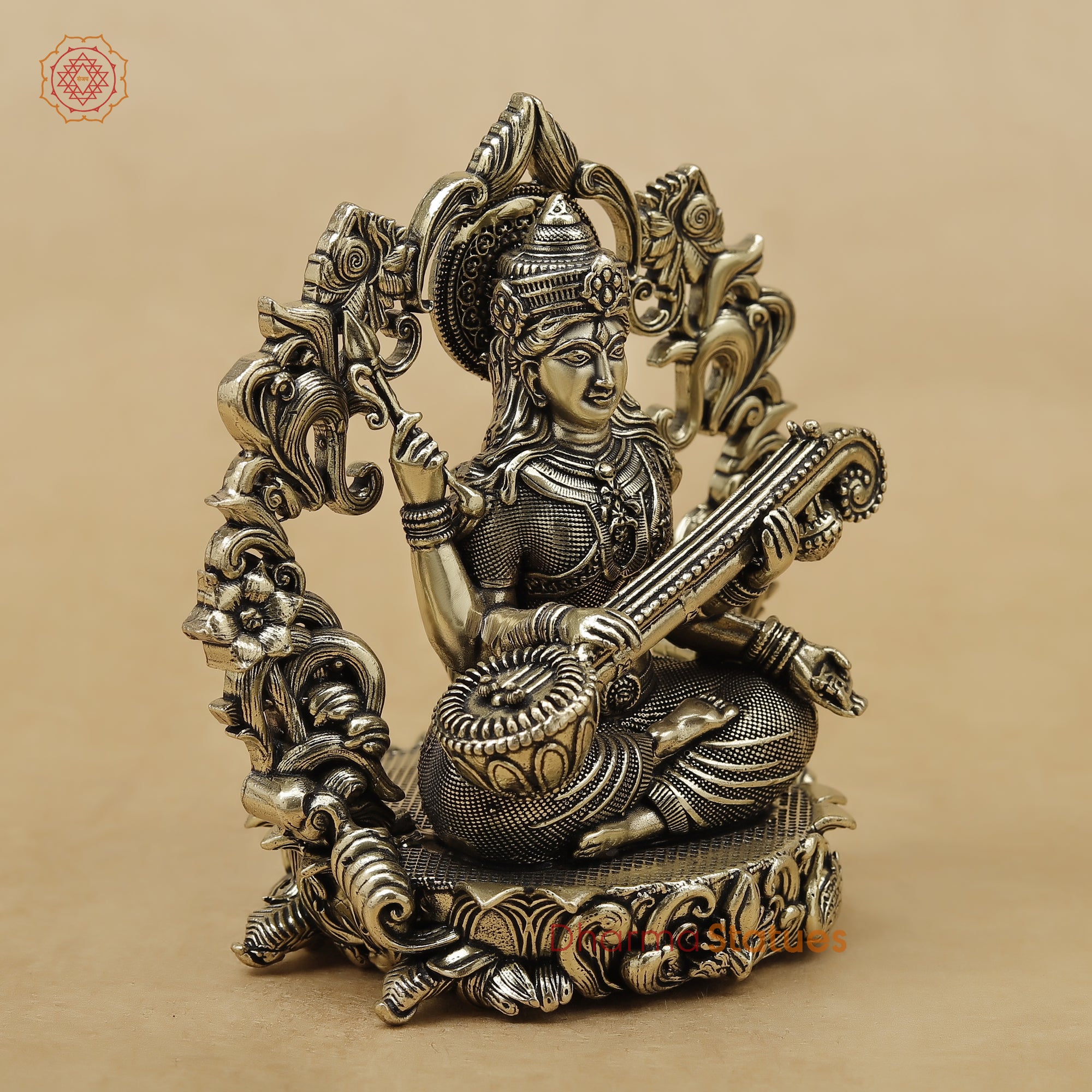 This 4-inch Saraswati idol captures divine elegance with intricate detailing, a beautifully carved floral arch, and her veena held gracefully. Symbolizing wisdom, music, and purity, it’s perfect for study tables, pooja rooms, or gifting. A stunning handcrafted piece that elevates spiritual and aesthetic ambience.
