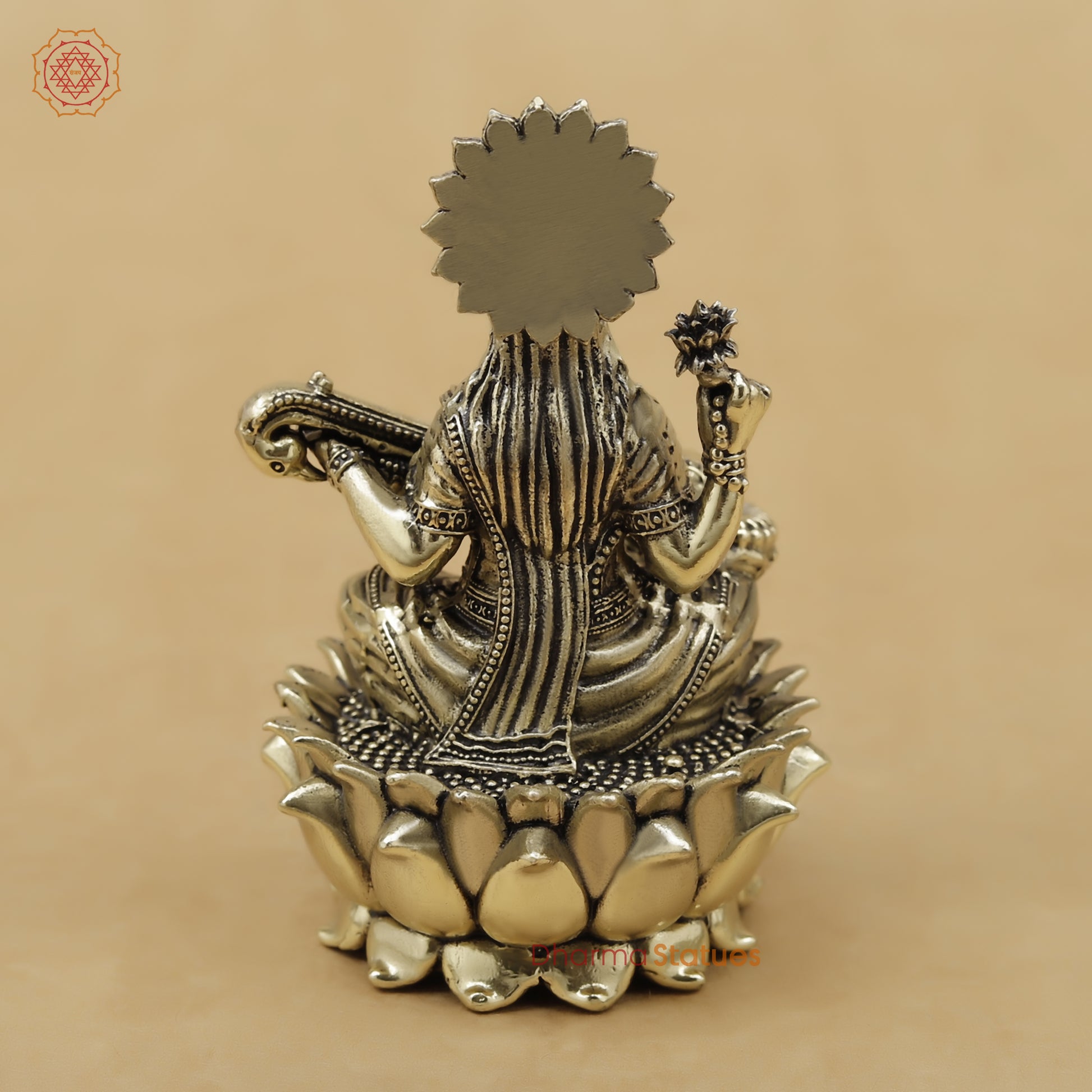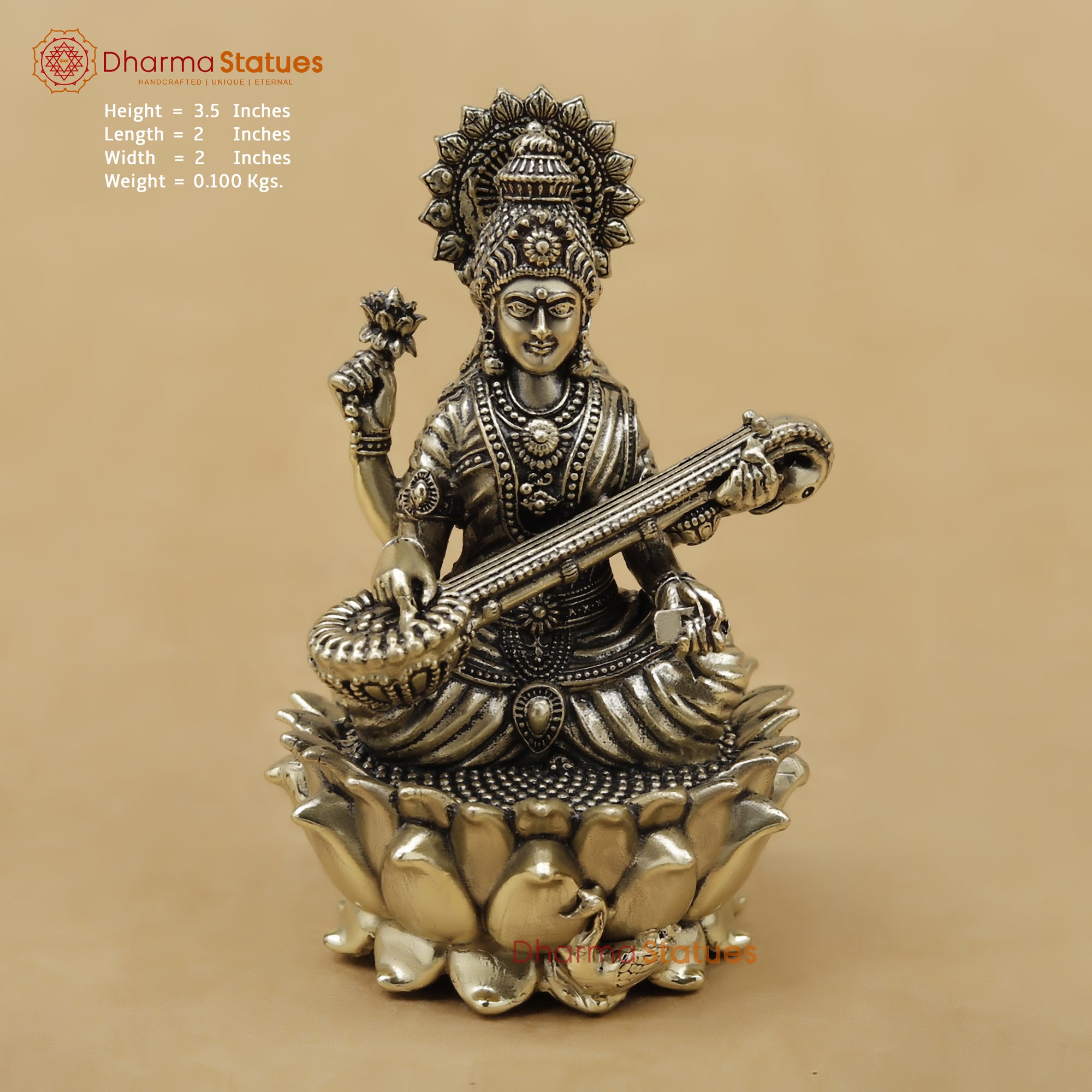 Bring wisdom, creativity, and spiritual harmony into your space with this beautifully handcrafted Saraswati Idol, seated gracefully on a blooming lotus. Carved with stunning detail and finished in an antique metallic tone, this statue captures Maa Saraswati's serene presence as she plays the veena—the symbol of knowledge, music, and the arts.