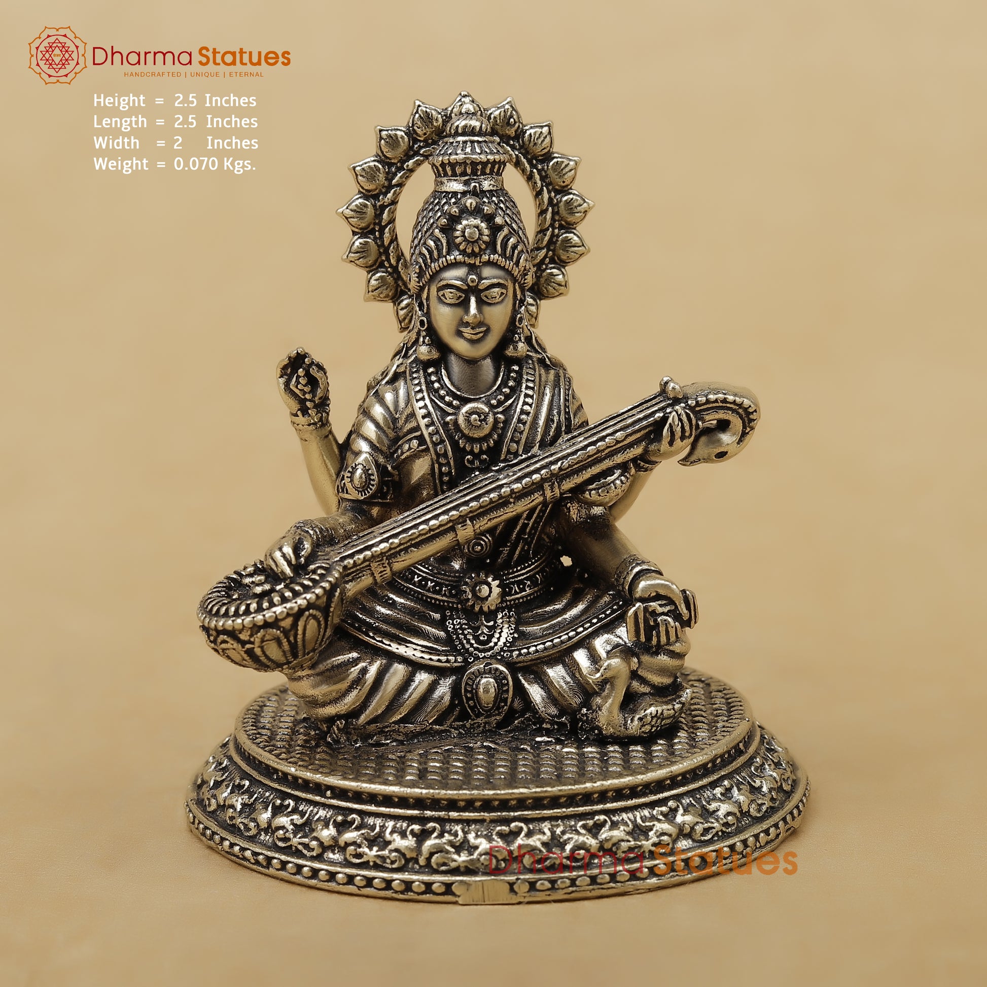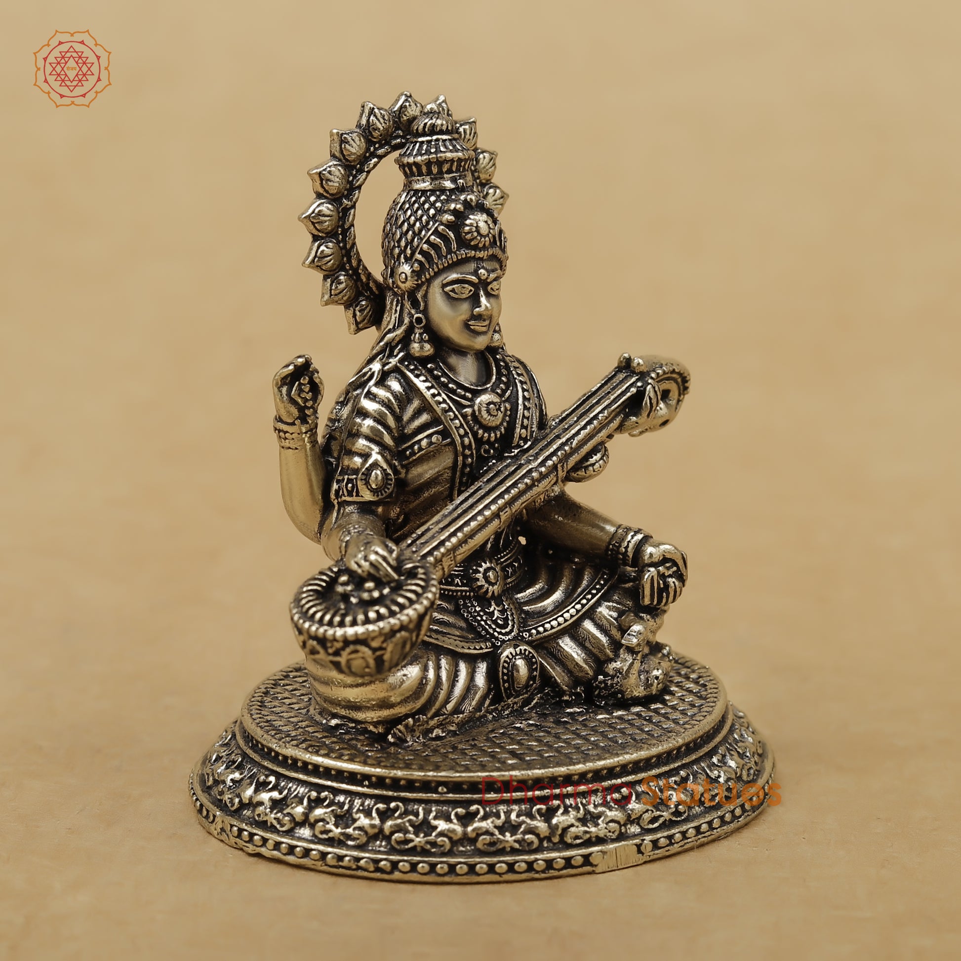 A finely detailed brass Saraswati idol symbolizing wisdom, music, and creativity. The goddess sits gracefully with her veena, making it ideal for study rooms, desks, and auspicious gifting.