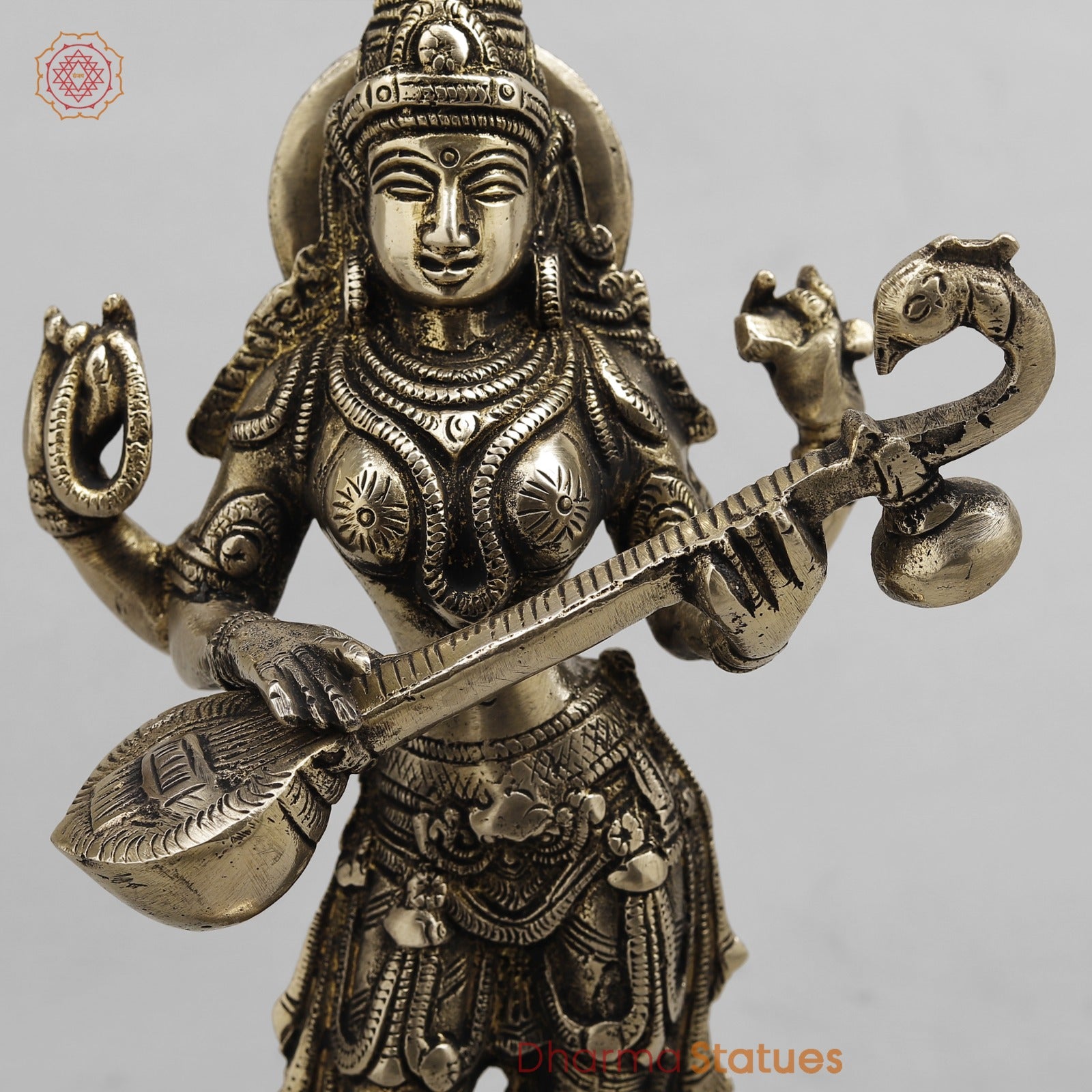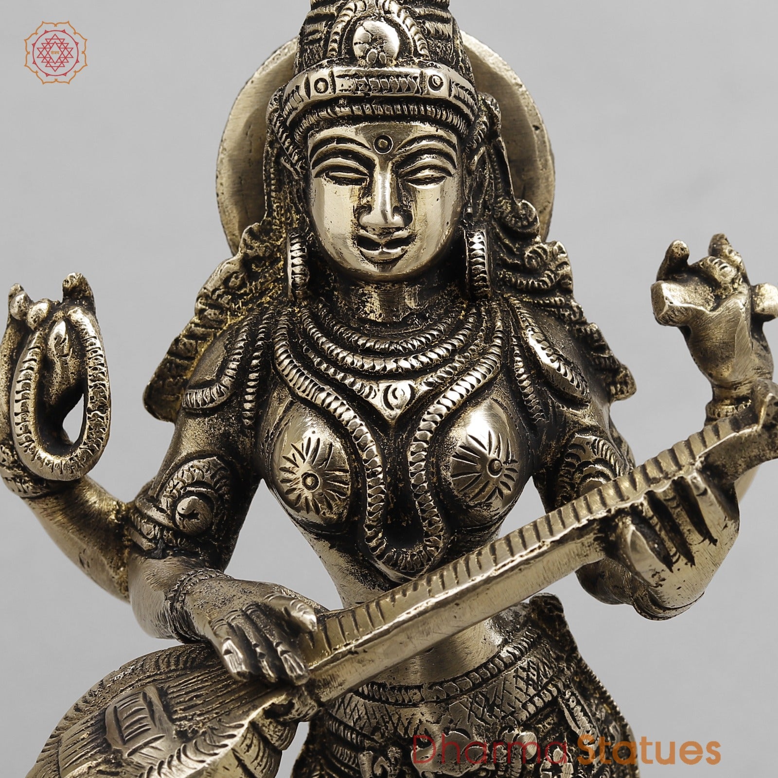 This elegant handcrafted brass Goddess Saraswati statue depicts the goddess playing the veena, symbolizing wisdom, knowledge, and the arts. Finished with fine detailing and an antique look, it is ideal for home temples, study spaces, or auspicious gifting.