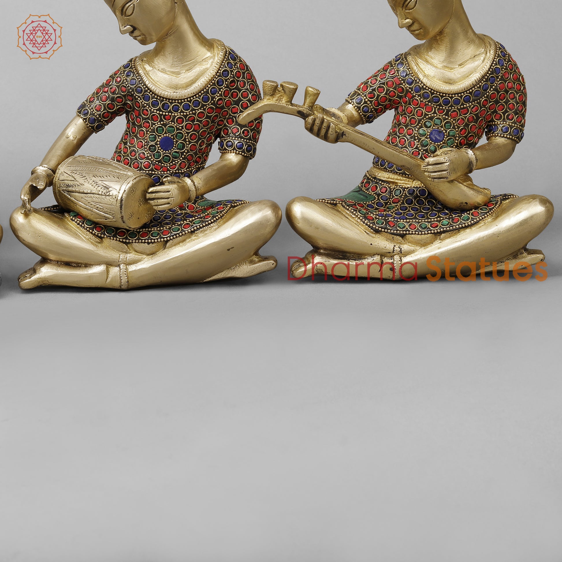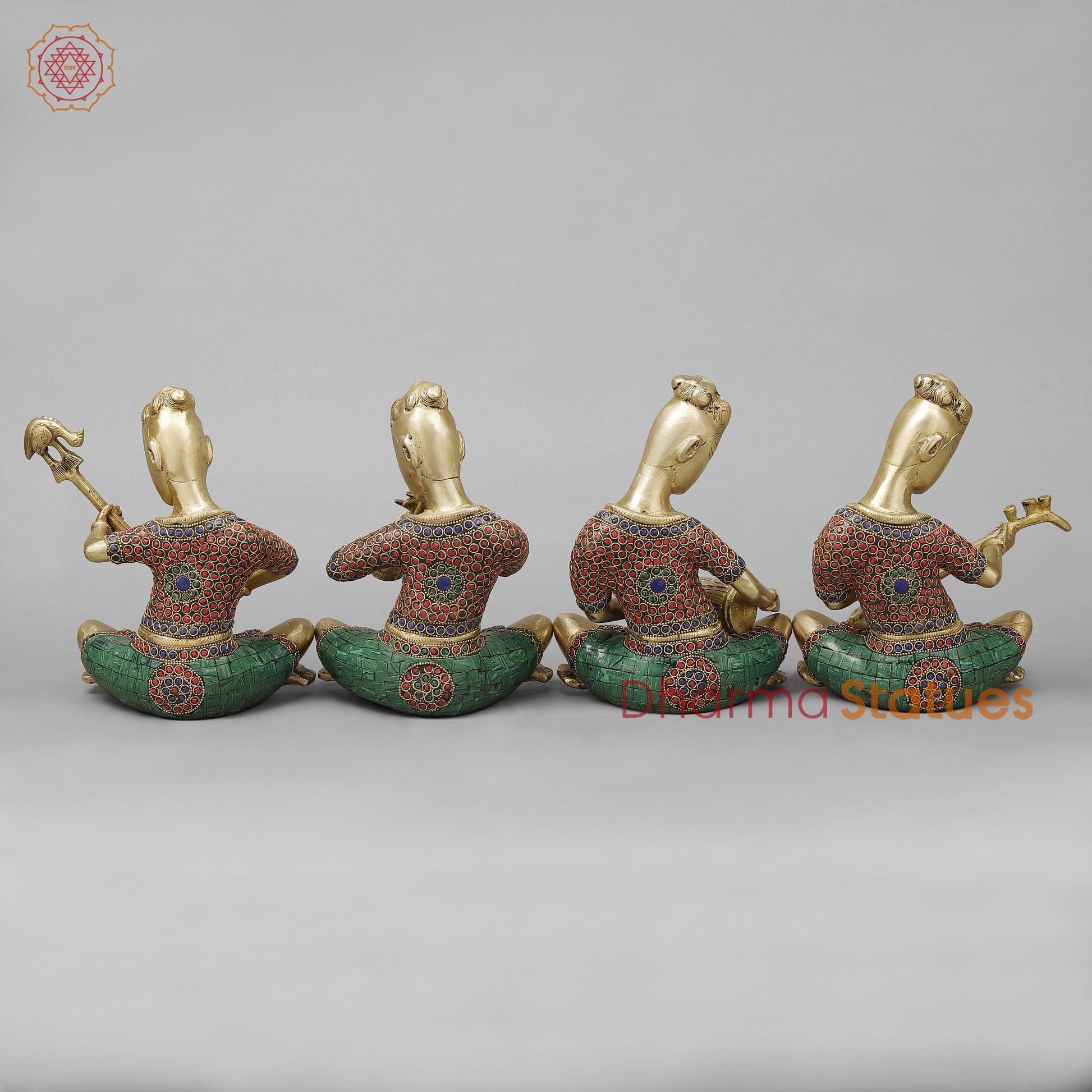 Brass Set of Four Thai Musicians Seated, Smooth Finish with Stonework, 9"