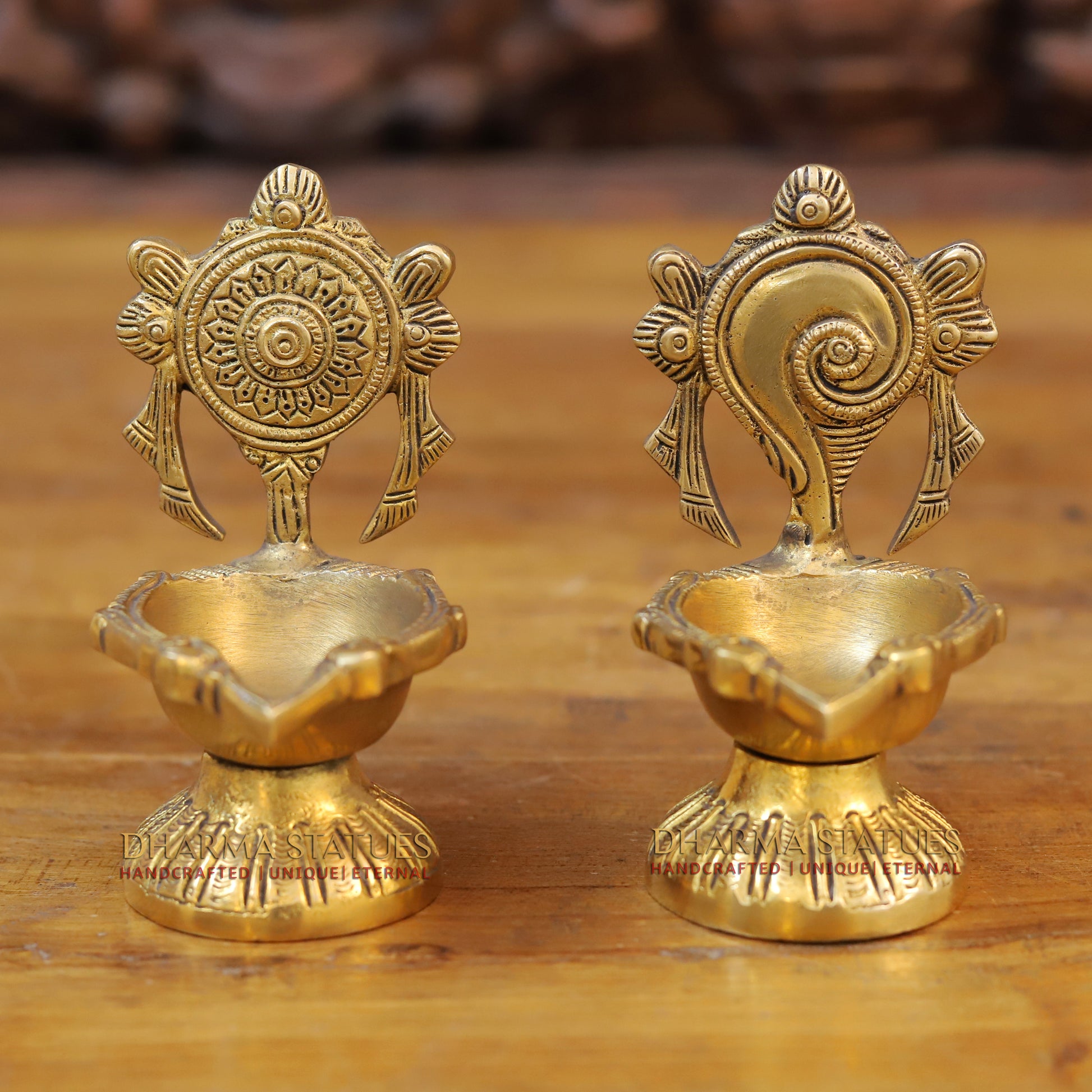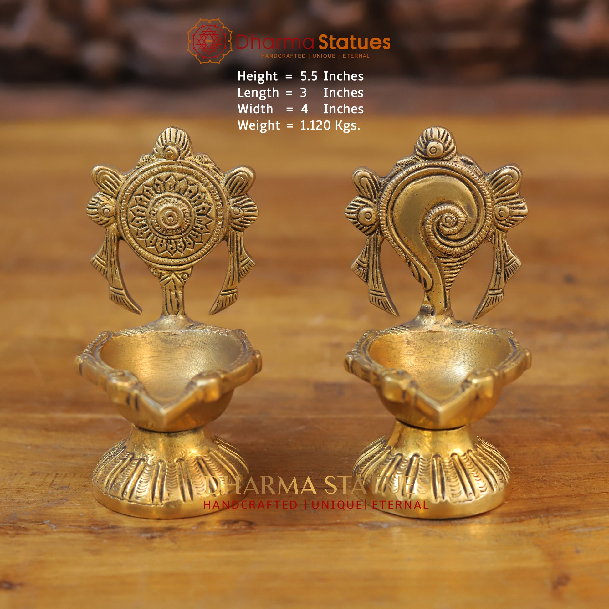 Brass Shankh Chakra Diya, Fine Golden Finish 5.5"