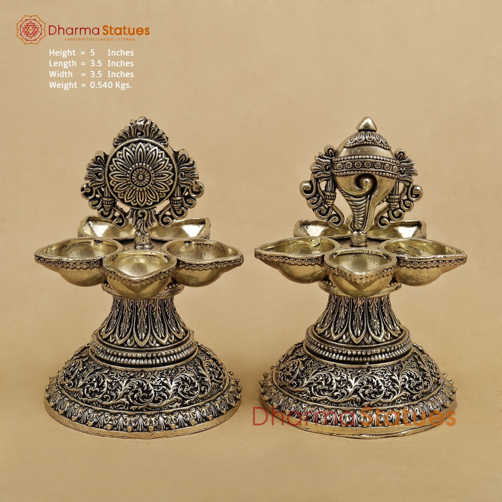 A beautifully crafted pair of brass lamps featuring Shankh (conch) and Chakra symbols, representing divine protection, purity, and spiritual power. Perfect for home temples, pooja rituals, and festive décor.