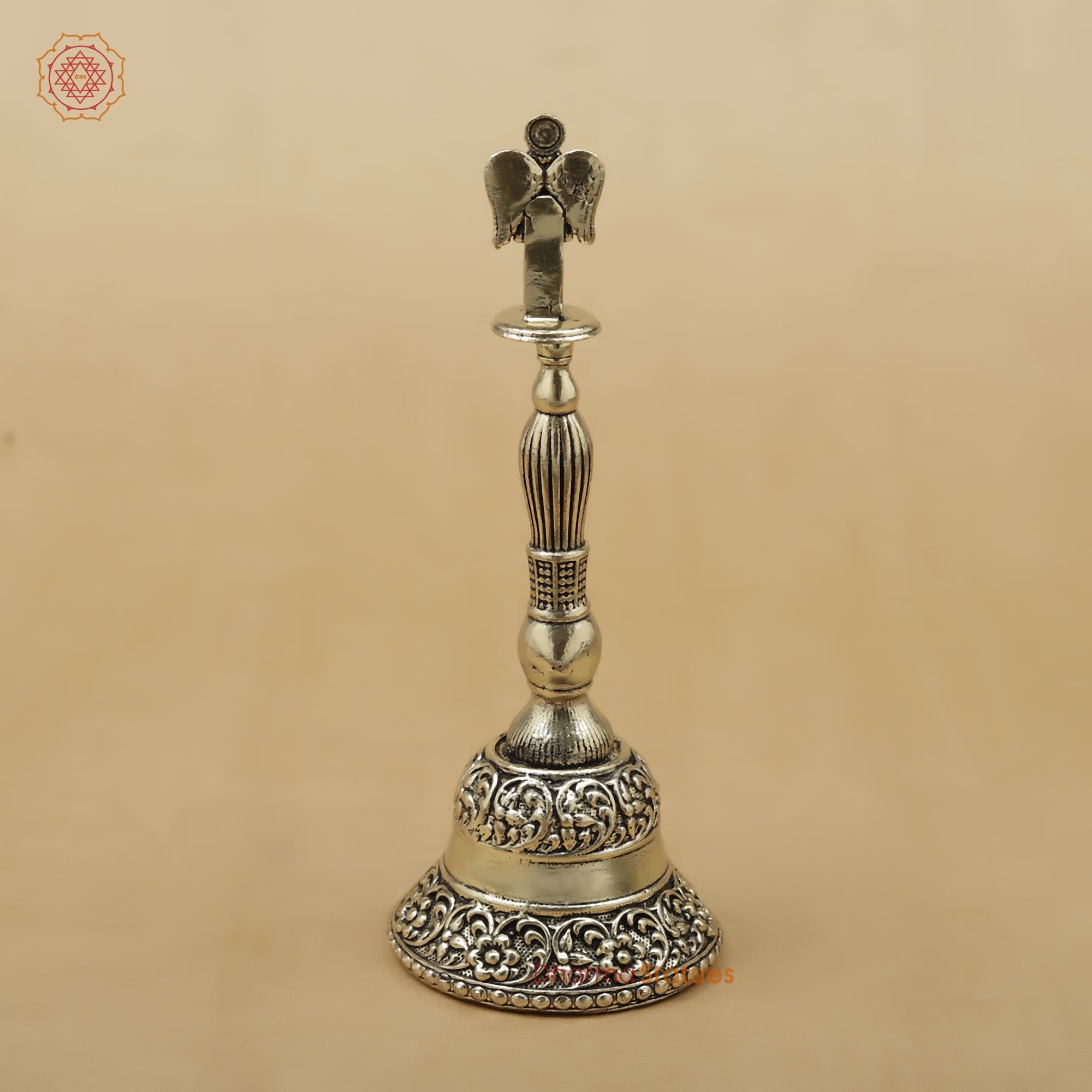 Designed with intricate carvings on the handle and bell body, it offers a pure, resonant sound ideal for aarti, meditation, and sacred ceremonies. The antique metallic finish adds a timeless charm, making it a perfect addition to any home temple.