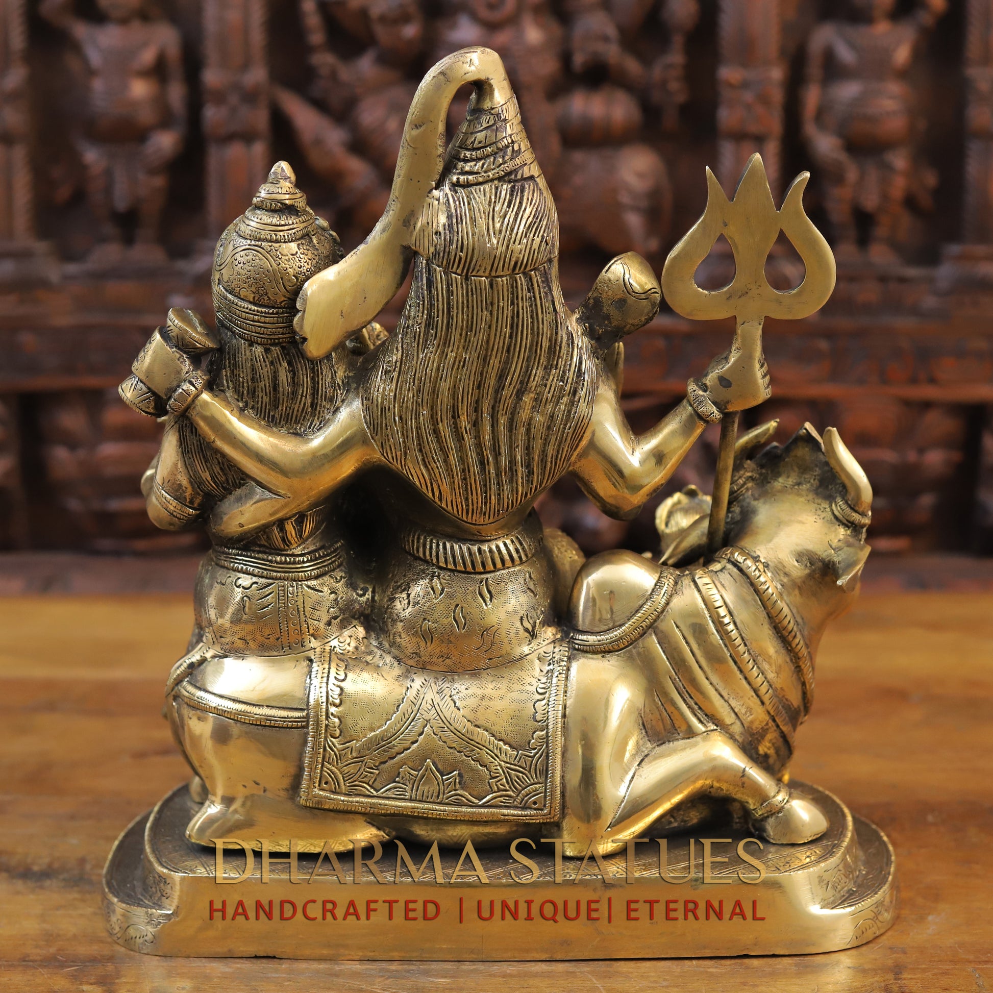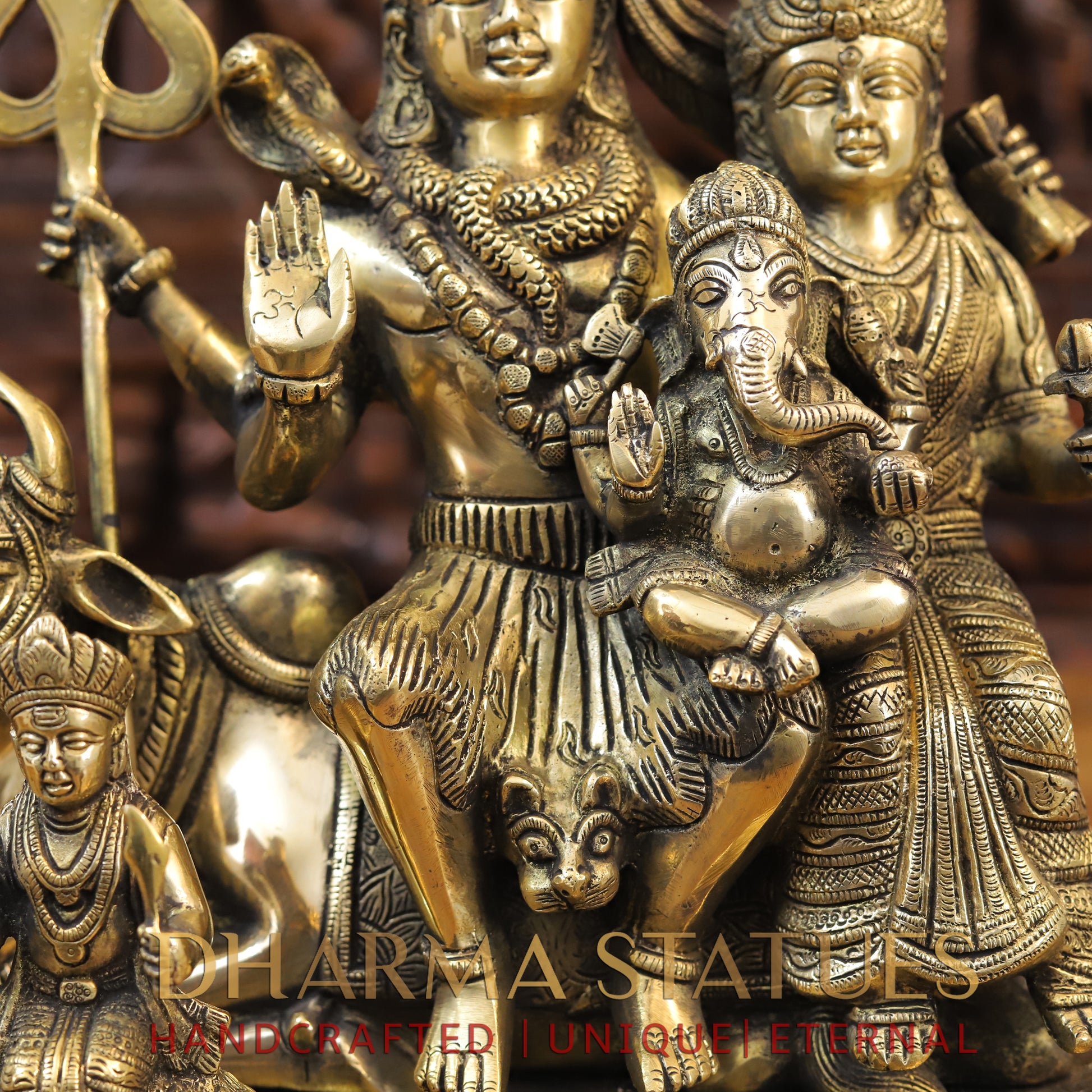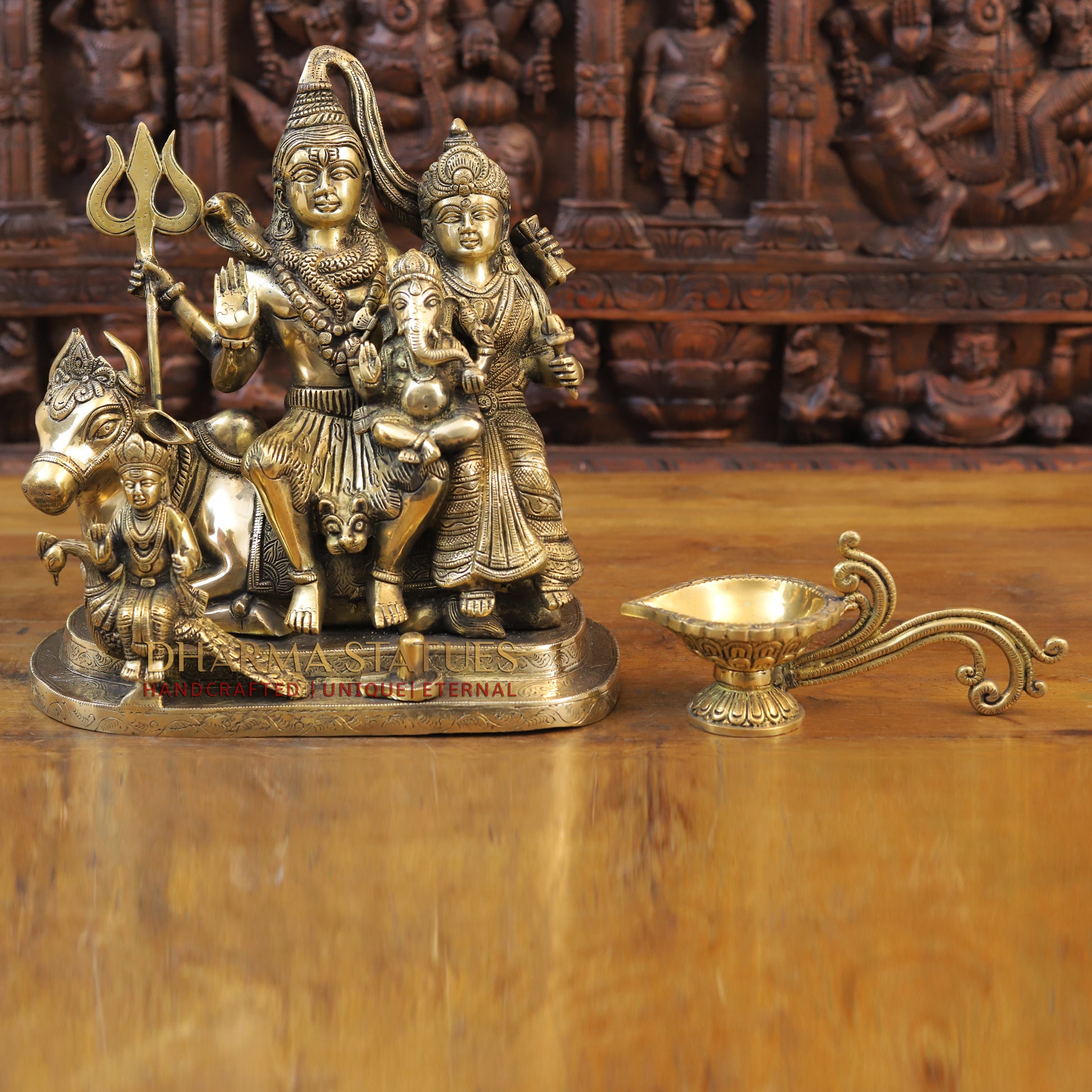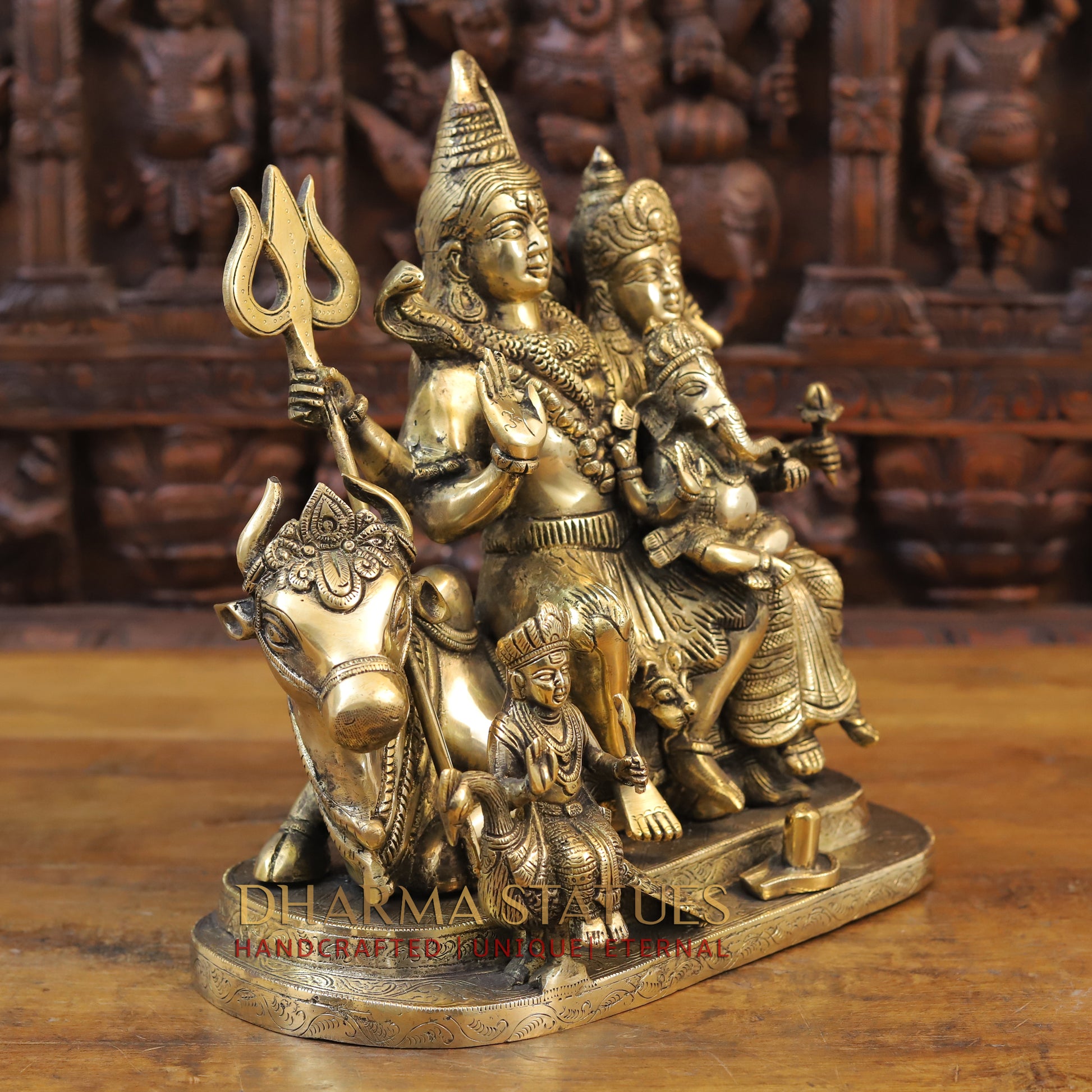 Brass Shiv Parivar Statue, Seated on Nandi, Fine Golden Finish 14"
