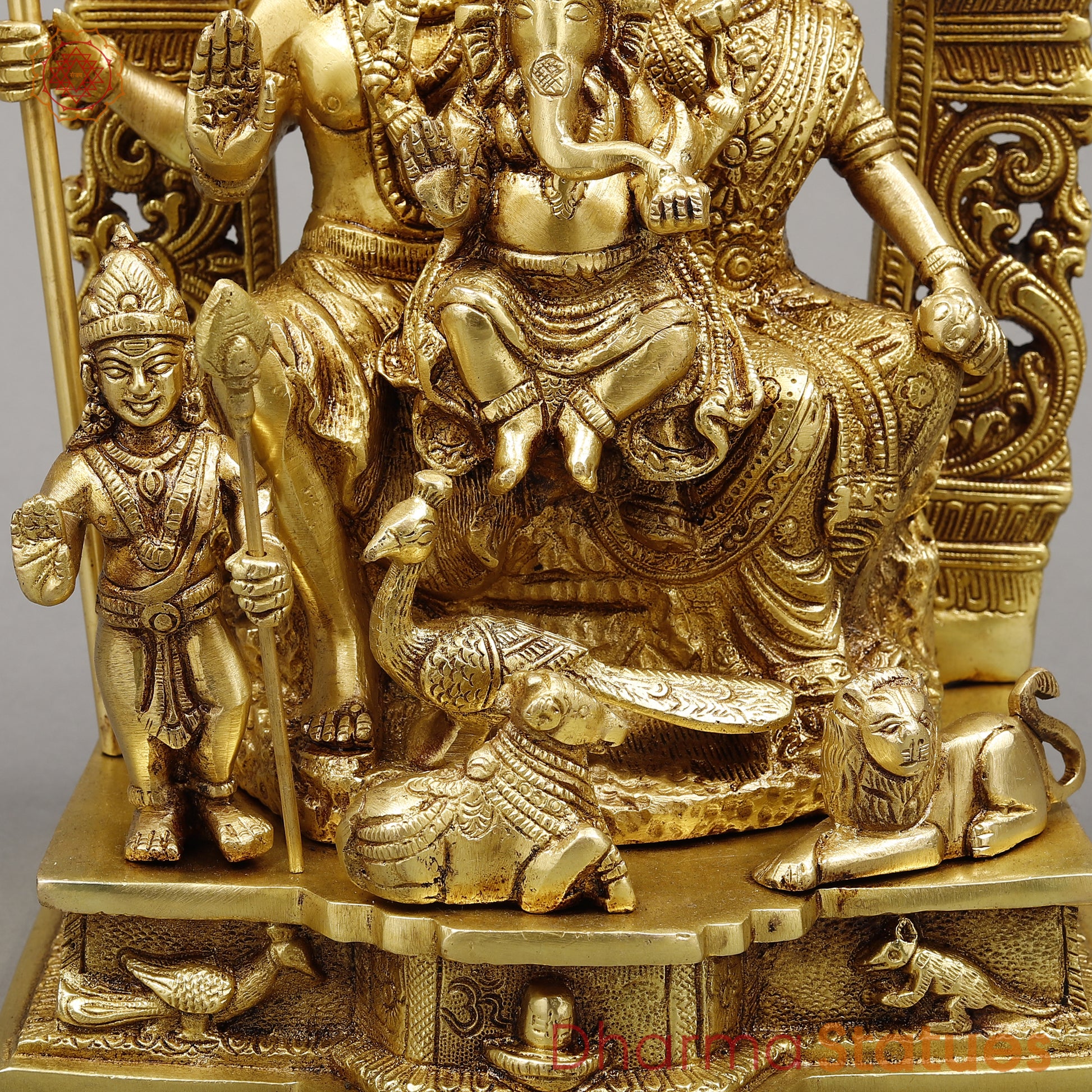The Brass Shiva Parivar features a fine golden finish and measures 12 inches. Crafted with precision from brass, this intricate piece showcases the divine family of Lord Shiva, providing a spiritual and artistic touch to any space.