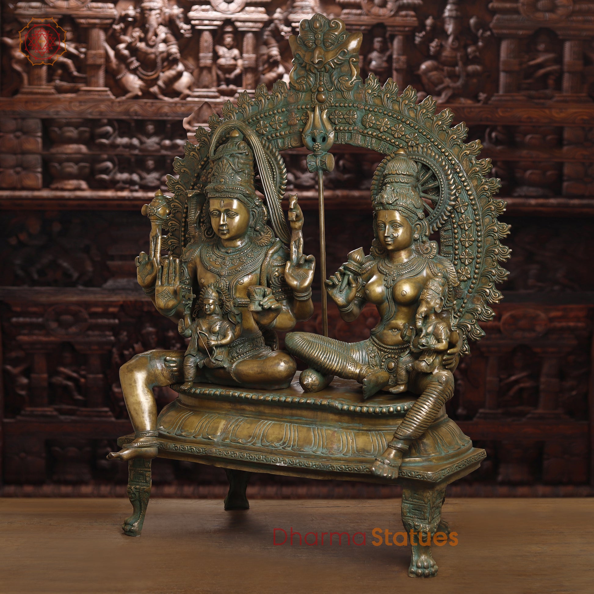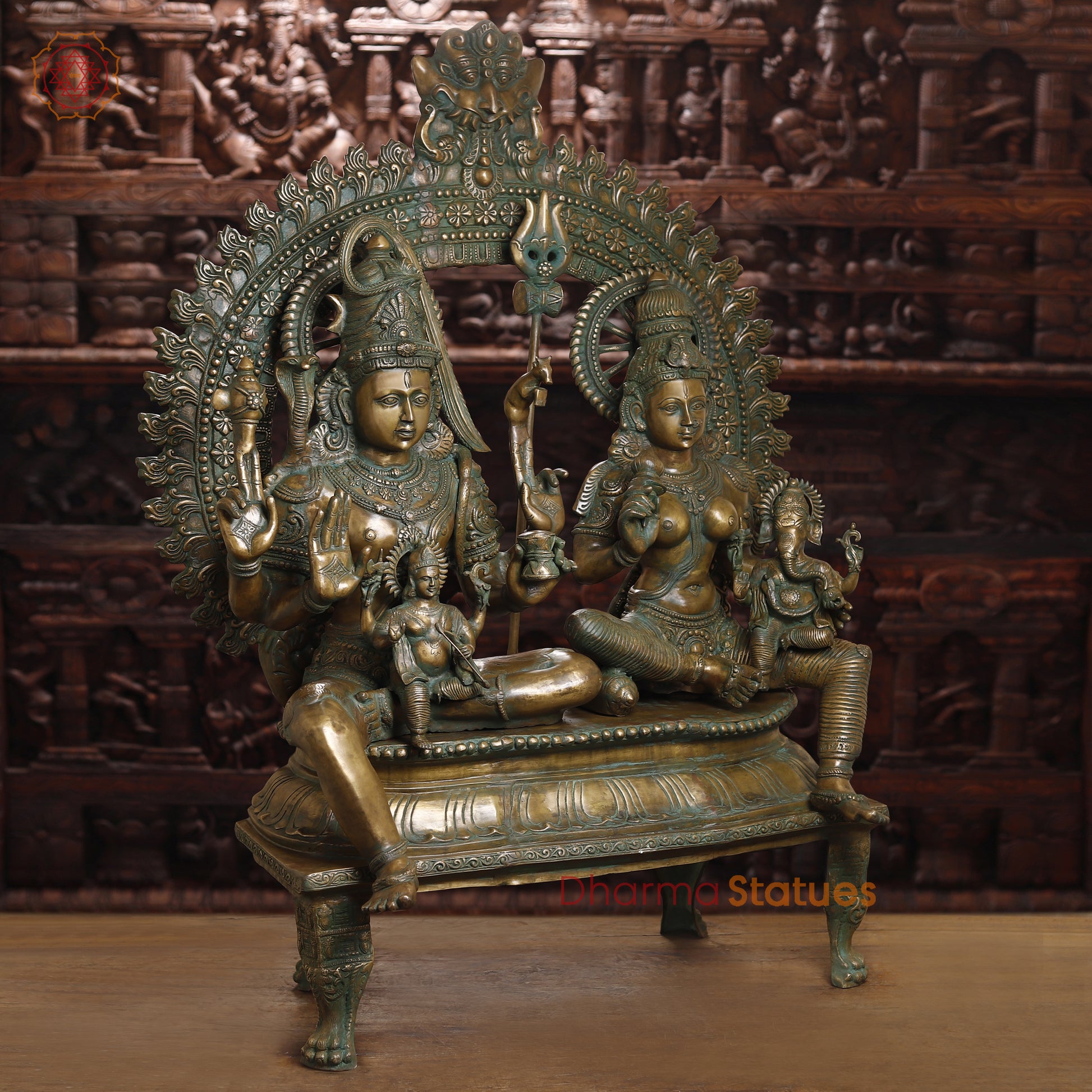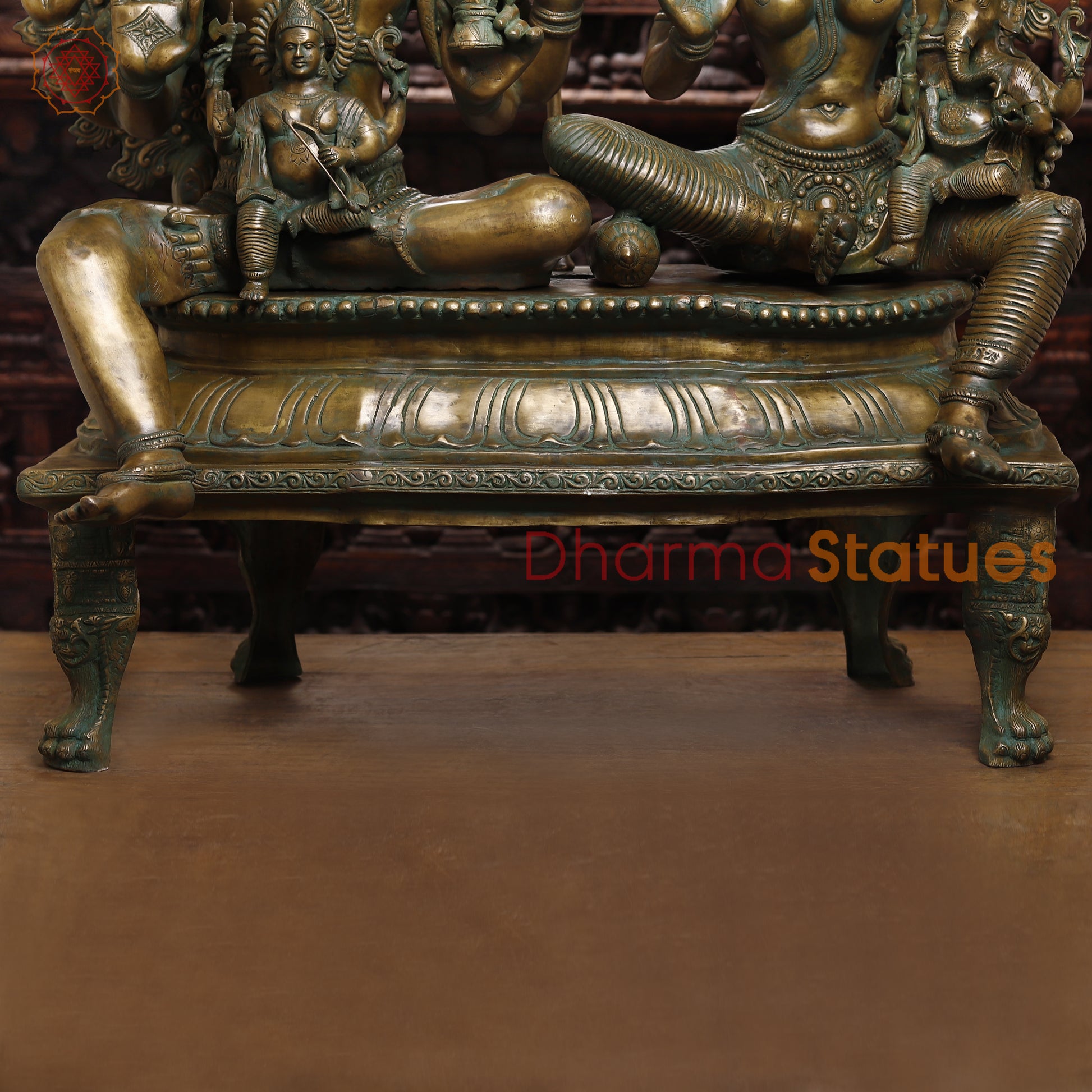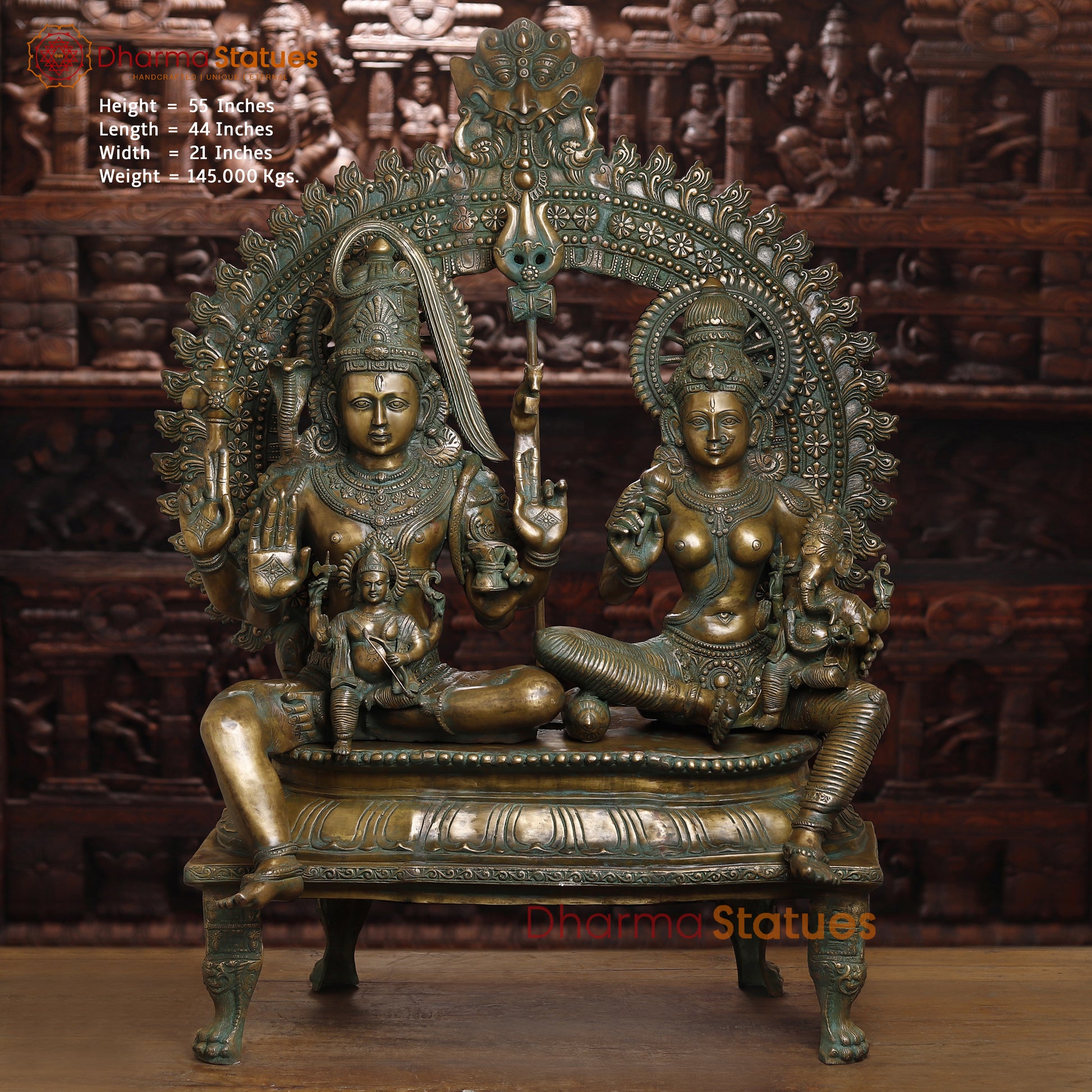 Brass Shiva, Parvati, Ganesh & Kartikeya, Golden & Green Finish, 55"