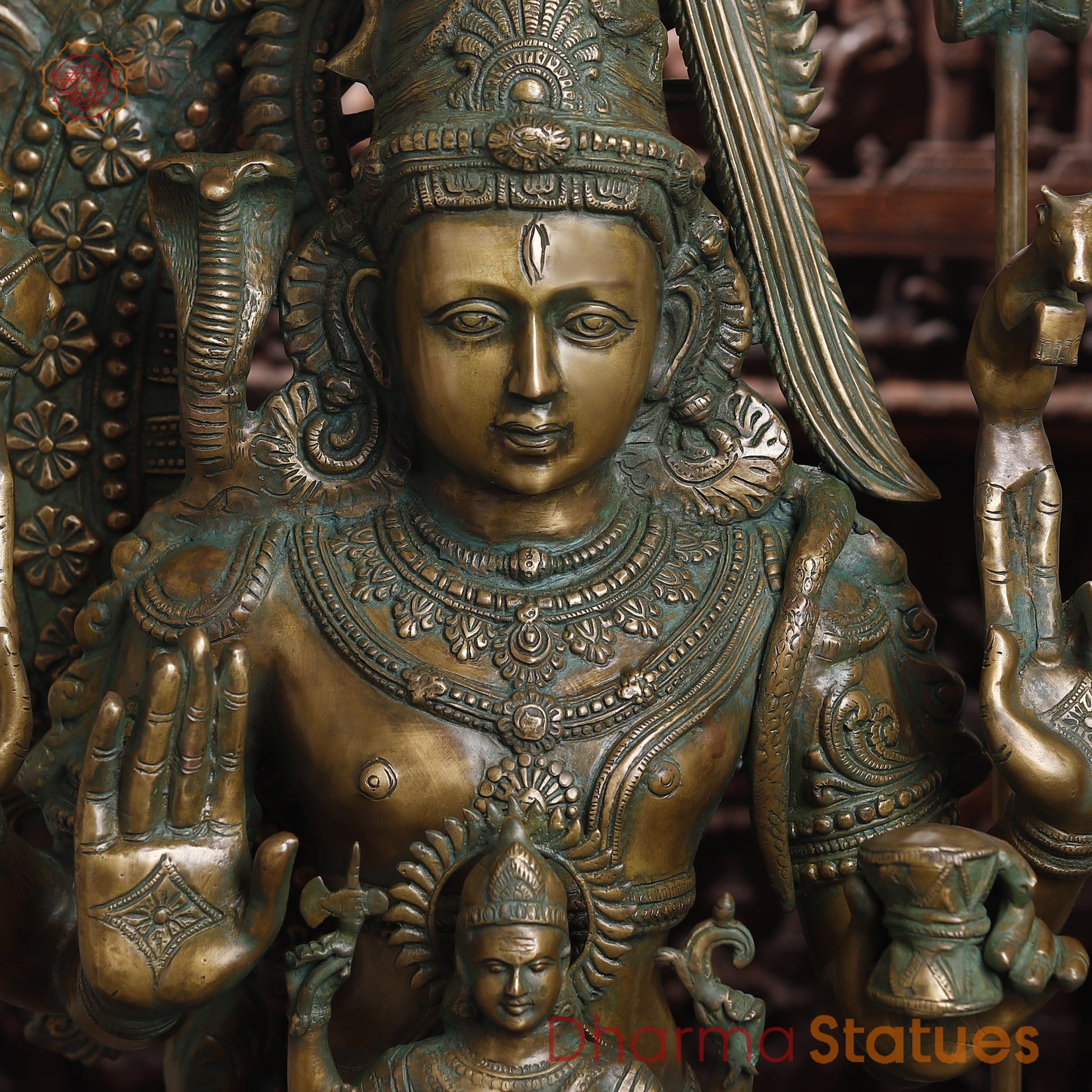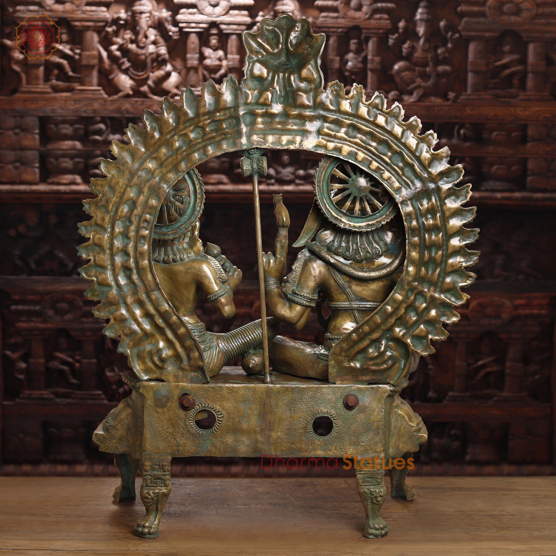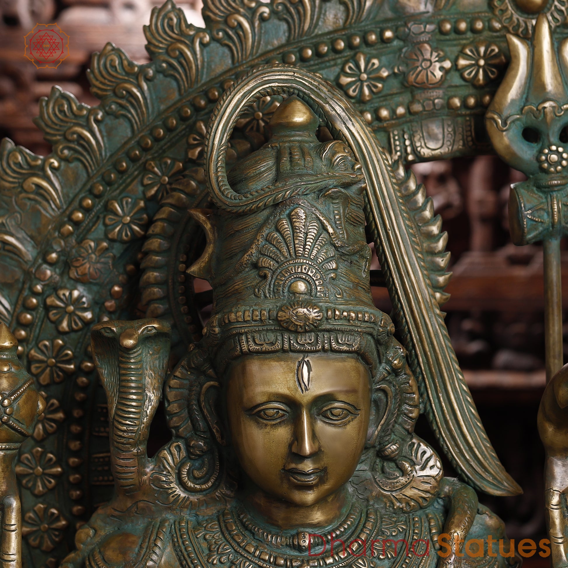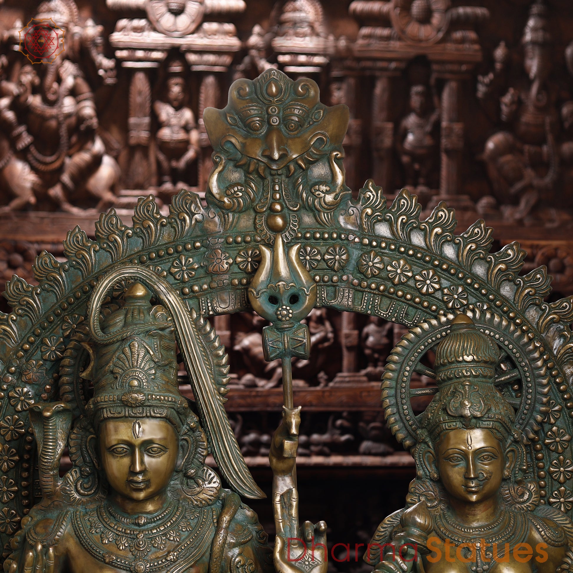 This hand-crafted brass sculpture depicts four Hindu deities - Shiva, Parvati, Ganesh, and Kartikeya. The golden and green finish adds a touch of elegance and authenticity. Place it in your home for a peaceful and spiritual atmosphere.