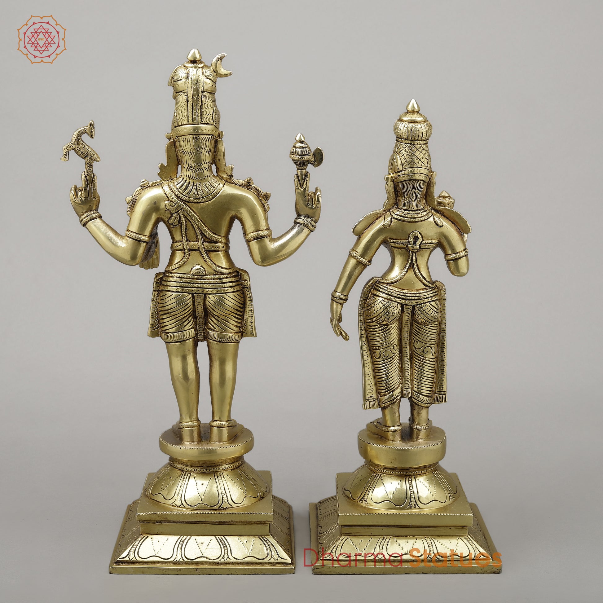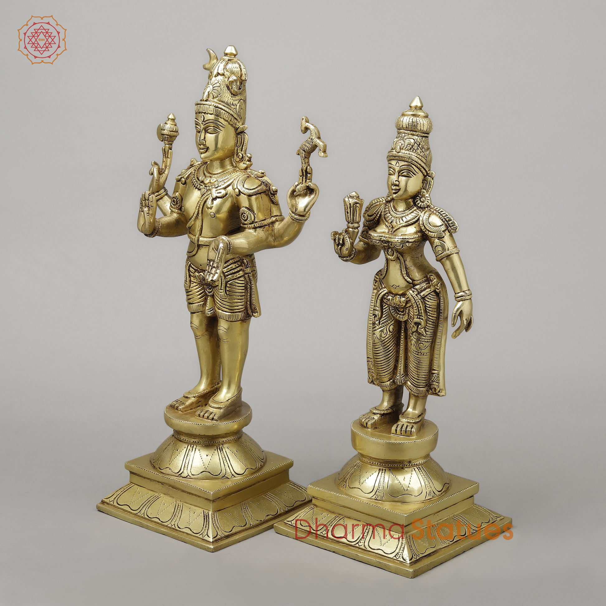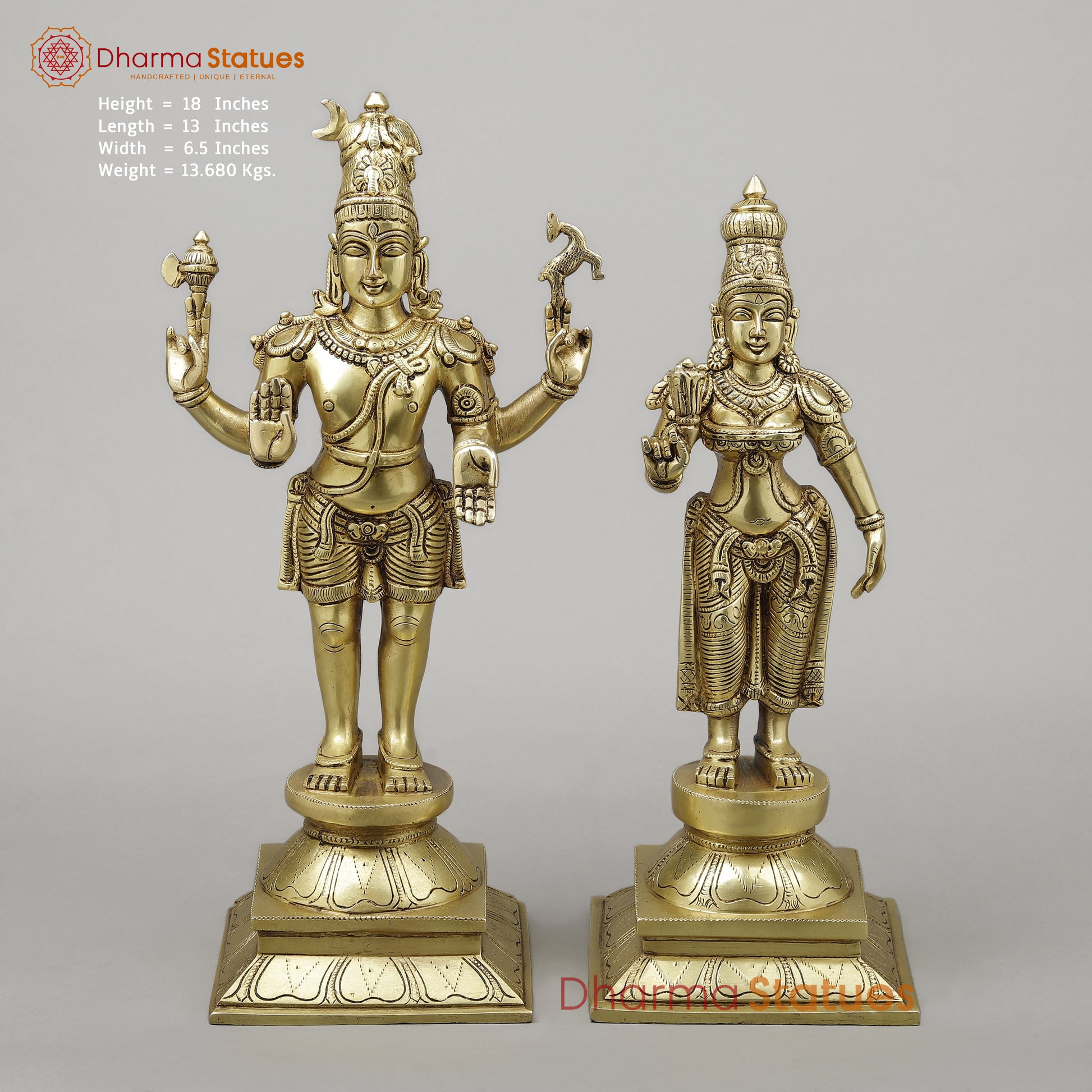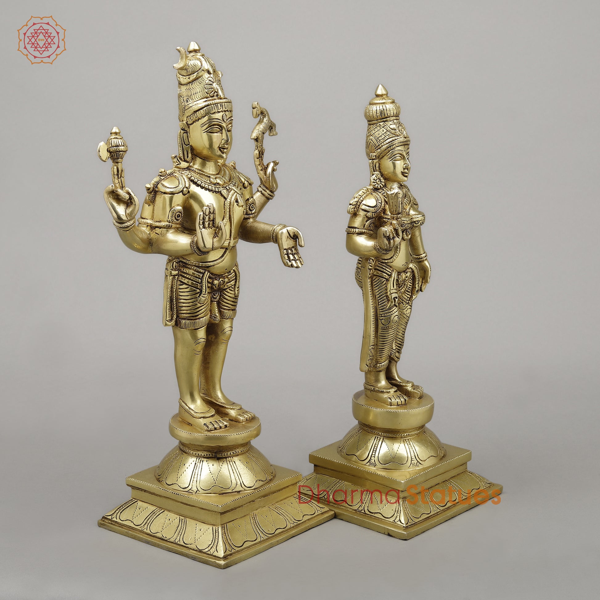 Brass Shiva & Parvati Standing on Pedestal, Fine Golden Finish, 18"