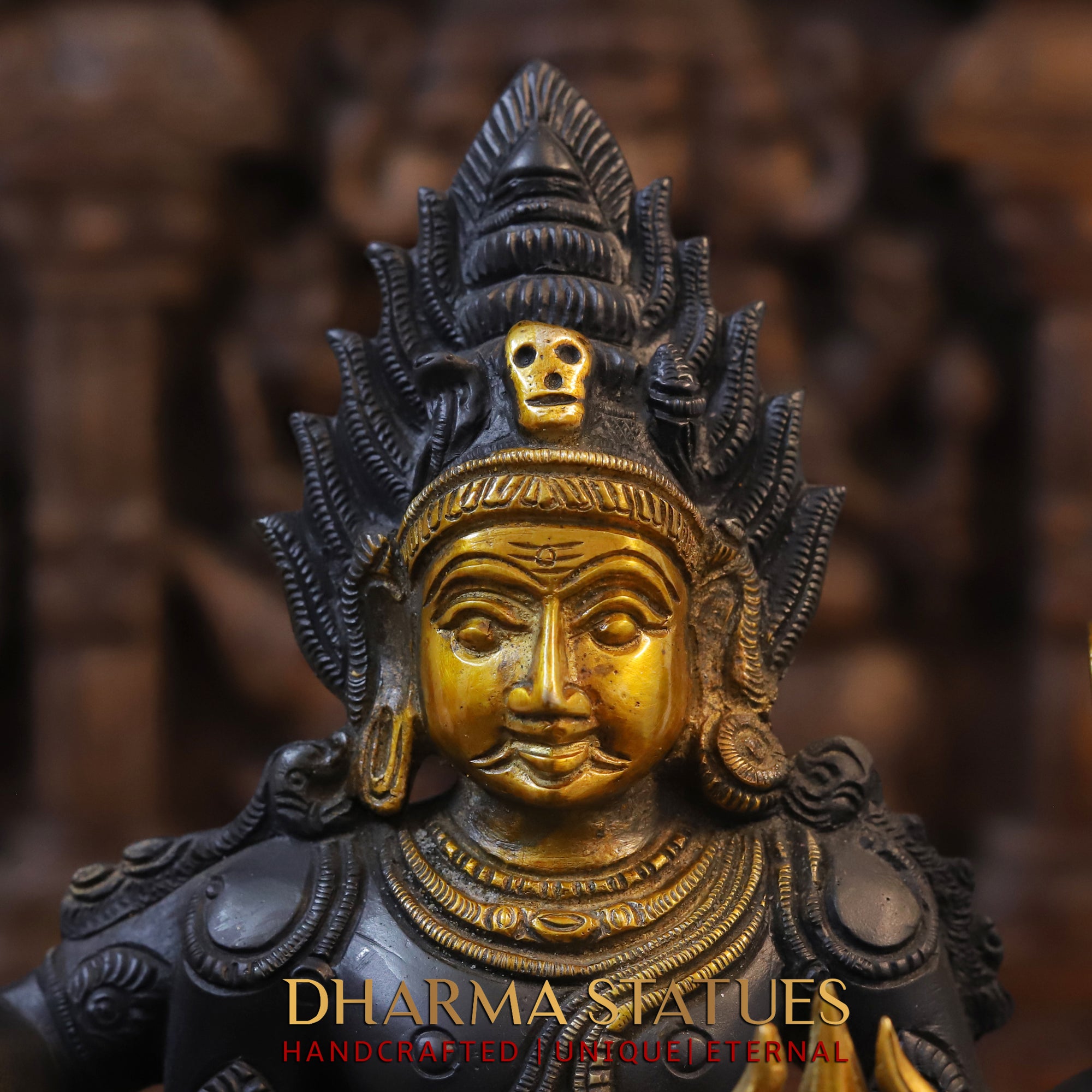 This Brass Shiva statue stands at 17.5" tall and features a stunning black patina and golden finish. Crafted from high-quality brass, this four-armed deity exudes strength and grace. Bring the powerful energy and protection of Shiva into your home with this expertly crafted statue.