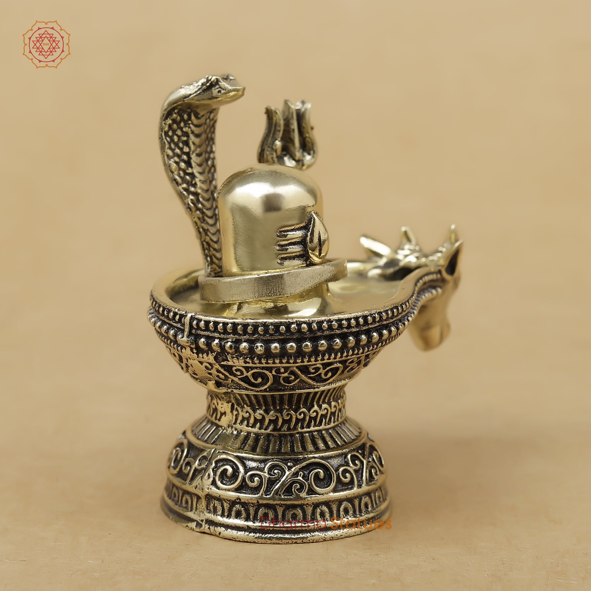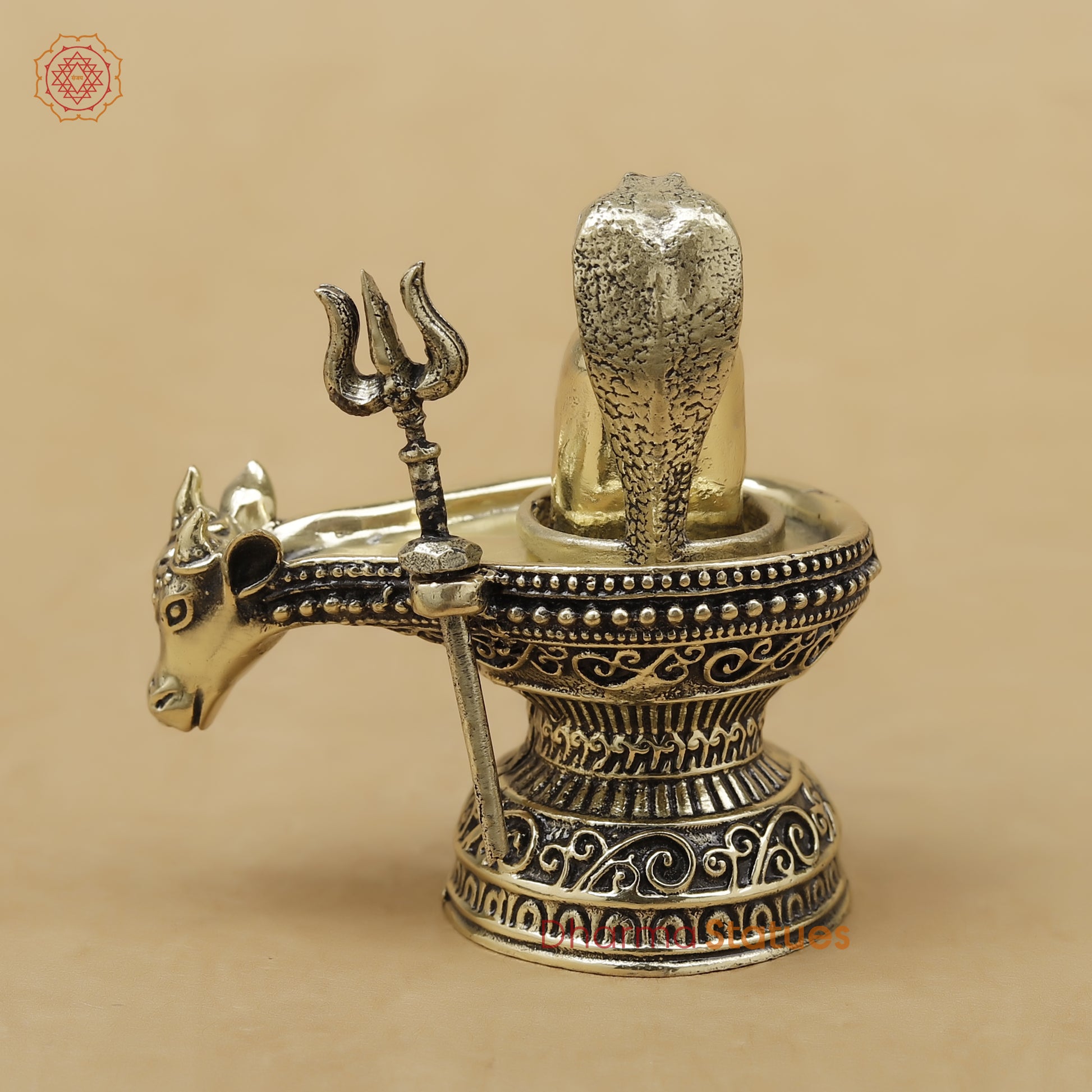 This intricately crafted 2.5" Shiva Lingam features a protective Naga hood, coiled serpent, elegant base, and sacred Nandi with Trishul detailing. The antique brass finish enhances its divine aura. Ideal for pooja rooms, meditation spaces, and gifting, it brings powerful spiritual energy, protection, and serenity into any home or workspace.