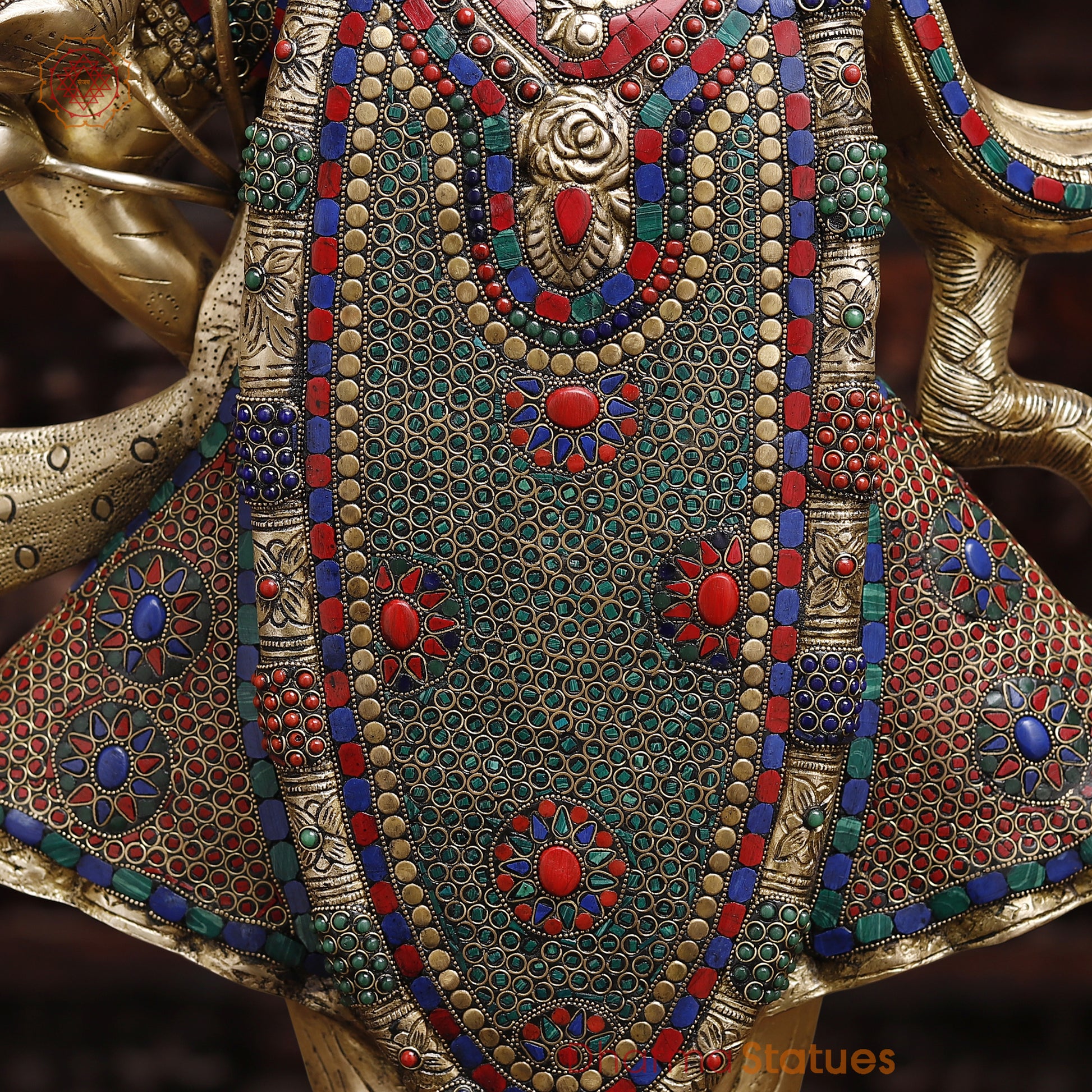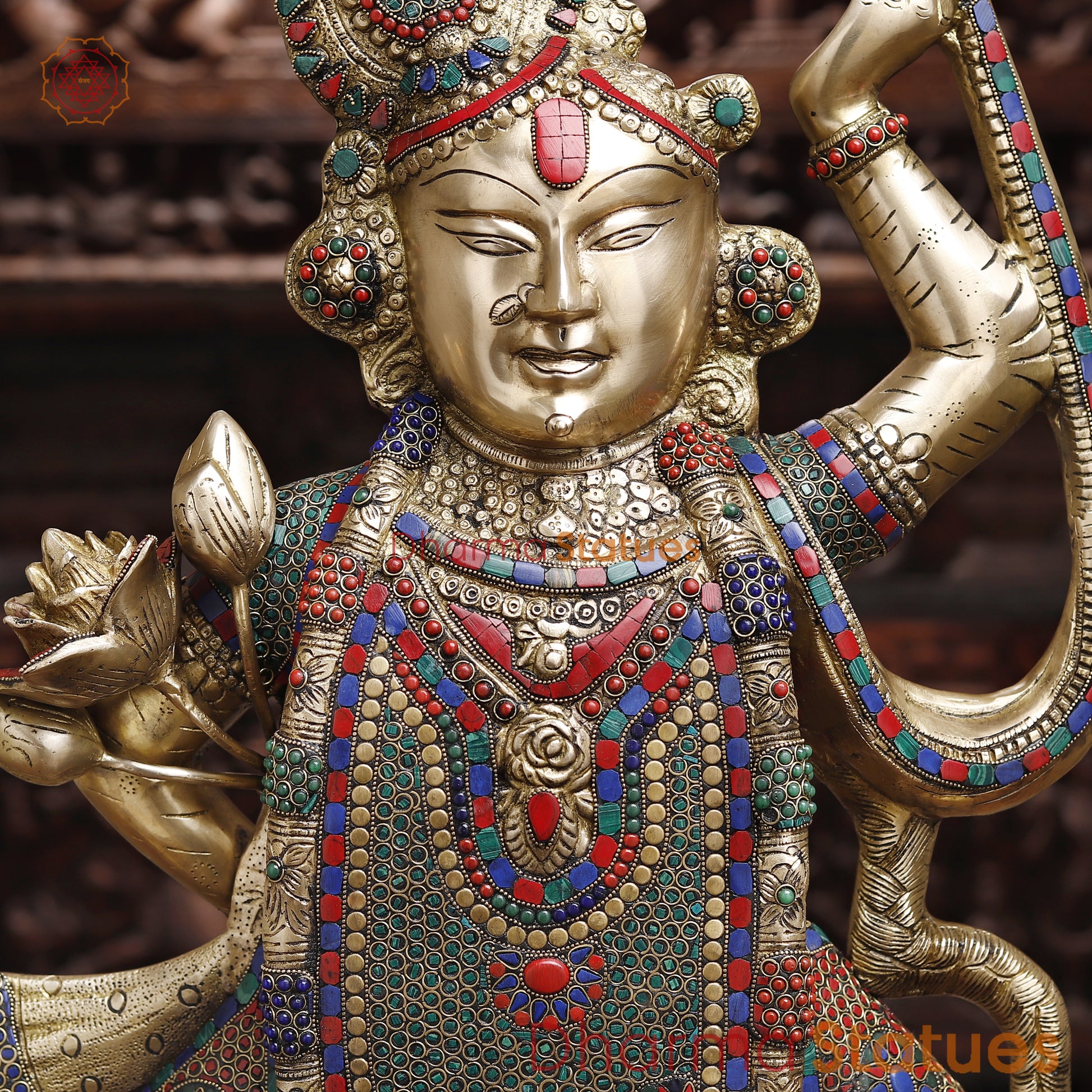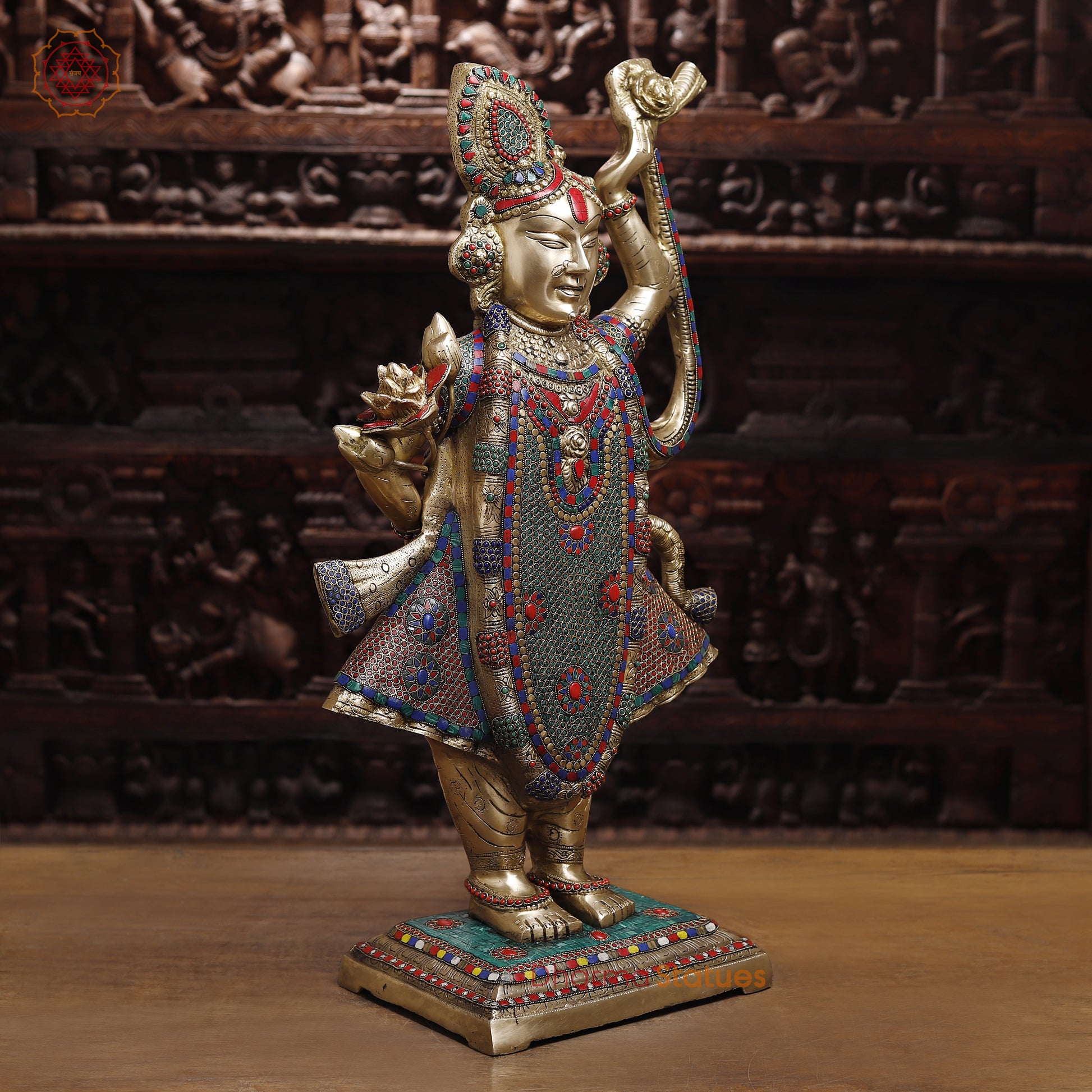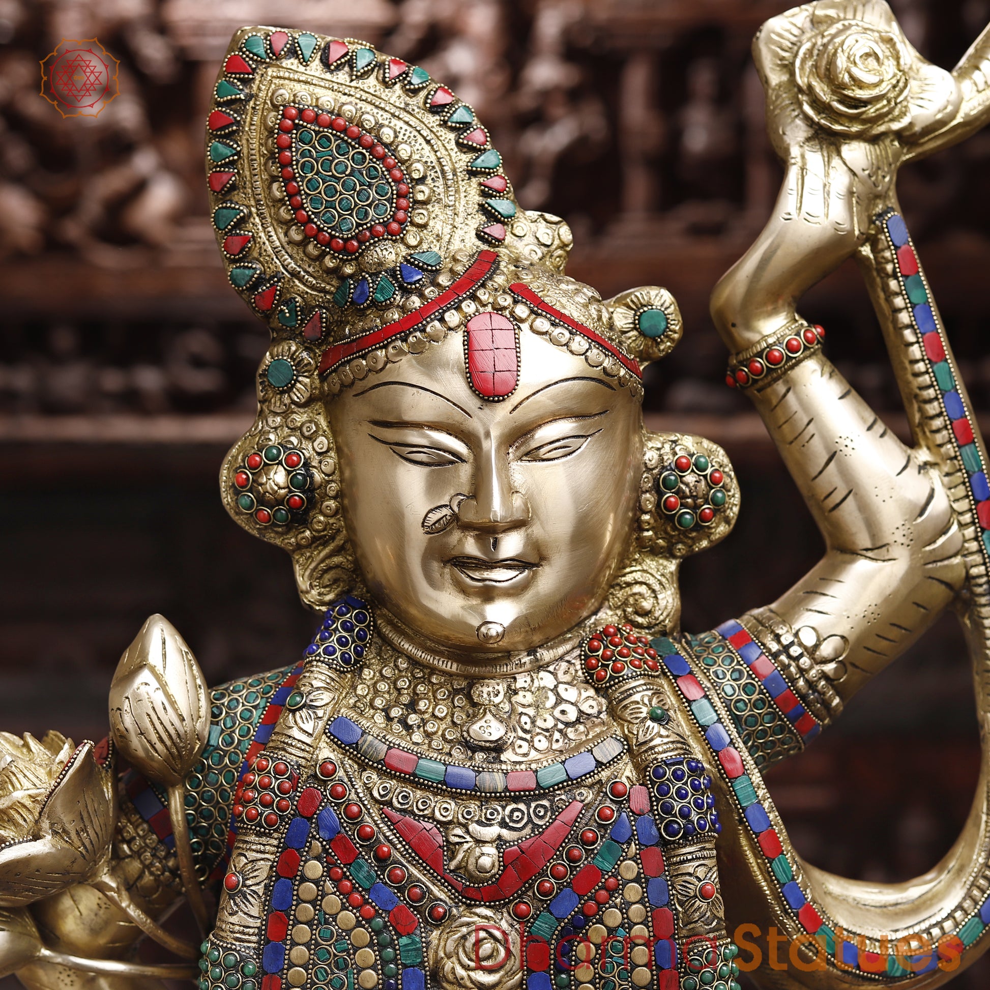 Expertly crafted and intricately designed, the Brass Shreenath showcases stunning stonework and a luxurious golden finish. Measuring at a grand 31.5 inches, this piece exudes elegance and sophistication, making it the perfect addition to any decor. Made with quality brass, it is not only aesthetically pleasing, but also durable and long-lasting. Elevate your space with this exquisite masterpiece.