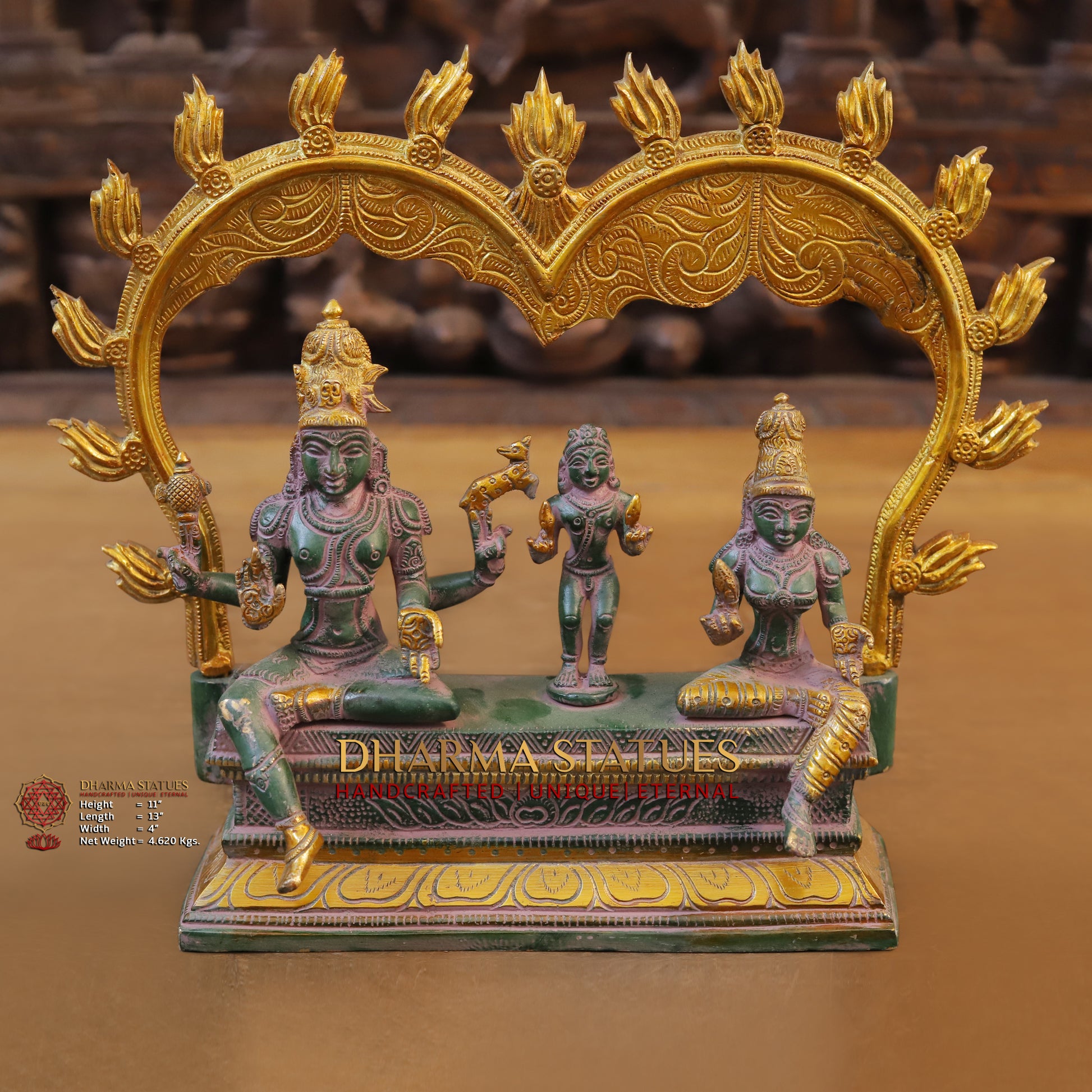 This brass Somaskandar statue depicts Lord Shiva with Devi Parvati and Kartikeya, finished with a beautiful golden and green patina. A sacred and intricate representation, perfect for those seeking blessings and divine energies. Expertly crafted with precise detail, this 11" statue is a powerful addition to any collection.
