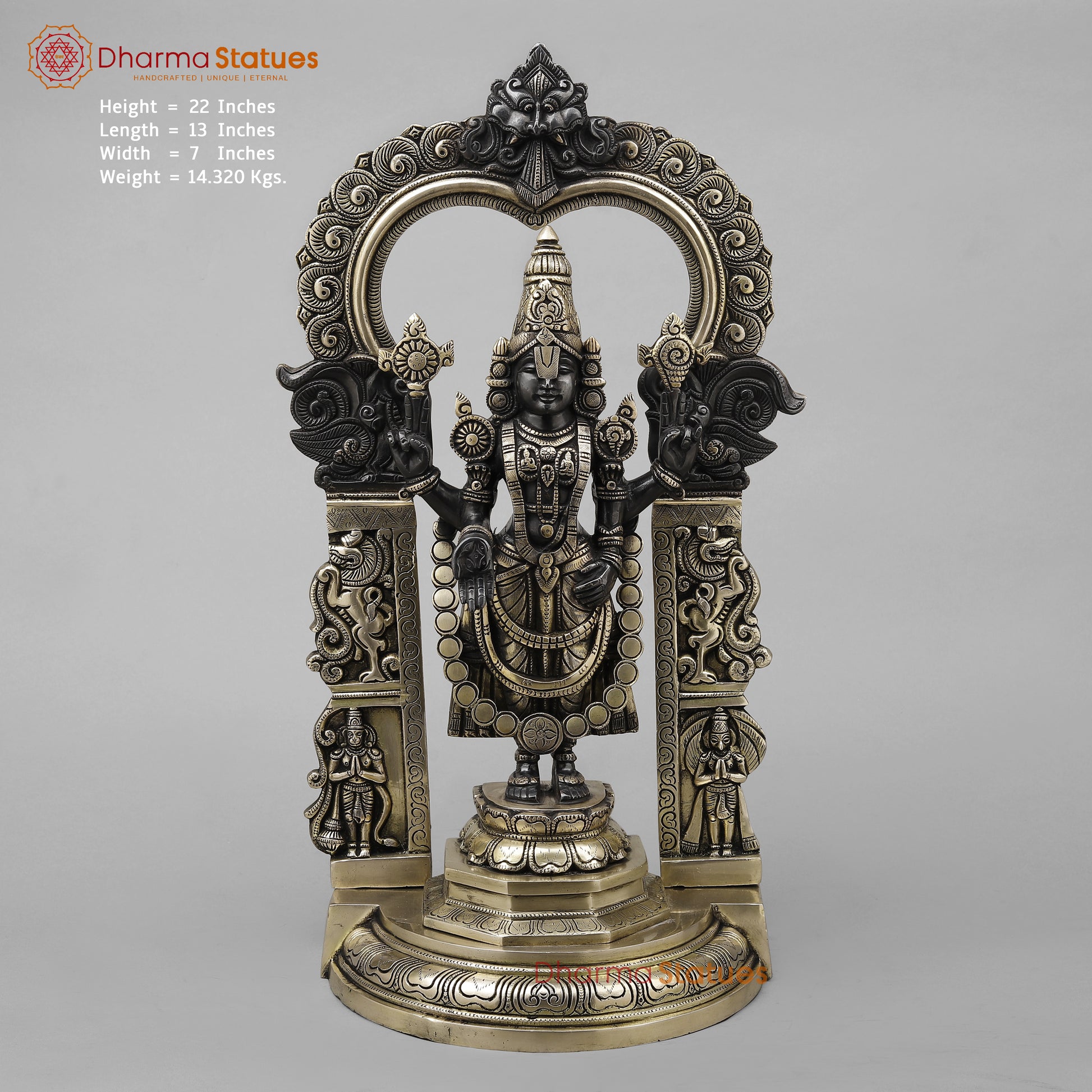 Brass Tirupati Balaji with Frame is a majestic representation of divine grace and devotion. This exquisite 22-inch statue, adorned with a striking black patina and golden finish, beautifully captures the sacred presence of Lord Venkateswara within a decorative frame, making it a perfect addition to your home, temple, or spiritual space.