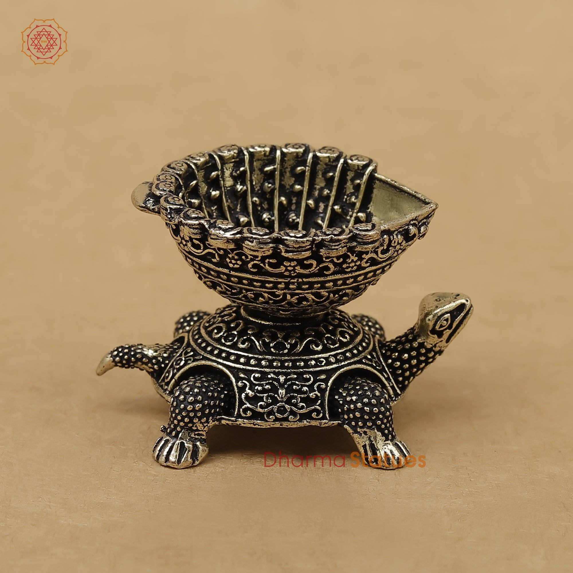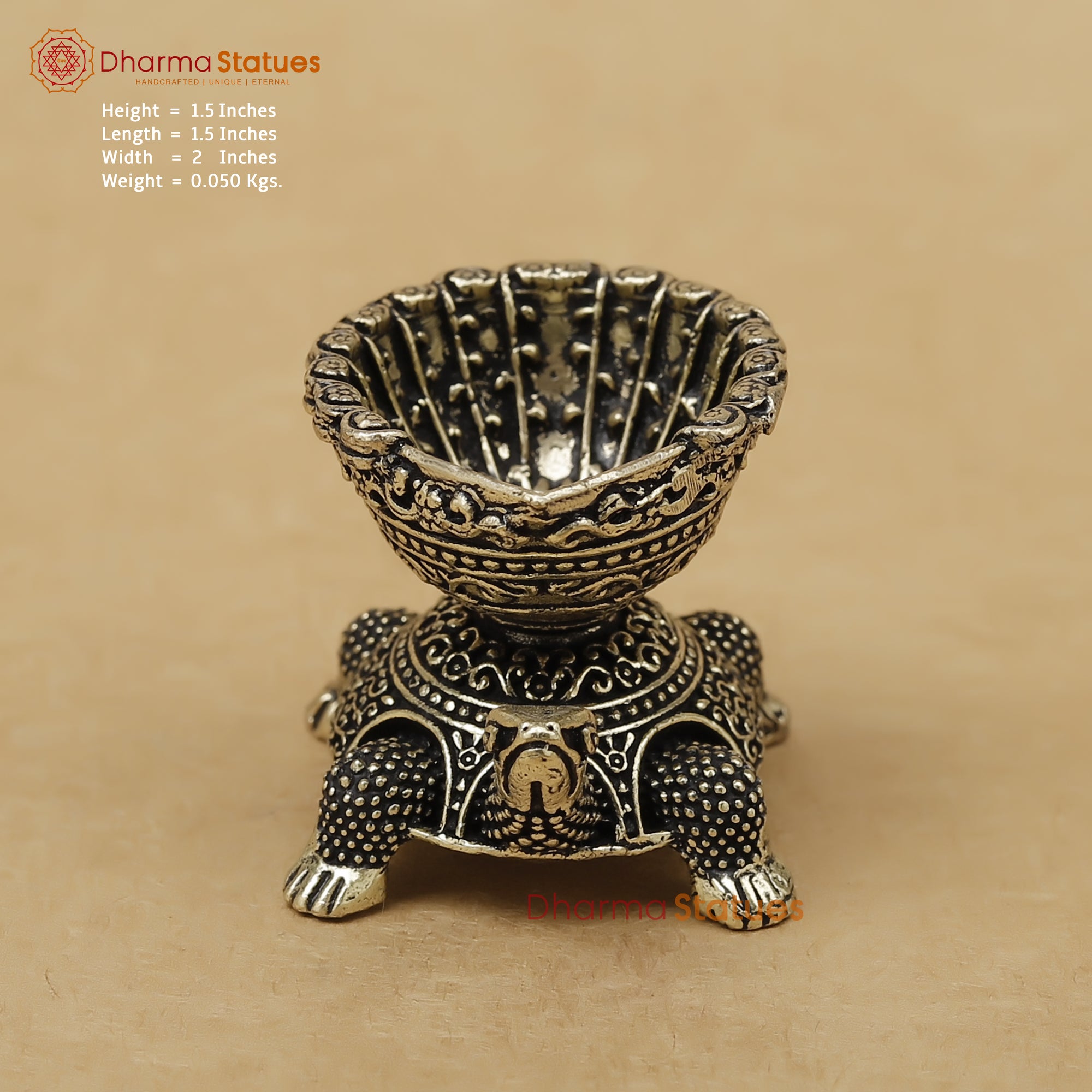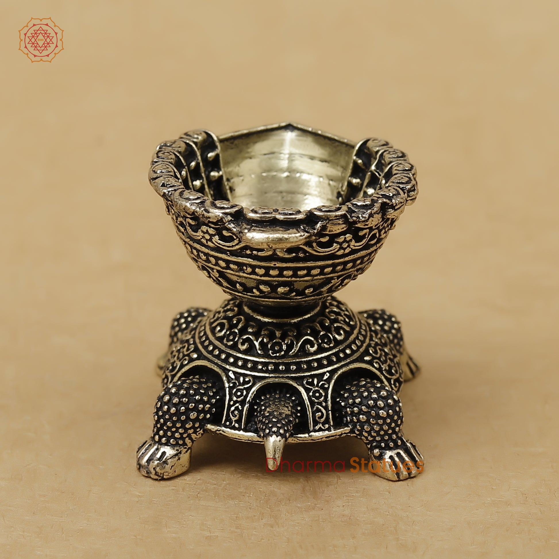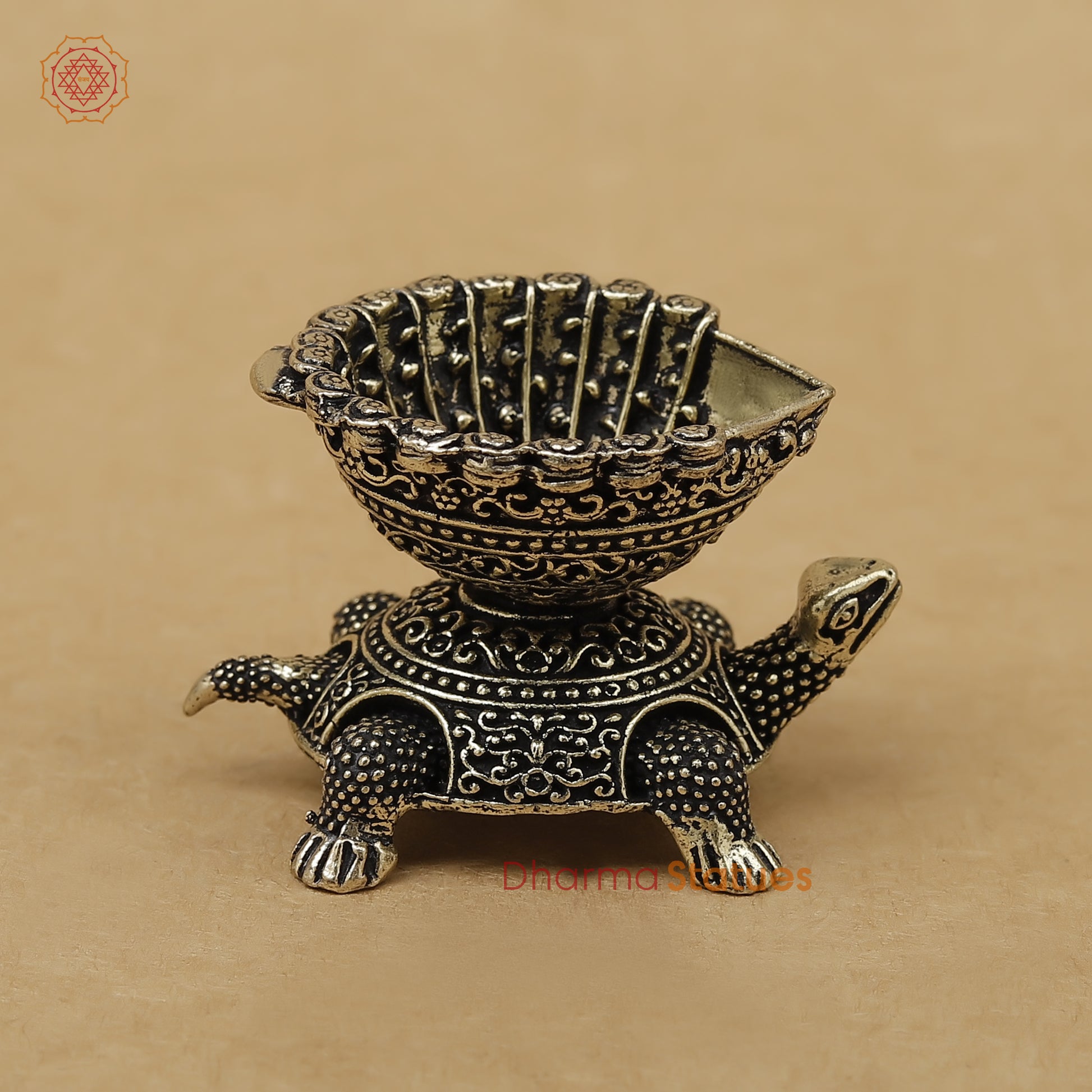 Bring auspicious energy and elegant craftsmanship into your home with this beautifully designed Tortoise Base Brass Diya. Featuring a traditional lotus-style diya bowl resting on a finely detailed tortoise base, this piece is perfect for daily puja, festive decor, or gifting.
