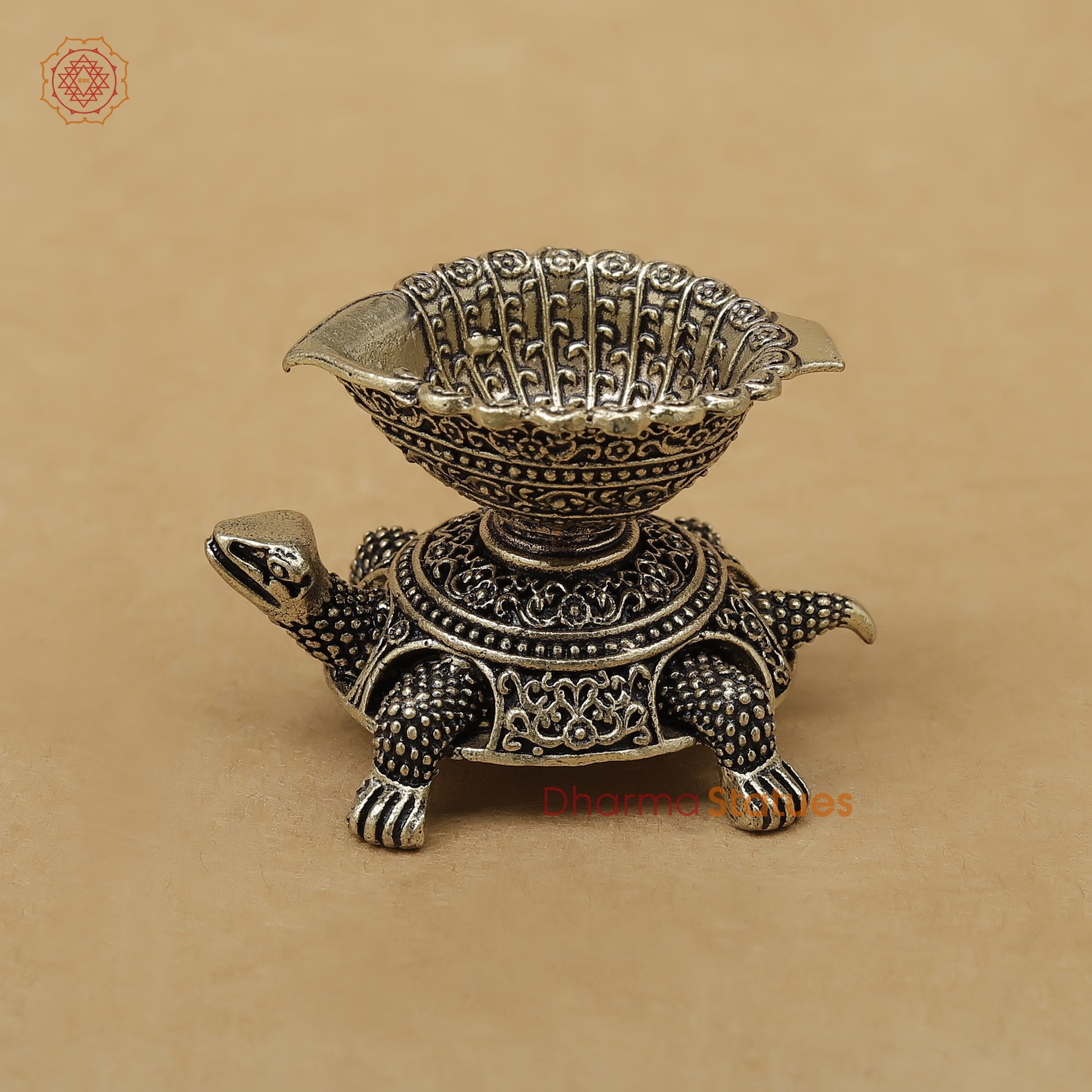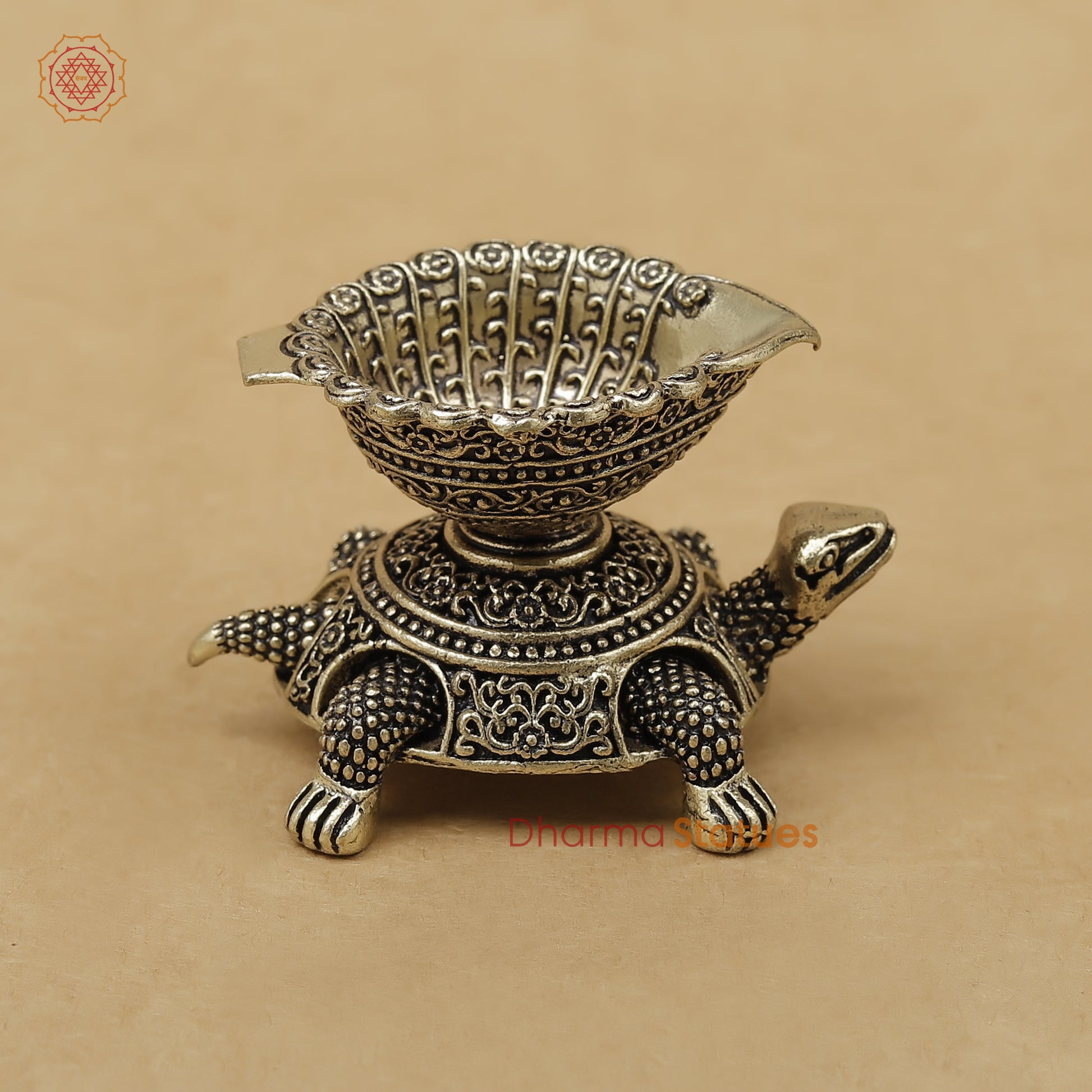 Bring auspicious energy and elegant craftsmanship into your home with this beautifully designed Tortoise Base Brass Diya. Featuring a traditional lotus-style diya bowl resting on a finely detailed tortoise base, this piece is perfect for daily puja, festive decor, or gifting.