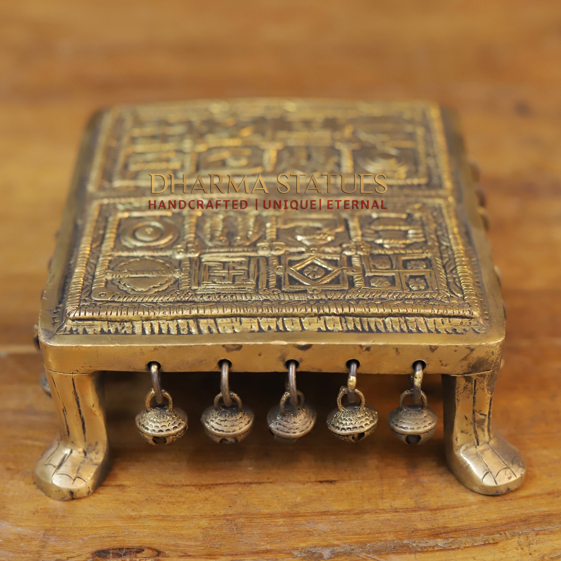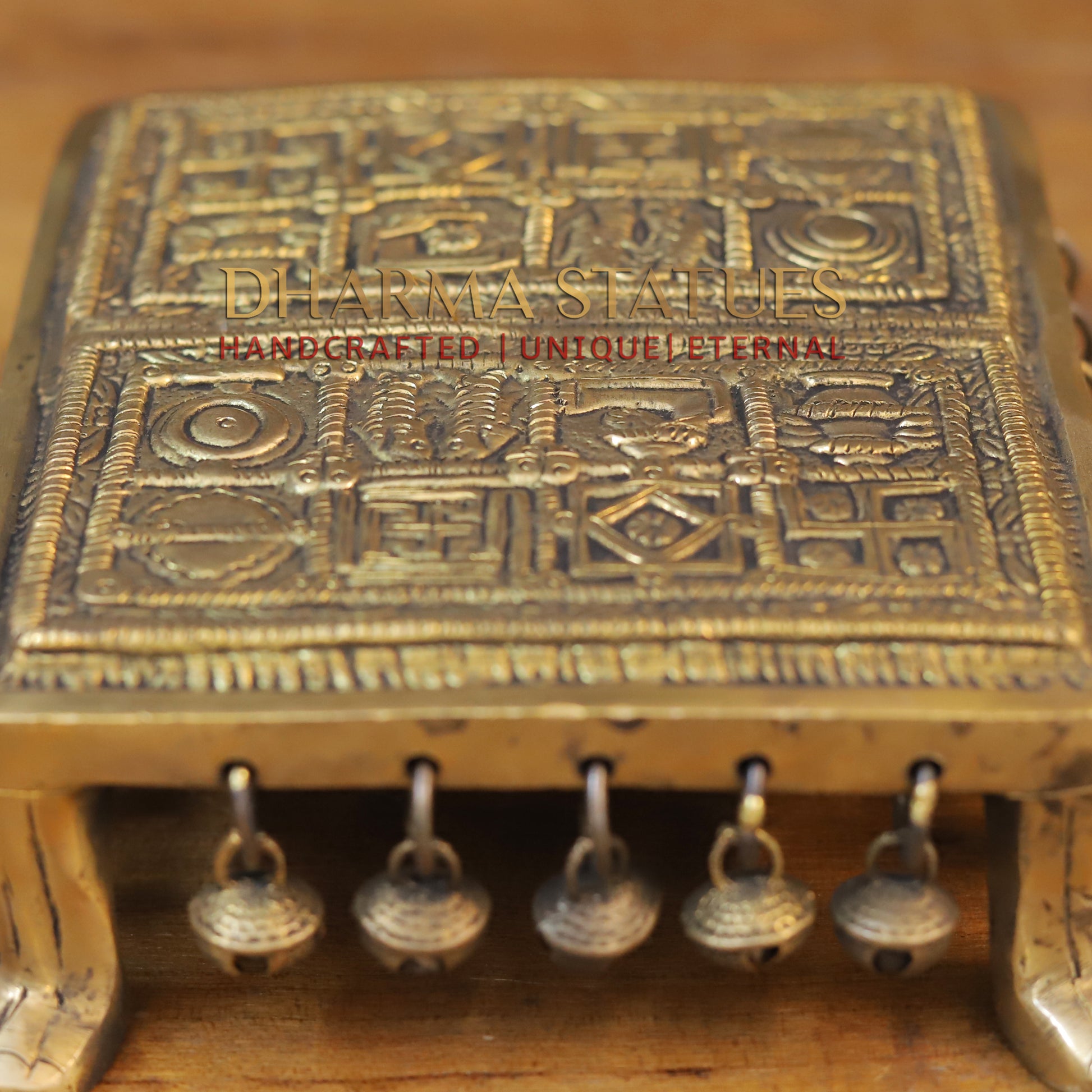 Crafted with precision and attention to detail, our Brass Traditional Pooja Chowki features a fine golden finish that adds elegance to any pooja room. The unique design includes hanging bells that add an enchanting touch to your prayers. Experience the benefits of a beautiful and functional addition to your spiritual practices. Best for Wedding Gift | Diwali Gift | Gift purpose | Temple | worshipping | Perfect for Home decoration | Office decoration.