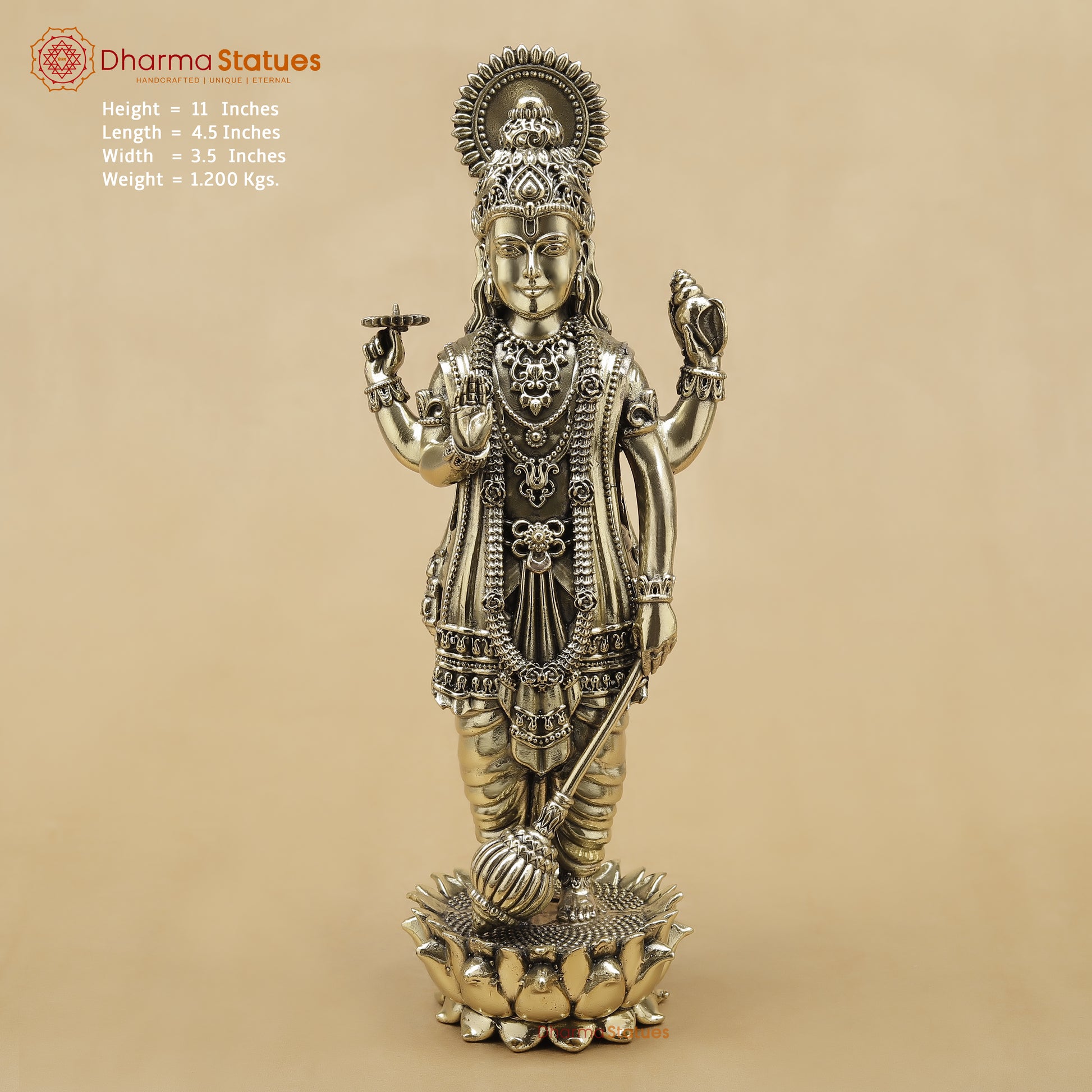 Invite divine protection, balance, and auspicious energy into your space with this beautifully crafted Brass Lord Vishnu Statue. Finely casted with intricate detailing, the idol features Vishnu standing gracefully on a lotus pedestal, holding the Shankha, Chakra, and Gada - symbolizing preservation and cosmic order. Its antique finish adds a touch of timeless elegance, perfect for any sacred or decorative setting.