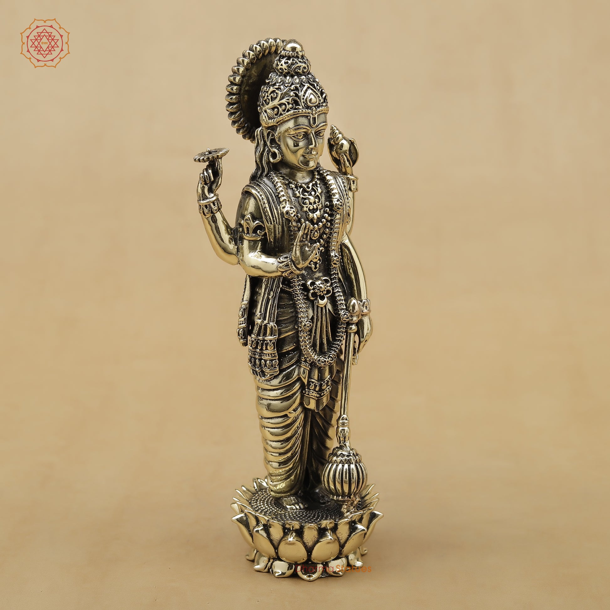 Bring divine protection, harmony, and spiritual balance into your home with this beautifully crafted Brass Lord Vishnu Statue. Finely casted with intricate detailing, the idol depicts Vishnu standing gracefully on a lotus pedestal, holding his traditional symbols—Chakra, Shankha, and Gada. The antique brass finish adds timeless elegance, making it ideal for home temples and sacred décor.