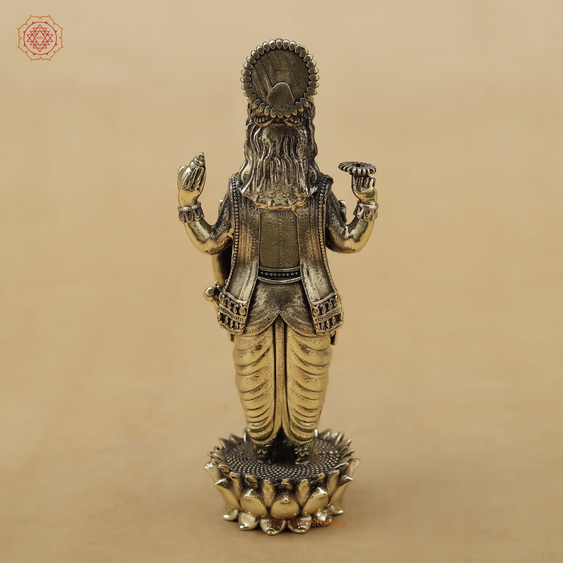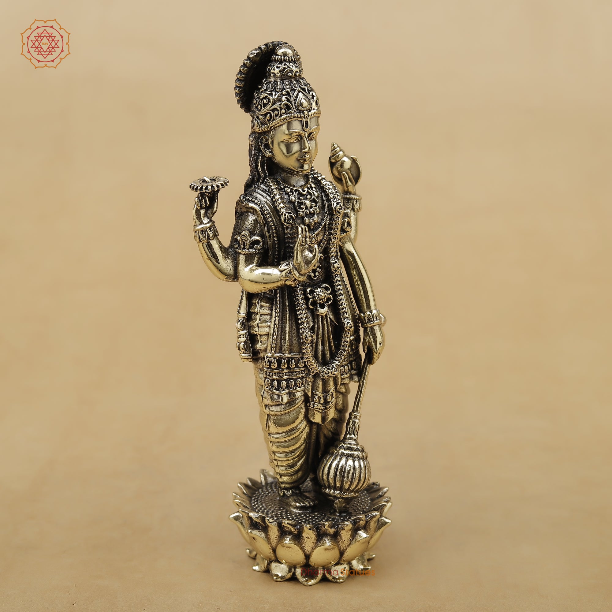 Invite divine protection, balance, and auspicious energy into your space with this beautifully crafted Brass Lord Vishnu Statue. Finely casted with intricate detailing, the idol features Vishnu standing gracefully on a lotus pedestal, holding the Shankha, Chakra, and Gada —symbolizing preservation and cosmic order. Its antique finish adds a touch of timeless elegance, perfect for any sacred or decorative setting.