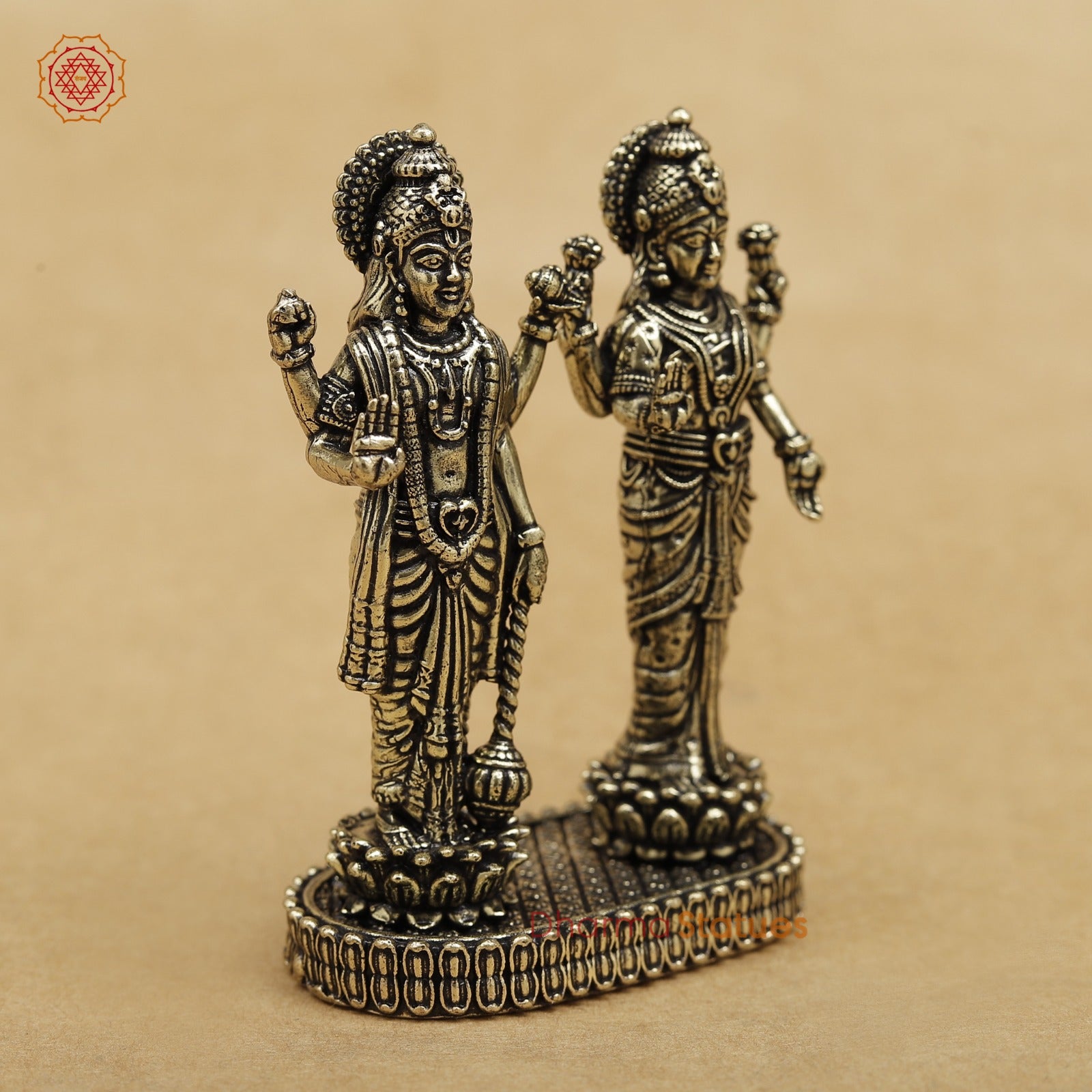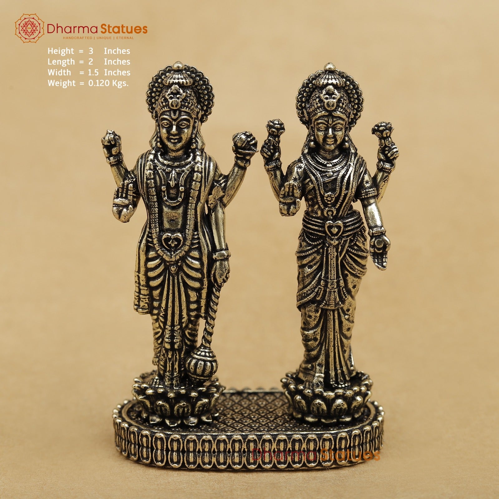 A finely crafted brass statue of Lord Vishnu and Goddess Lakshmi standing together, symbolizing prosperity, protection, and harmony. With intricate detailing and a compact design, it is perfect for home temples or spiritual décor.
