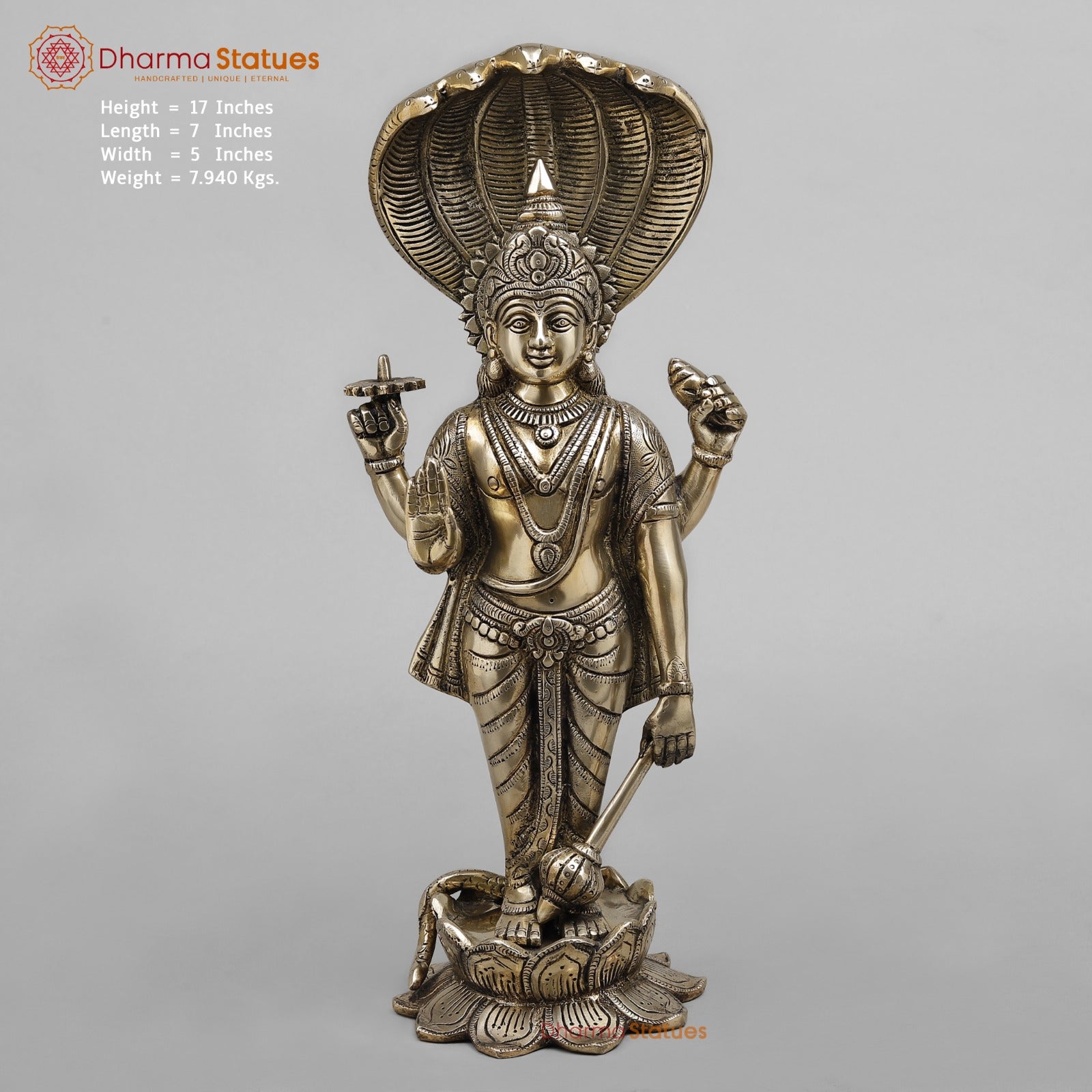 Brass Vishnu with Serpent, Smooth finish 17”