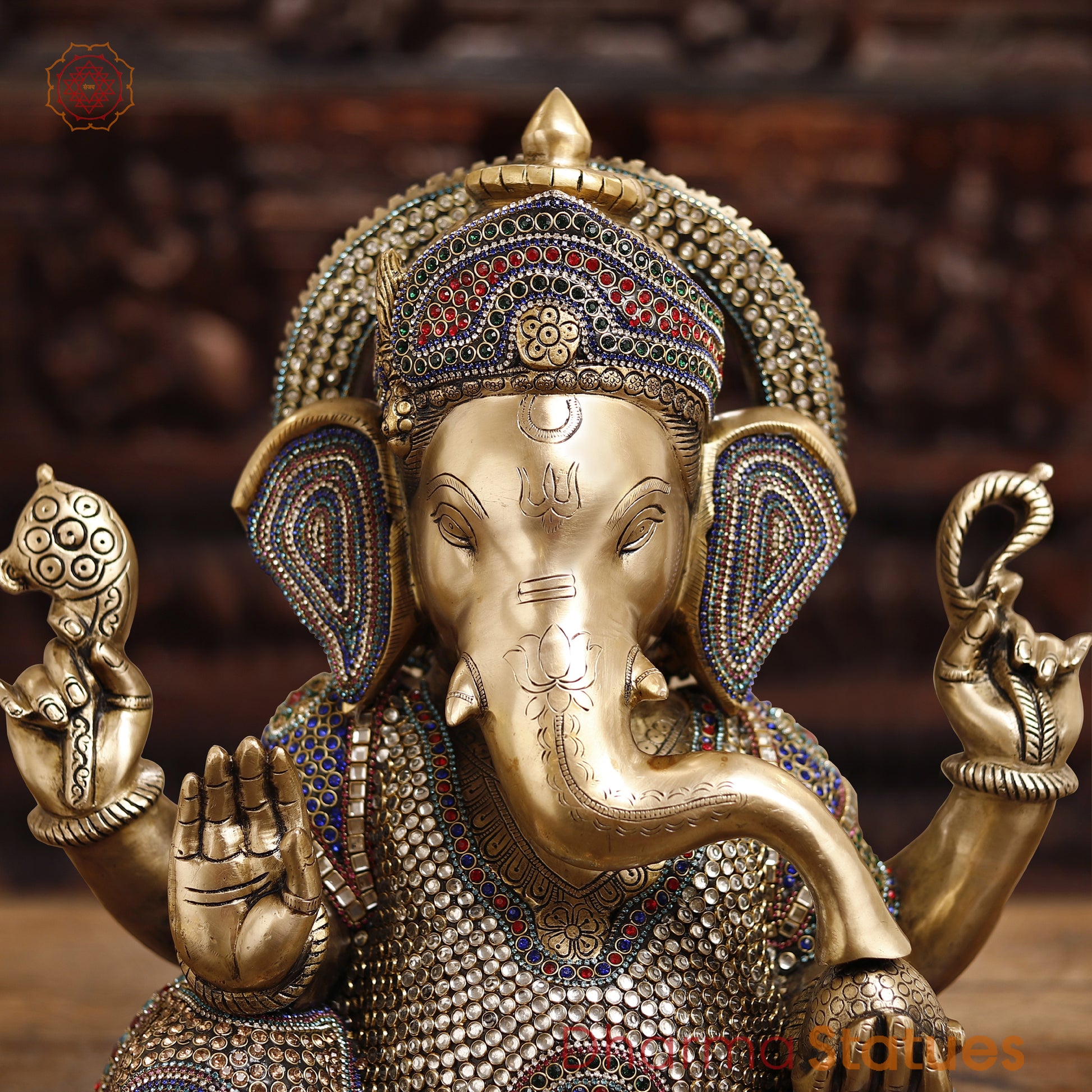 Brass Lord Ganesh Statue, Sitting in a Blessing Posture, Golden & Stone work 22"