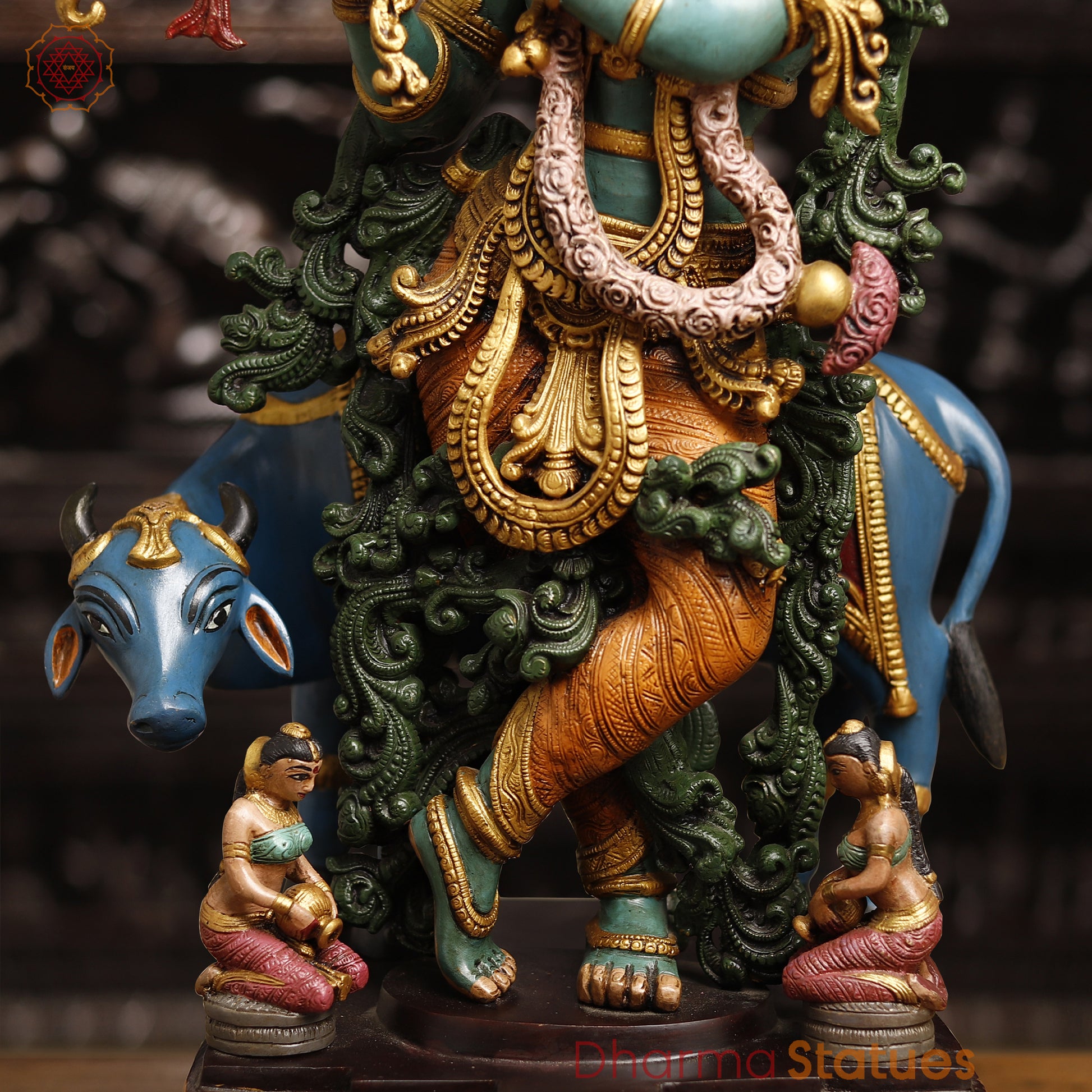 Brass Lord Krishna Statue With Cow, Playing Flute, Colorful Finish, 28.5"