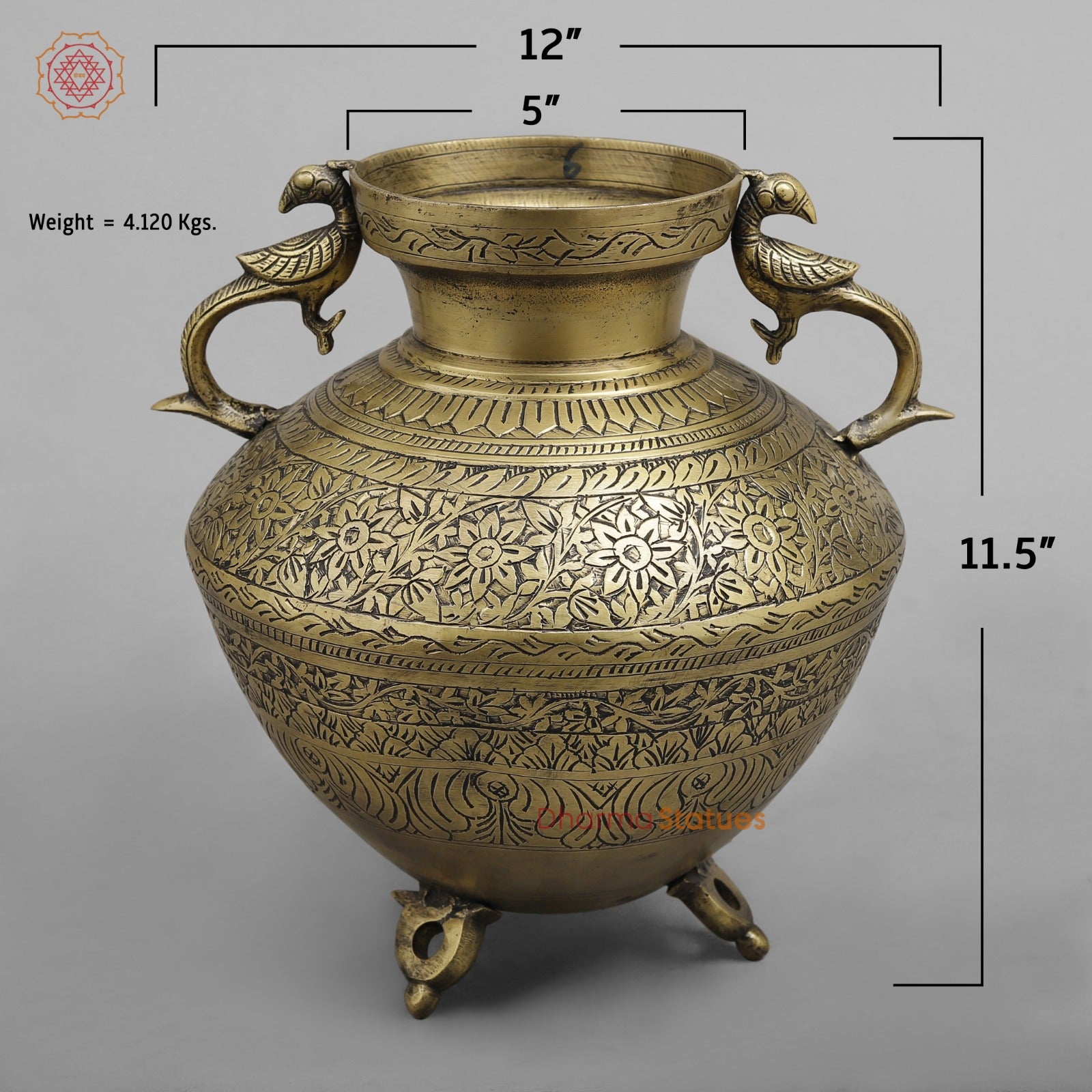 Elevate your décor with this striking vintage brass pot, showcasing fine hand-engraved floral and vine motifs that reflect traditional craftsmanship. The tall, rounded silhouette is accented by sculpted bird-shaped handles and supported by a sturdy three-legged base, giving the piece both elegance and stability.
