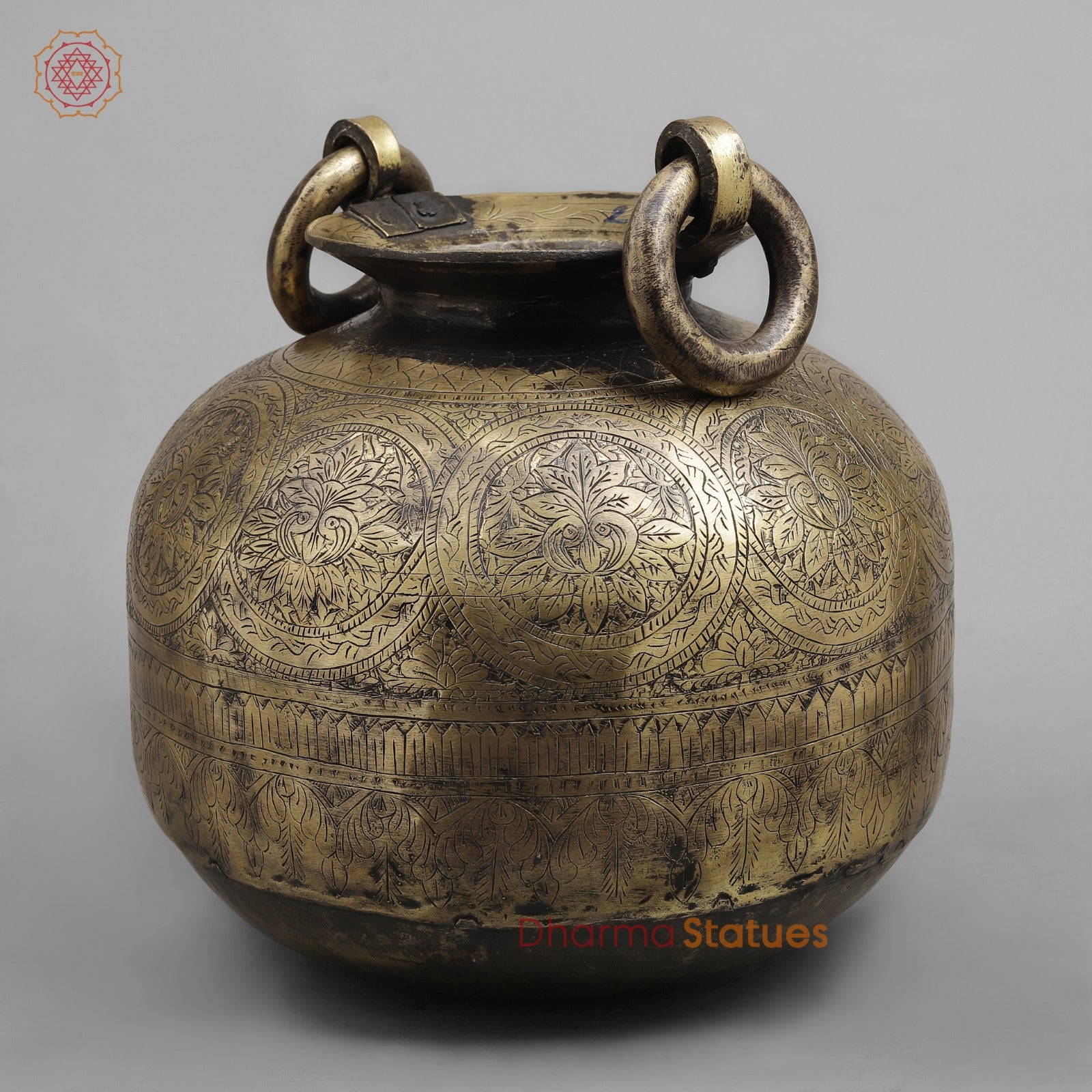 This striking vintage brass pot is a masterfully handcrafted piece that showcases exquisite traditional engraving. The rounded body is richly adorned with symmetrical floral medallions and intricate border patterns, all hand-etched with remarkable precision. Thick ring-style handles on either side add a bold, utilitarian charm while enhancing its antique appeal.