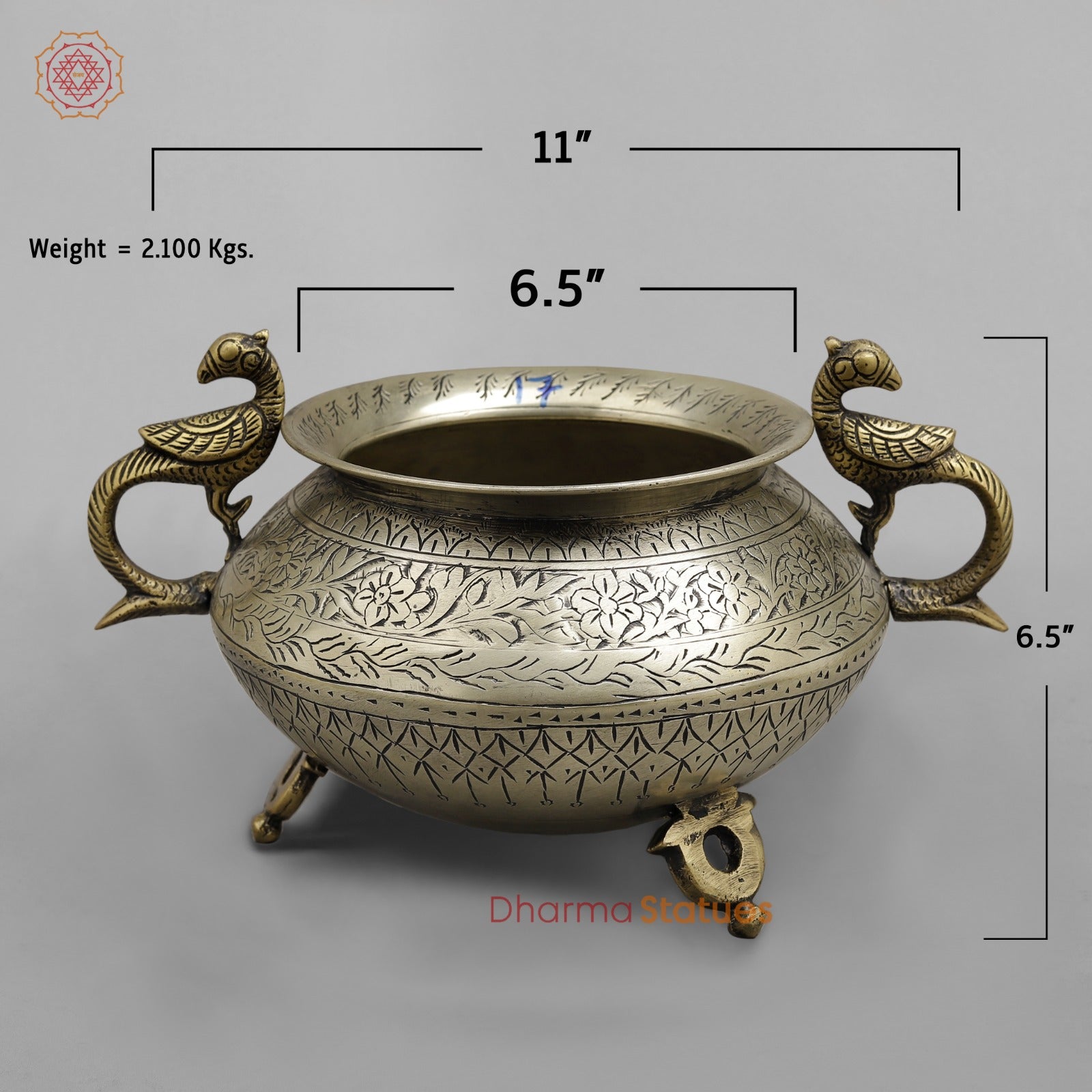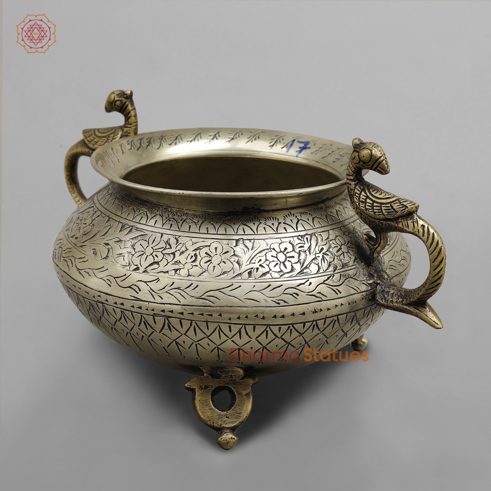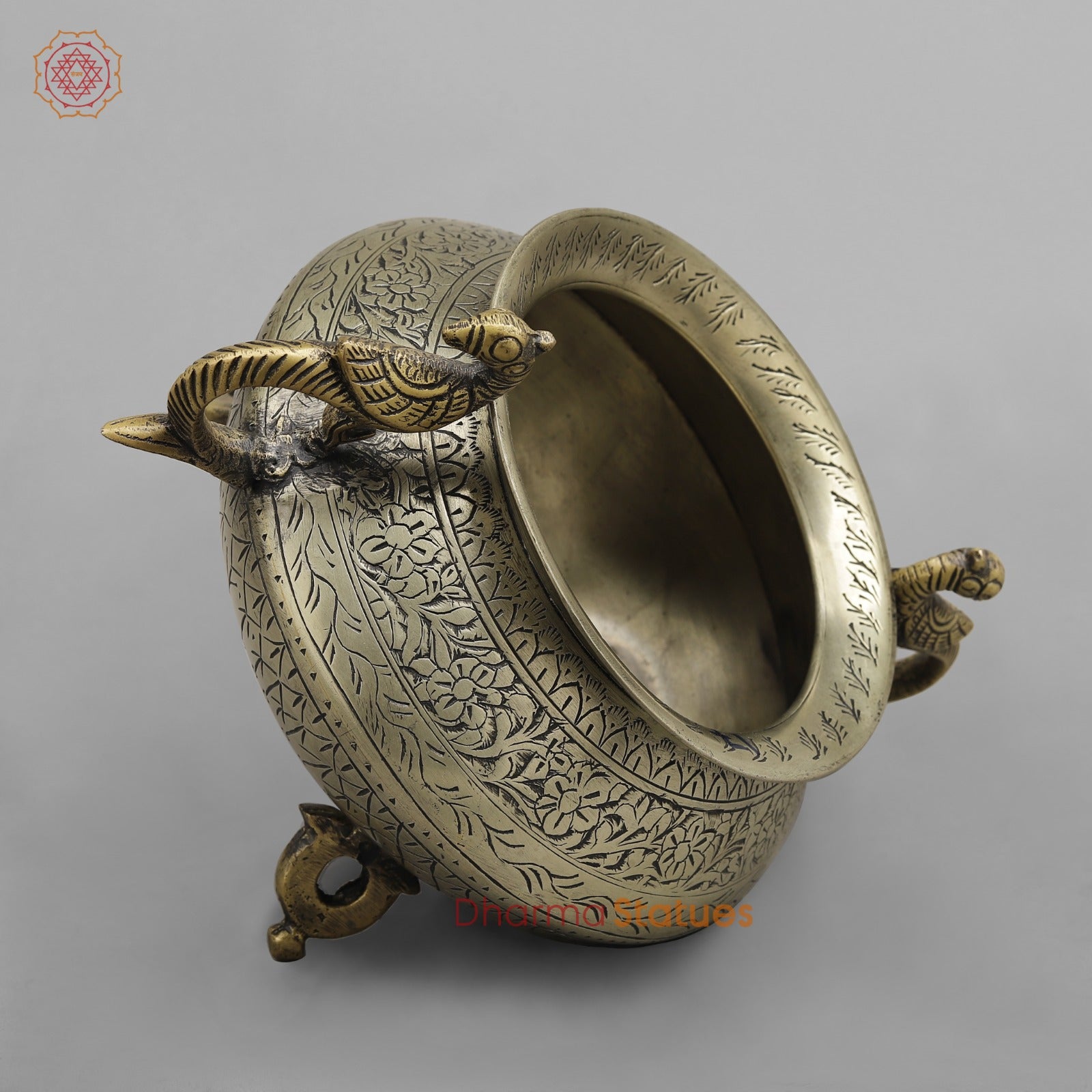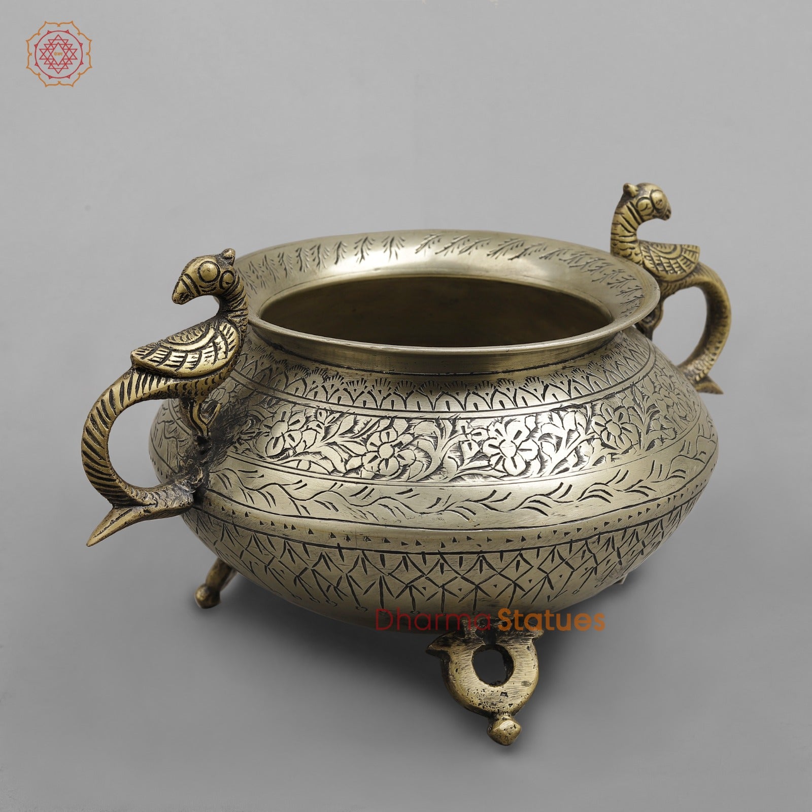 Elevate your décor with this elegant vintage brass pot, a fine example of traditional Indian metal artistry. Handcrafted from solid brass, the pot features detailed hand-engraved floral and geometric patterns that wrap beautifully around its rounded body. The peacock-shaped handles on both sides add a touch of grace and symbolism, while the antique brass finish enhances its timeless appeal.