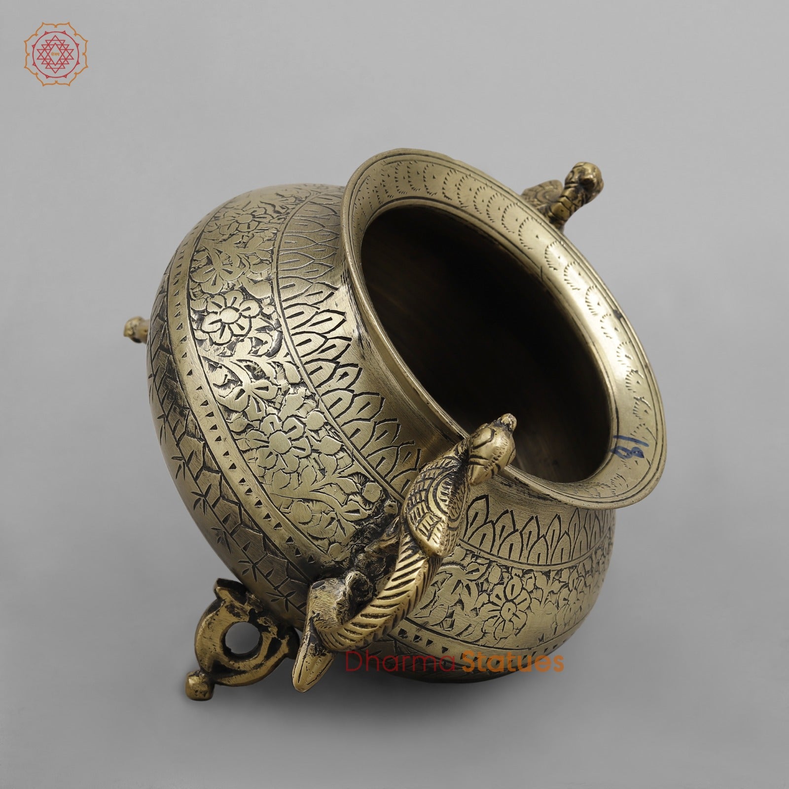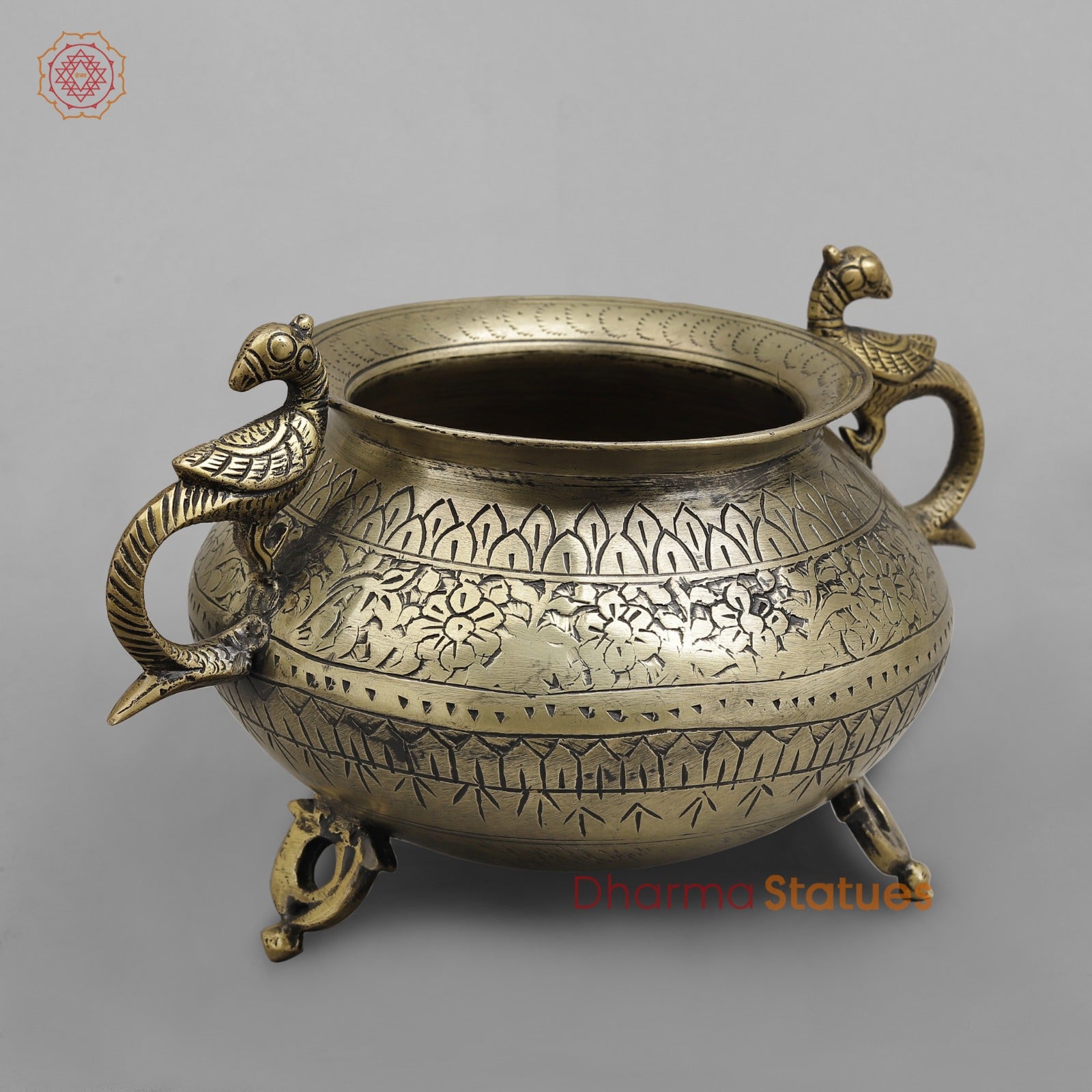 Elevate your décor with this elegant vintage brass pot, a fine example of traditional Indian metal artistry. Handcrafted from solid brass, the pot features detailed hand-engraved floral and geometric patterns that wrap beautifully around its rounded body. The peacock-shaped handles on both sides add a touch of grace and symbolism, while the antique brass finish enhances its timeless appeal.