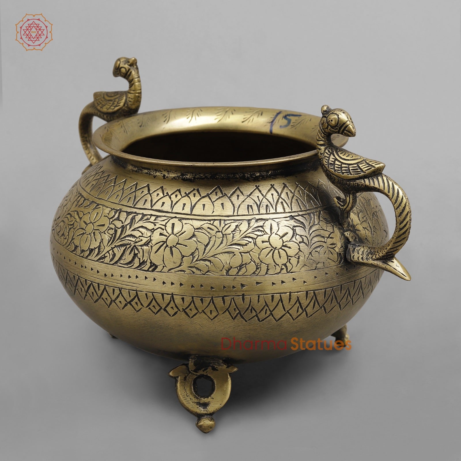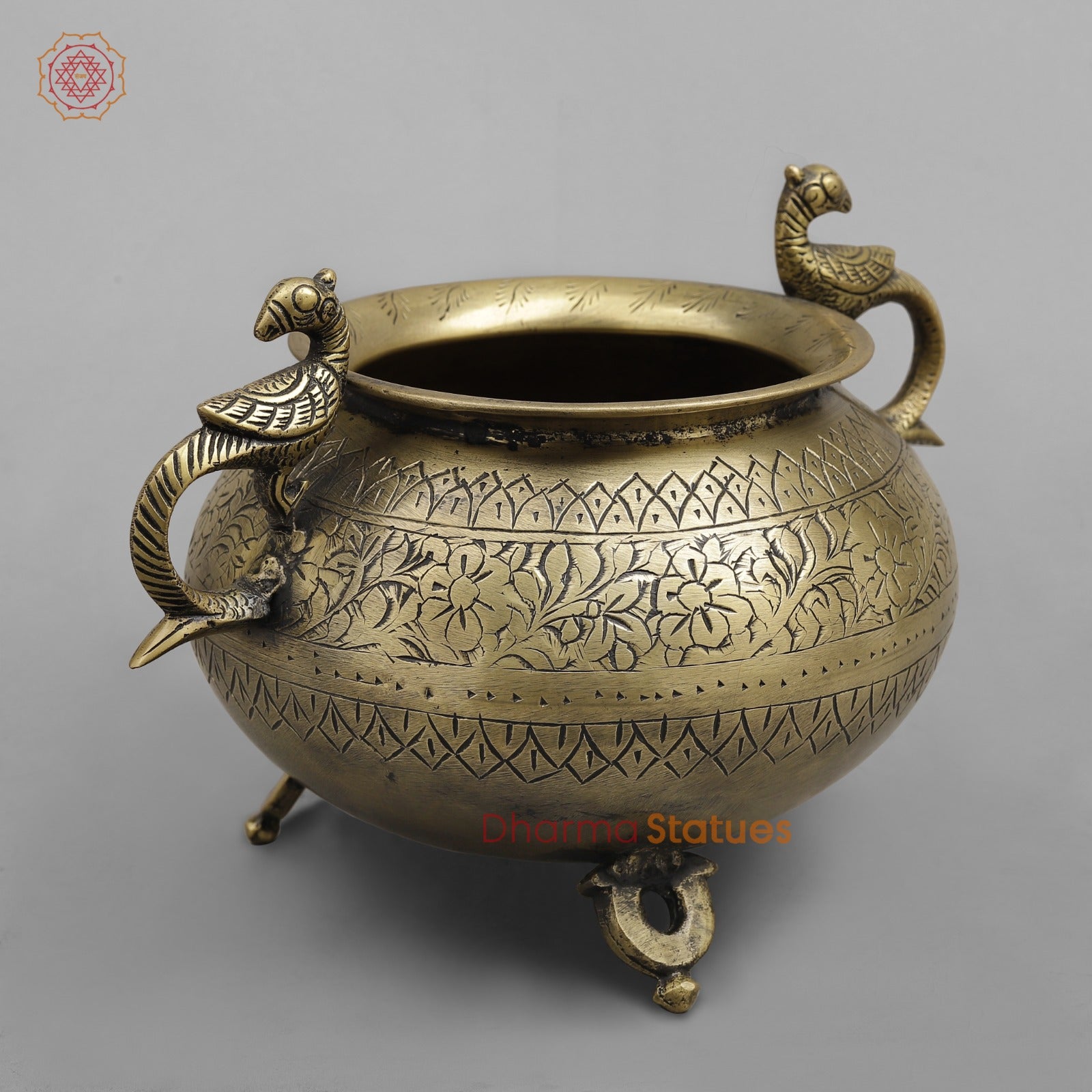 Add a touch of traditional charm to your décor with this finely crafted vintage brass pot. Showcasing detailed hand-engraved floral and geometric patterns, this pot reflects classic Indian craftsmanship. The elegant peacock-shaped handles on either side enhance its aesthetic appeal, while the antique brass finish gives it a rich, timeless character.